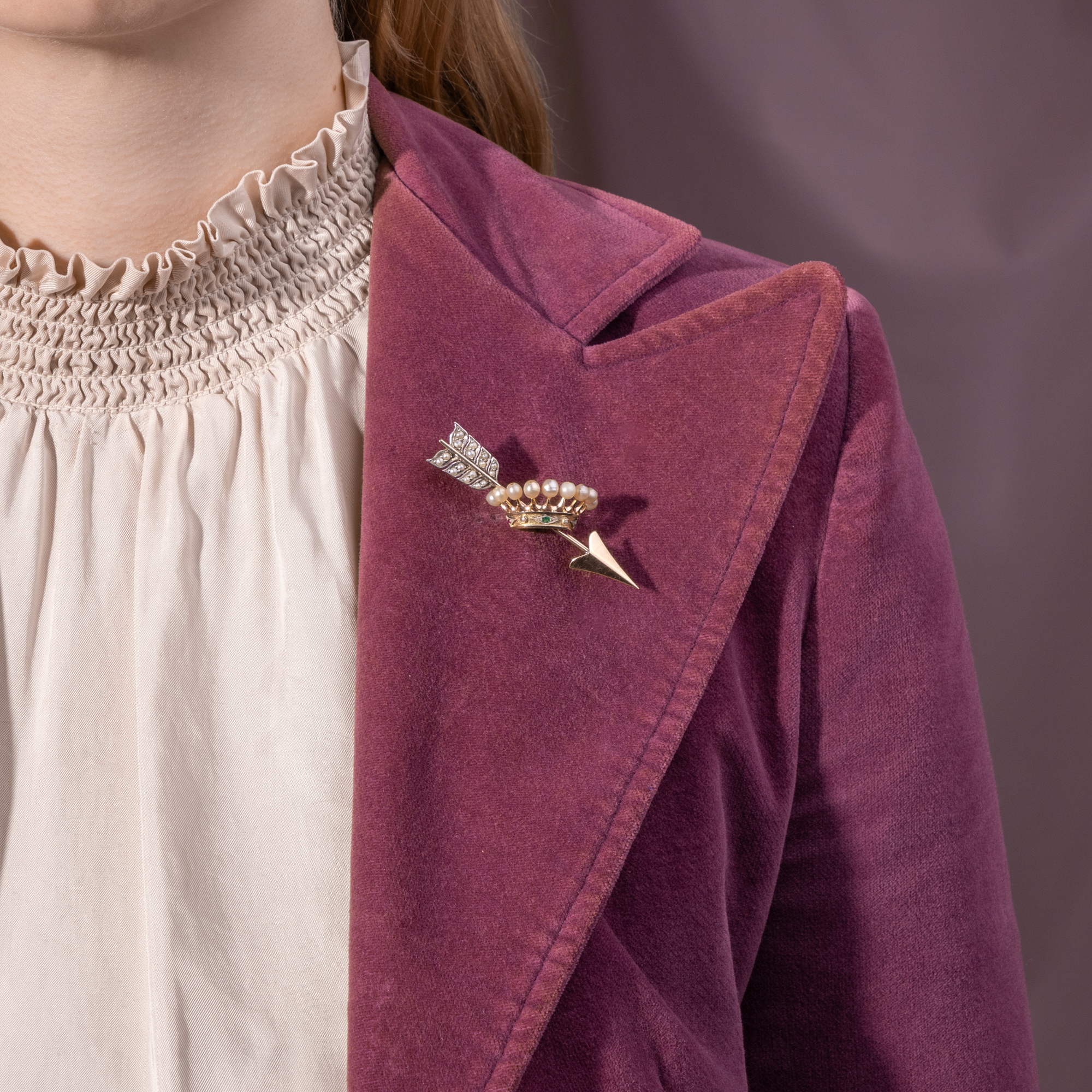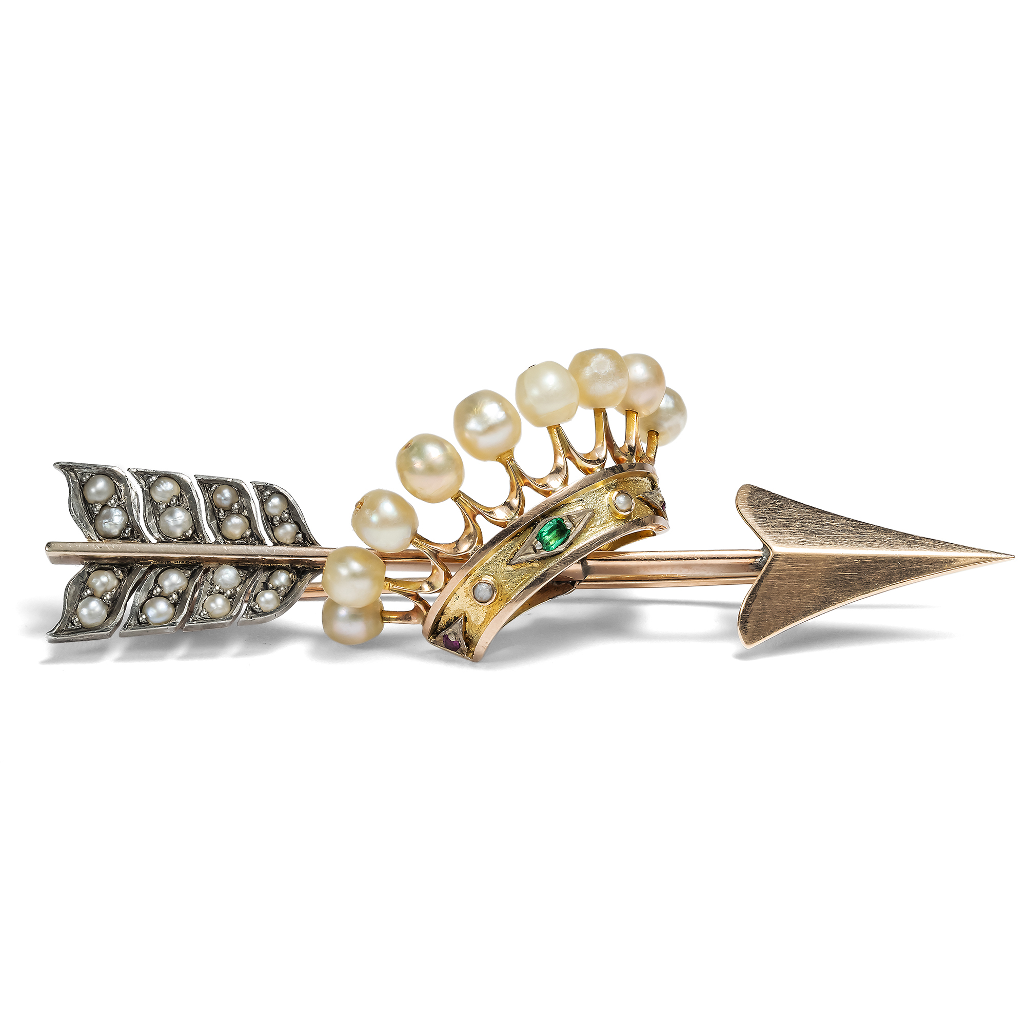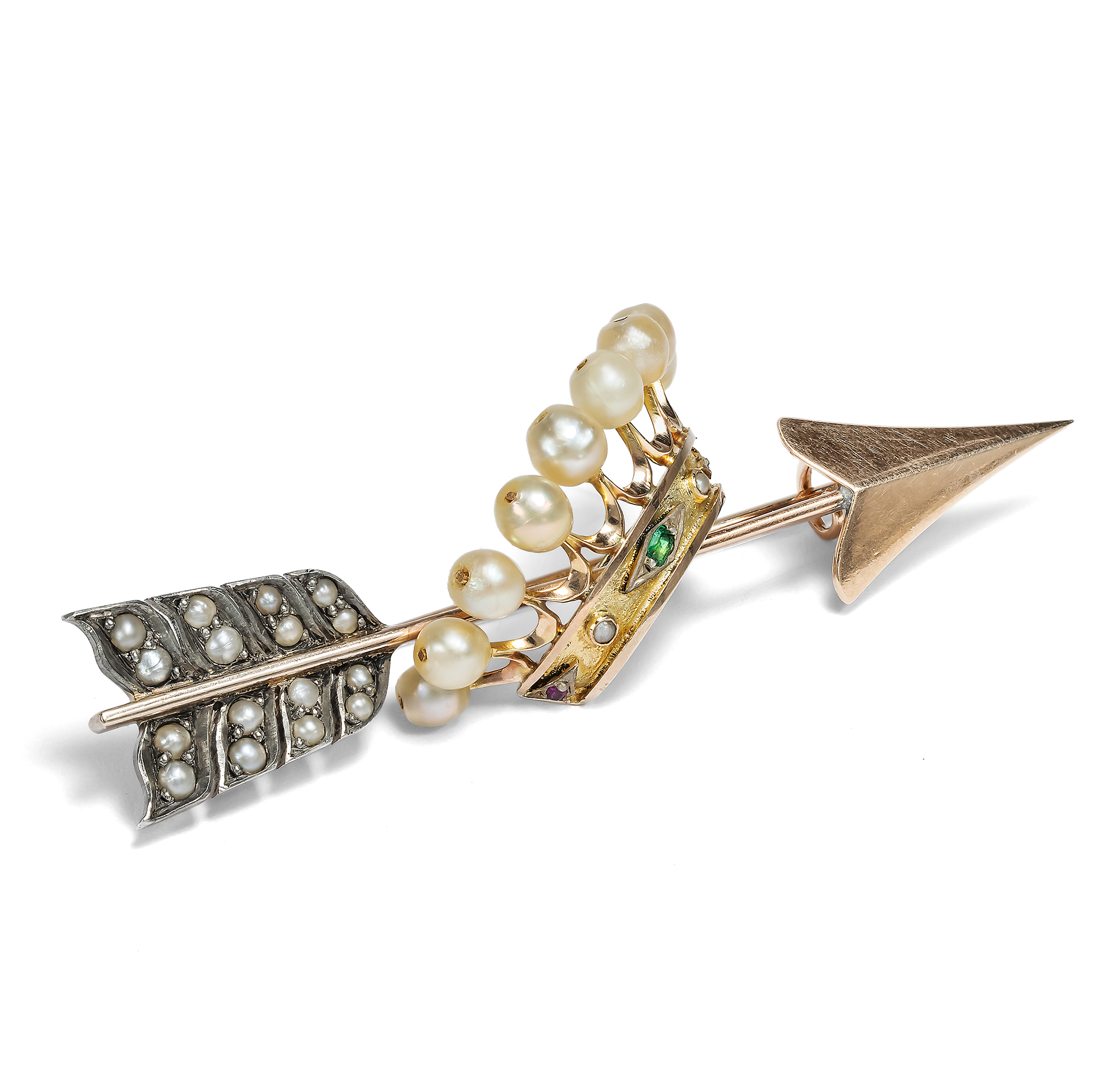 This brooch from the last years of the 19th century is in the form of a crown made of natural pearls, rubies and a small emerald in high-carat gold. Nine large pearls adorn the prongs of the crown, thus assigning it to the rank of an earl. And yet there is something unusual here: A large, gleaming arrow with a golden tip seems to pierce the crown, as if the god of love Cupid himself had hit his target. Perhaps it was a gift to a countess who announced her conquest with a wink? The small arrow through the crown could tell the story of a love affair, a coded symbol that does not immediately reveal its meaning but remains unmistakable. The splendid colors, the fine workmanship and the luxurious materials suggest that the piece was created around 1890. We discovered it in the south of England. A similar but smaller piece can also be found in the literature in Walter Grasser and Franz Hemmerle: Kostbare Krawattennadeln, Munich 1999, p. 41.