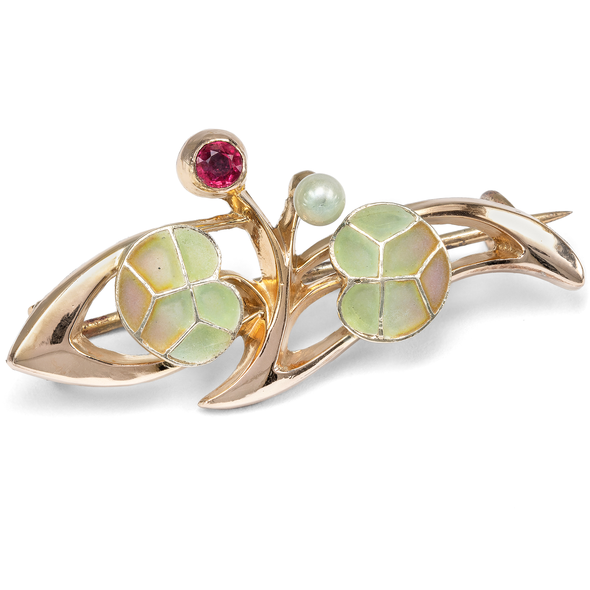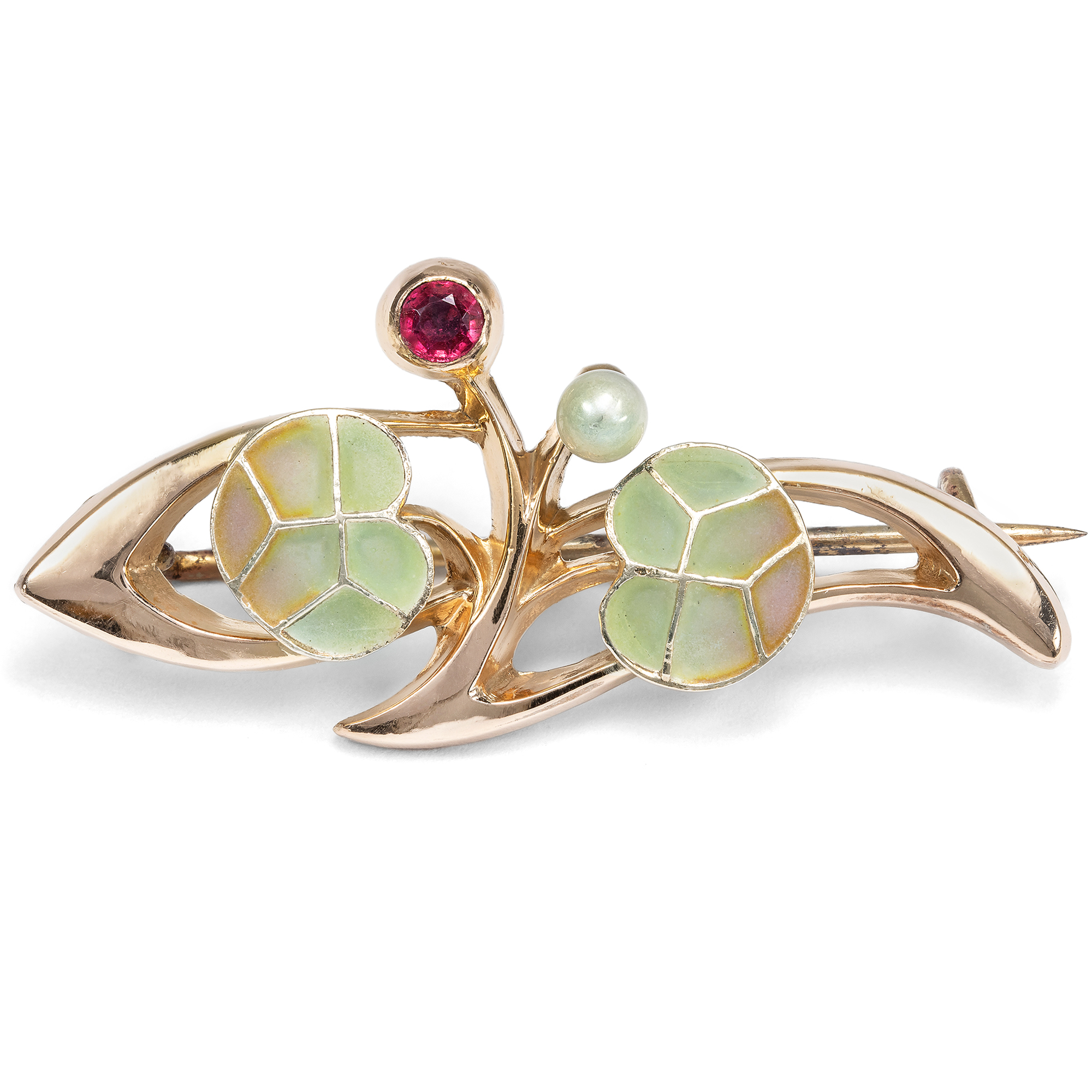 In the course of the 19th century, a new group of buyers came to the attention of jewellery makers with the financially and politically growing bourgeoisie. Pieces of jewellery were no longer made solely from precious gold and gemstones; cheaper materials were also used, allowing decorative designs to be created in every fashionable style. The center of this democratization of jewellery in Germany was the city of Pforzheim. Here, in southern Germany, hundreds of large and small jewellery companies supplied the whole of Europe with jewellery in the latest designs, but made from cheaper materials than the leading jewellers from Paris. This brooch is one such "costume jewellery" from Pforzheim in the Art Nouveau style. At first glance, the floral design appears to be made of gold. However, it is actually made of so-called "gold doublé", also known as rolled gold: a thin layer of gold was rolled onto a base metal under high pressure. This special type of gilding is therefore particularly thick and durable and can even be engraved. The rolled gold is combined here with a red glass stone and a wax pearl, which appear like delicious fruit from the sweeping branch. The leaves are decorated with elaborate plique-à-jour enamel, which was particularly popular with Art Nouveau artists. Our brooch is not signed, but it was almost certainly made in Pforzheim. Further information on Pforzheim jewellery in French and German Art Nouveau forms can be found in the wonderfully illustrated volume by Fritz Falk: Jugendstil-Schmuck aus Pforzheim, Stuttgart 2008.