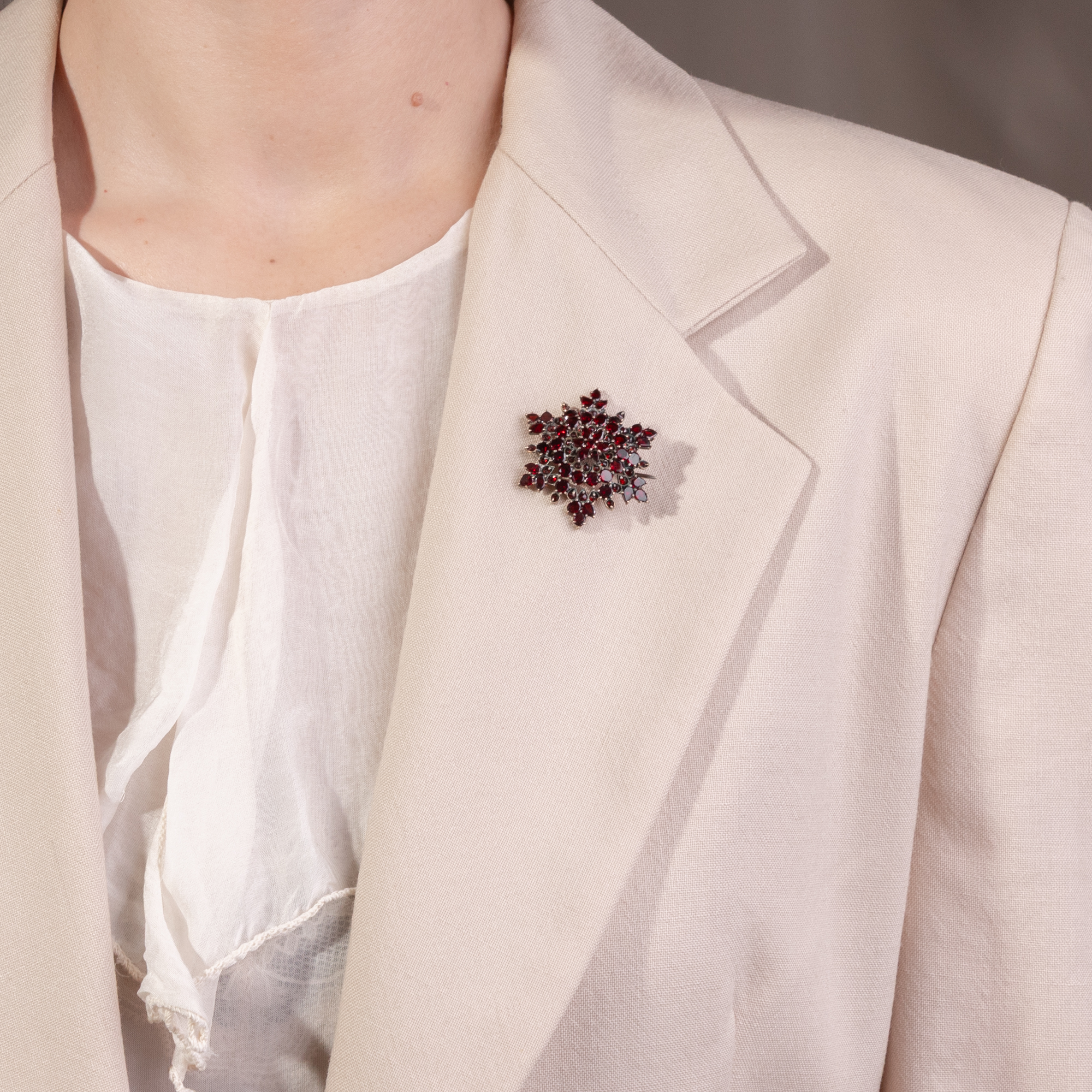 Some time ago, we were lucky enough to be able to purchase the estate of a jeweler, which contained numerous, apparently unworn pieces of jewellery from the c. 1900s. There were numerous brooches with garnets, bracelets and also several pairs of earrings that had survived the generations together as if in a time capsule. This brooch comes from this collection. It is in the shape of a star with dark red pyrope garnets arranged in three layers. Large and small stones in sparkling table cut and rose cut reflect the light and demonstrate the great skill of the Bohemian cutters. They are set in gold-plated tombac, as was the fashion of the time. Created in the c. 1900s and therefore already more than 120 years old, the little star still attracts attention today.