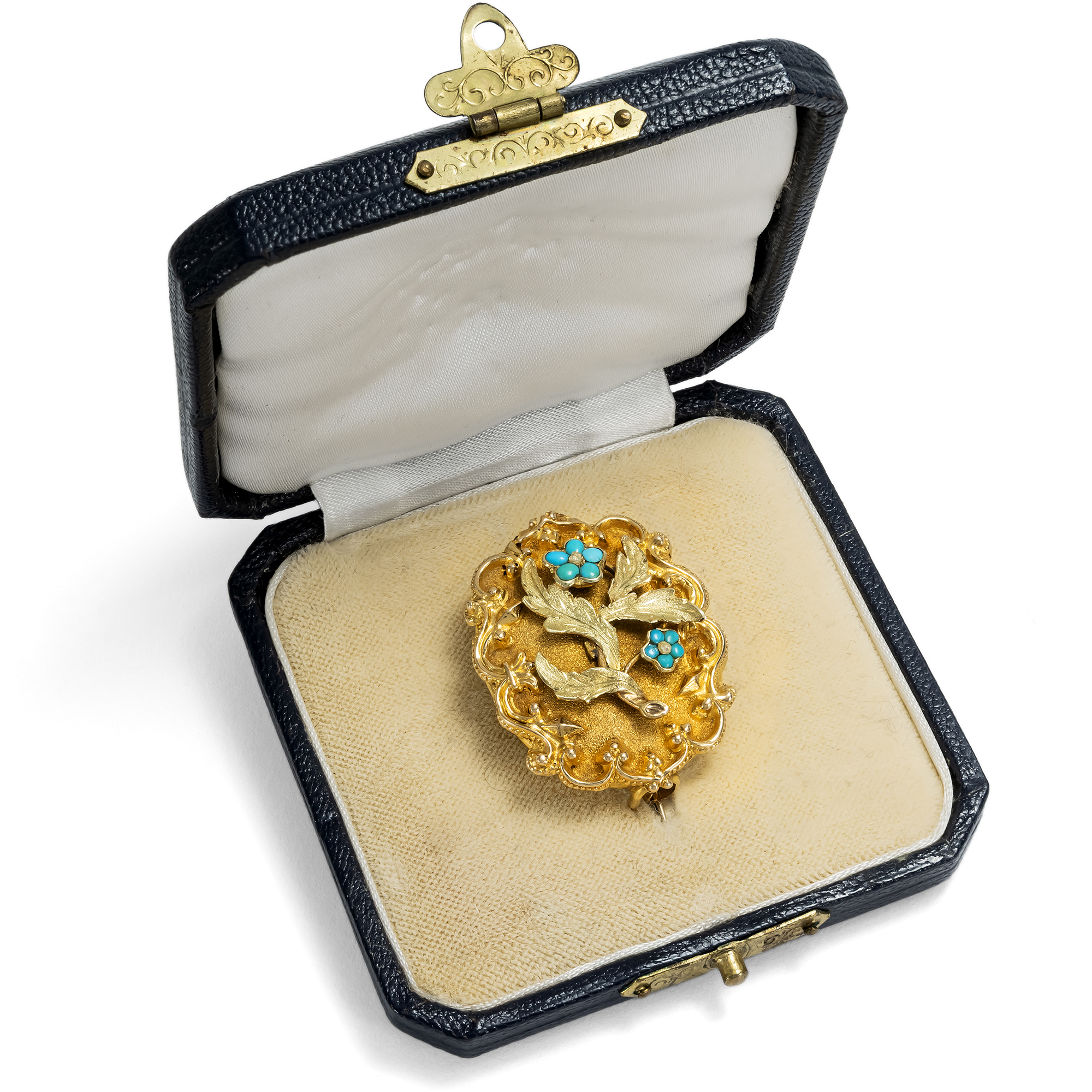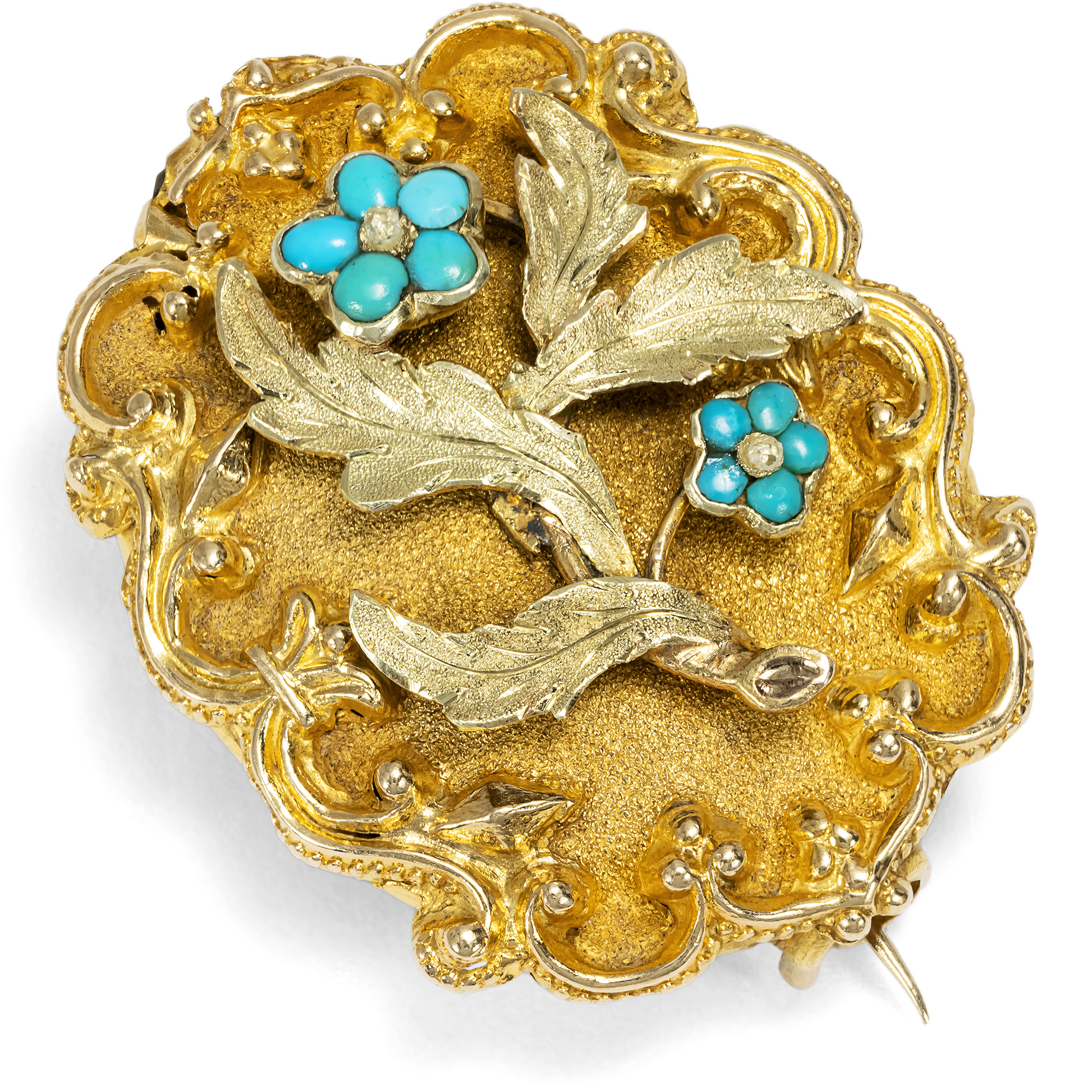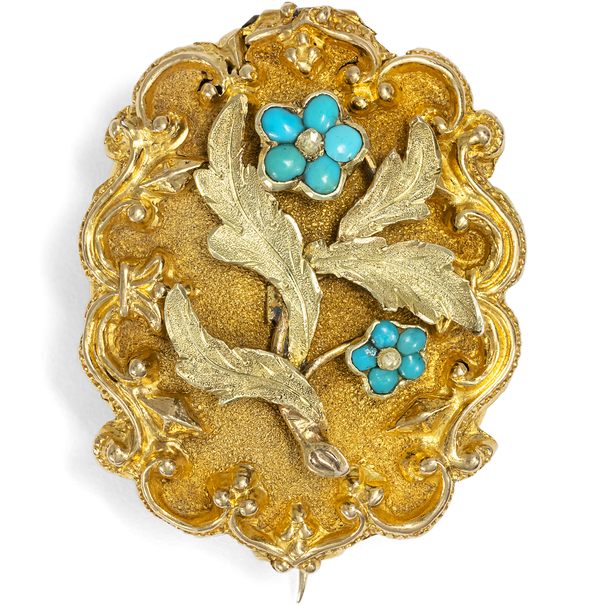 In earlier times, jewellery not only had a decorative function, but the choice of pieces of jewellery could also convey a message. This brooch from the 1840s is a fine example of this, as it represents an old symbol of friendship and affection. Crafted from high-carat gold, the front of the brooch is decorated with a forget-me-not: its two flowers are each made up of five sky-blue Persian turquoises, each grouped around a small diamond rose. The forget-me-not has a name with the same meaning in many languages. On the one hand, it is a symbol of tender remembrance. On the other hand, it was also intended to symbolize true love, a meaning attributed to the flower by Anna Burke in her Dictionary of the Language of Flowers, published in 1856. Pieces of jewellery such as this specimen, created in the particularly sentimental early Victorian era, were understood as a pledge of affection that would ensure the lasting memory of the giver. Sweeping leaf tendrils and floral ornaments frame the curved outer line of the brooch. There is also a sentimental secret on the back: covered by a glass plate, there is an inlay of artfully woven hair, with which the brooch was intended to commemorate a very specific person (see "Find out more"). The brooch is therefore not only decorative, but also a collector's item with touching symbolism.