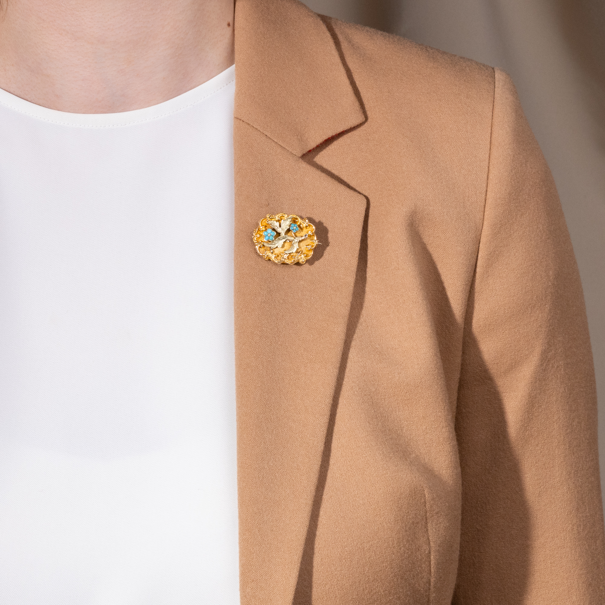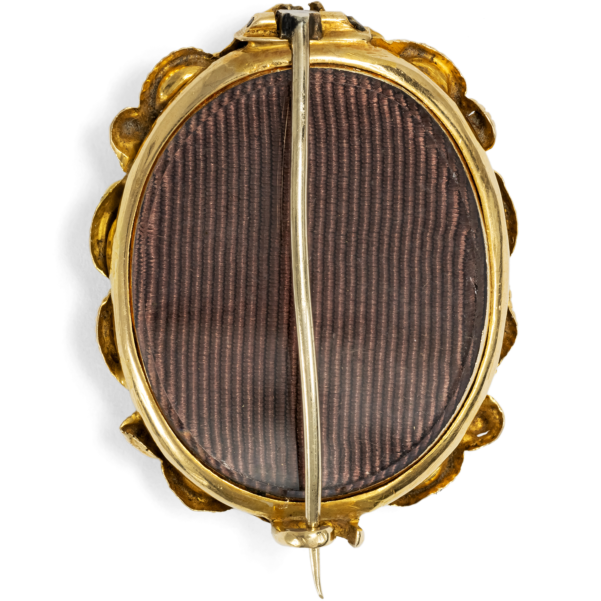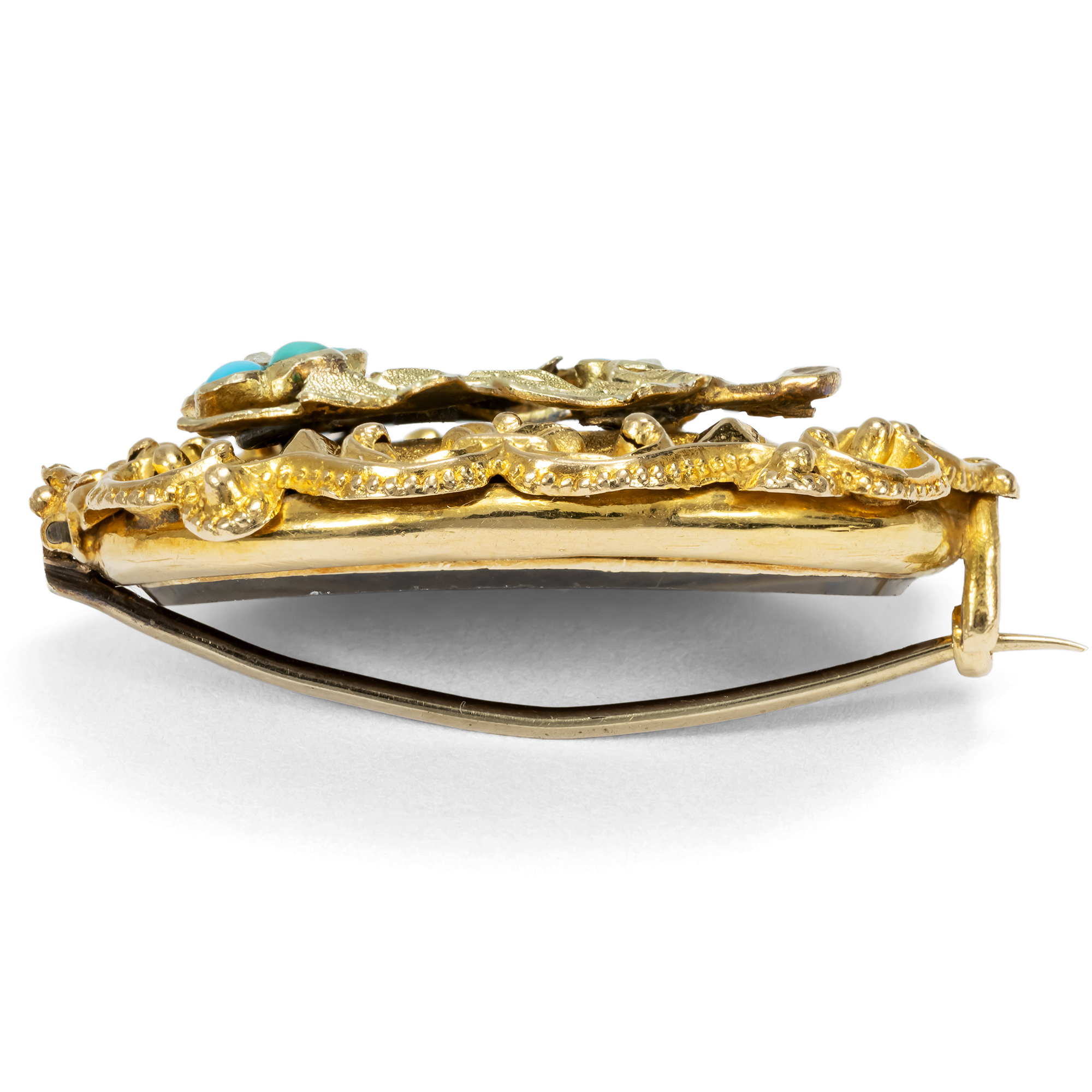 In earlier times, jewellery not only had a decorative function, but the choice of pieces of jewellery could also convey a message. This brooch from the 1840s is a fine example of this, as it represents an old symbol of friendship and affection. Crafted from high-carat gold, the front of the brooch is decorated with a forget-me-not: its two flowers are each made up of five sky-blue Persian turquoises, each grouped around a small diamond rose. The forget-me-not has a name with the same meaning in many languages. On the one hand, it is a symbol of tender remembrance. On the other hand, it was also intended to symbolize true love, a meaning attributed to the flower by Anna Burke in her Dictionary of the Language of Flowers, published in 1856. Pieces of jewellery such as this specimen, created in the particularly sentimental early Victorian era, were understood as a pledge of affection that would ensure the lasting memory of the giver. Sweeping leaf tendrils and floral ornaments frame the curved outer line of the brooch. There is also a sentimental secret on the back: covered by a glass plate, there is an inlay of artfully woven hair, with which the brooch was intended to commemorate a very specific person (see "Find out more"). The brooch is therefore not only decorative, but also a collector's item with touching symbolism.