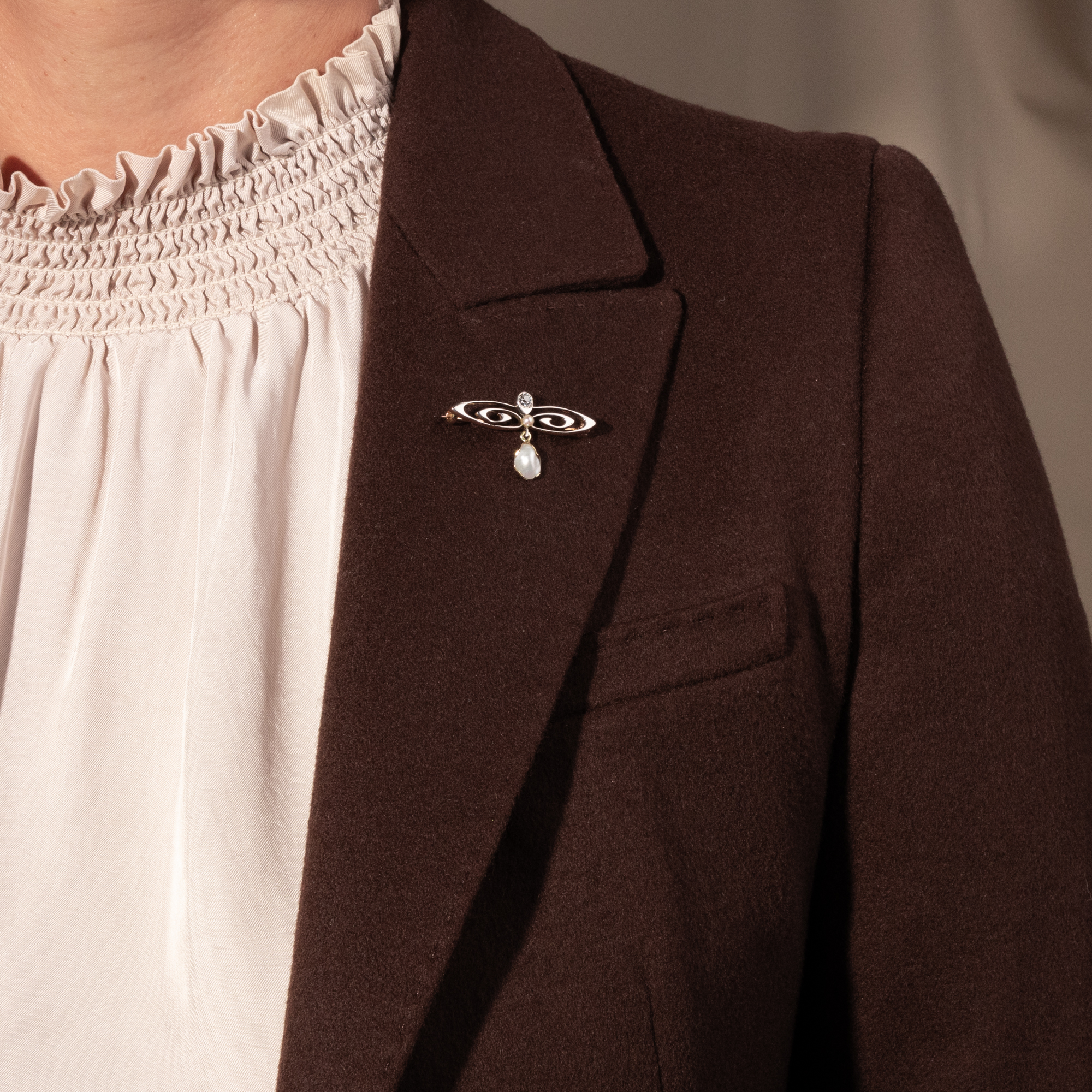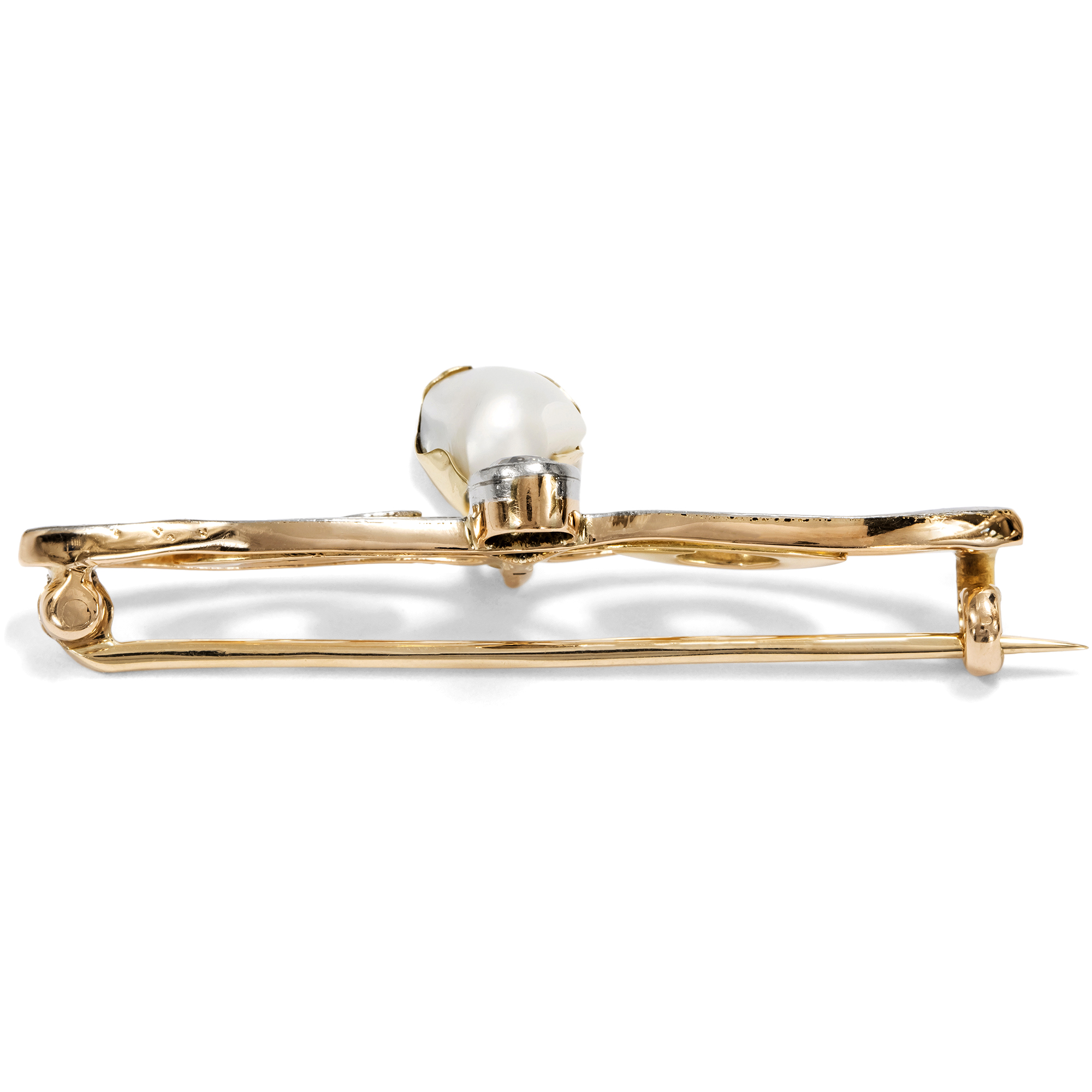 This delicate brooch, made of platinum, gold, pearls and a sparkling diamond, was created at the turn of the century c. 1900. It is a fine example of French-influenced Art Nouveau and its composition is reminiscent of a geometric pen drawing or a calligraphic line that thickens and tapers again in a gentle rhythm. Starting from a large old-cut diamond, two elegant, curved lines unfold and meet in a small pearl. A further pearl, or more precisely, a pearl blister, is attached in a movable manner. This is a pearl that has grown together in the pearl shell and was marketed as an "Antilles pearl" when the brooch was created. Its gentle movement lends the design grace and lightness. While the display side shines white and bright with its platinum overlay, the piece of jewellery itself is forged from a warm, reddish gold alloy. The elegant collar brooch is a typical example of the esprit of Art Nouveau. Its design is lively and elegant and the decoration is precious despite its small format. The Antillean pearl attached below was added to the brooch in more recent times. It replaces another, unfortunately lost pendulum. The brooch came to us from Lake Constance - as a sparkling testimony to an era that sought to merge art and life.