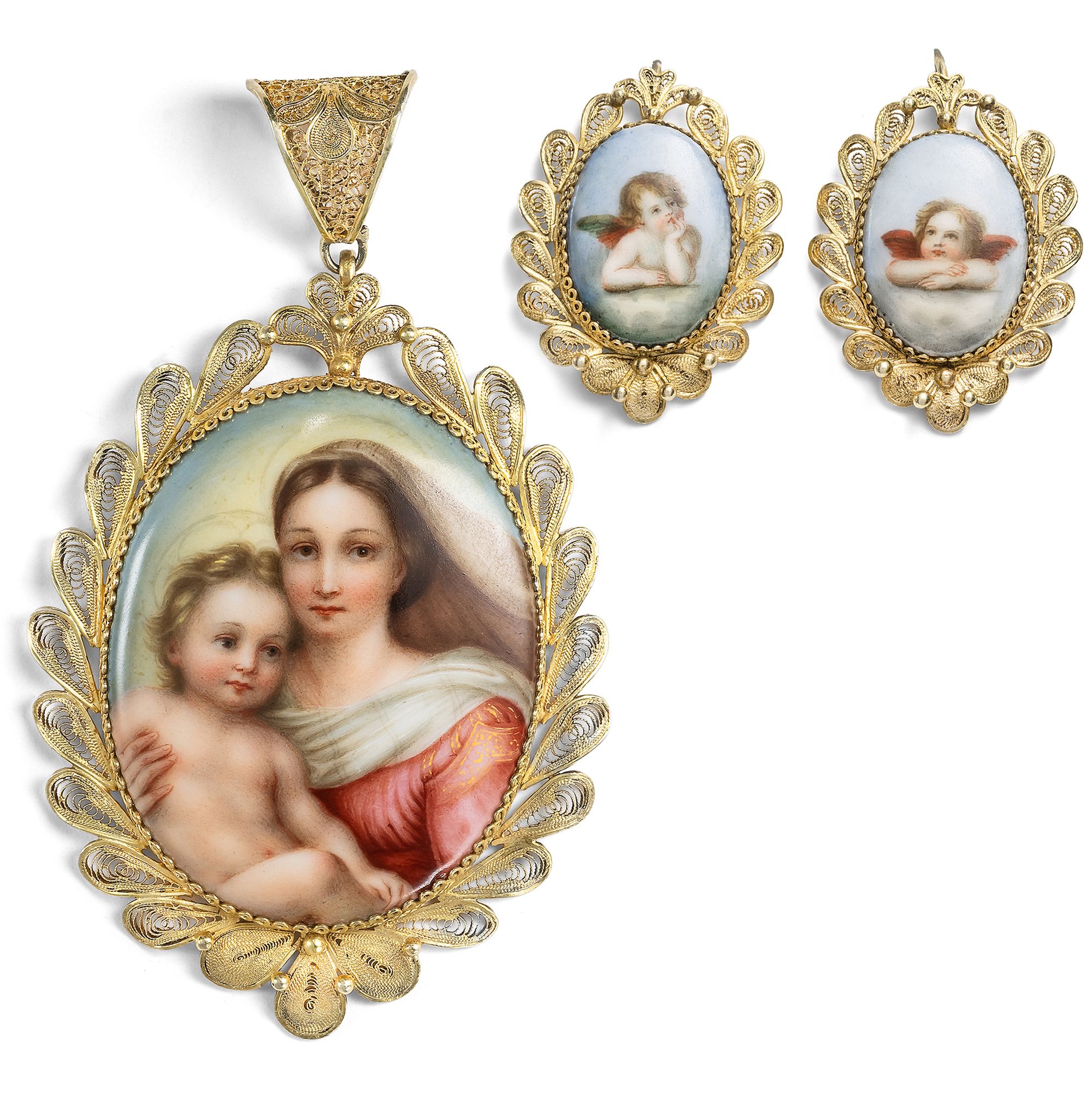 In the 19th century, a demi-parure traditionally consisted of a brooch or pendant and a matching pair of earrings. As these were designed to match each other, the Victorian lady was elegantly adorned for many occasions. The present set surprises with its special design: it does not feature precious stones or gold work as showpieces, but enamel paintings based on one of the great works of art of the Renaissance, Raphael's Sistine Madonna. The Renaissance painting from 1512 was acquired by Augustus III of Saxony in 1754 as a highlight of his collections and has been in Dresden ever since. The Madonna with the Christ Child is the centerpiece of the demi-parure and was painted by hand on the large plaque that adorns the pendant. The angels that adorn the earrings are located at the bottom of the painting. Interestingly, however, the painting as a whole is far less familiar to many people today than the two putti figures, which appear millions of times on posters or postcards as a motif in their own right. Shortly after 1800, the German painter August von der Embde copied them individually, thus paving their way to fame. The fine enamel plaques are held by unusual frames made of gold-plated silver filigree. These fine handcrafts are ornamental and expansive, yet at the same time very light, making them comfortable to wear even on the ear. We were able to discover the beautiful demi-parure in its original antique case in London.