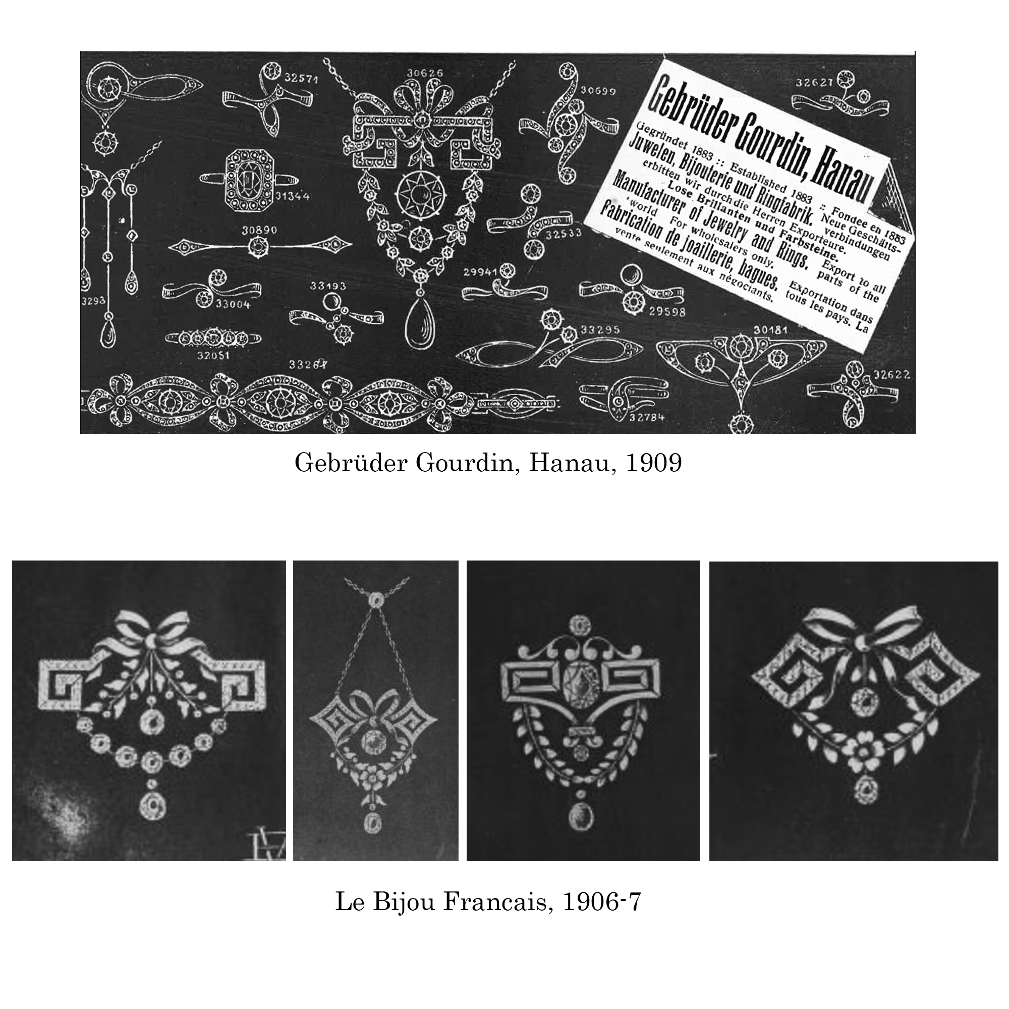 The Belle Époque, the "beautiful era", is legendary for its precious jewellery. It developed its own style, which drew its inspiration from the era of classicism between Marie Antoinette and Napoleon. Garlands, laurel leaves and bows characterized this style - the former even gave it its name: "Garland Style". This pendant brooch is a beautiful example of such neo-classical jewellery from the early 20th century. Two grass-green peridots, one round and one drop-shaped, are mounted along the central axis. A meander ornament, borrowed from ancient Greek art, unfolds at the top, completely set with small pearls. Finely modeled laurel garlands in pearls and gold shine below. They are flexibly mounted so that they do not appear rigid when worn and adapt to the background. The craftsmanship and execution, but above all the strict, classicist design with the striking meander ornaments, help to date the piece of jewellery more precisely. Comparable designs as brooches or pendants can be found, for example, in the French Le Bijou Français from 1906/07, which published modern jewelry designs as inspiration for goldsmiths. The fact that this type of design was then also produced and sold well over the next few years can be seen in a 1909 advertisement by the Gourdin brothers from Hanau in the Deutsche Goldschmiedezeitung (see last illustration). Our brooch was made in Great Britain, as fashion was definitely international in those years. It bears the British hallmark for 15-karat gold, which was only used until 1932. We discovered this wonderful, finely crafted piece in London.