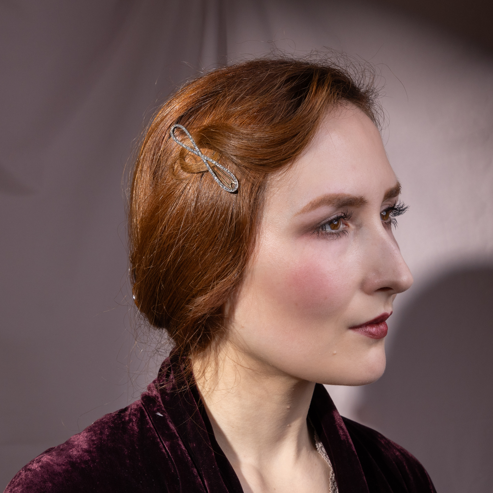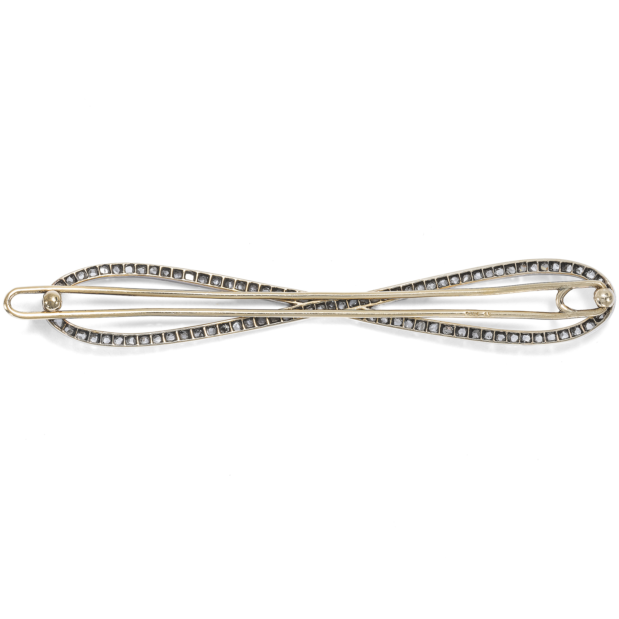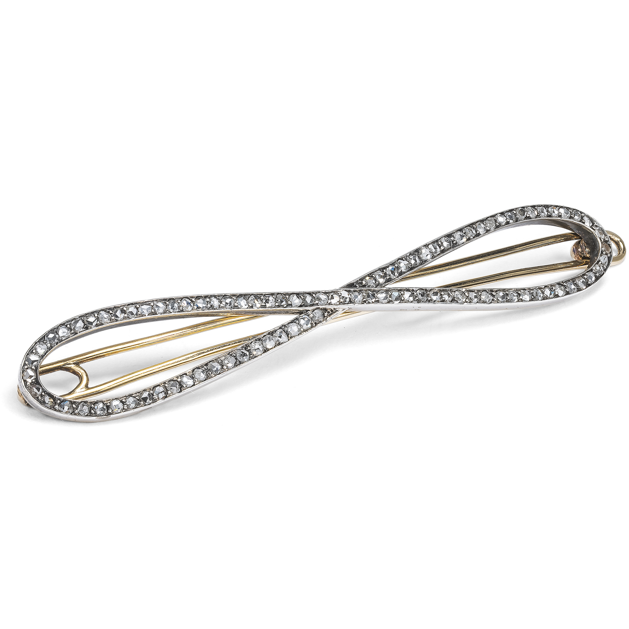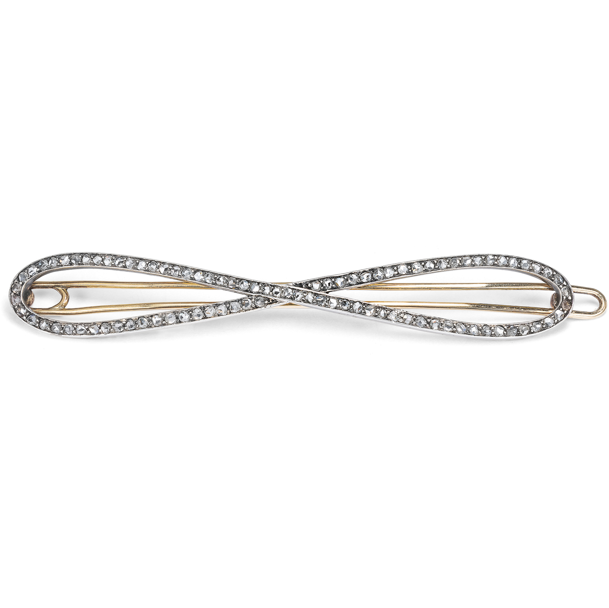 The Belle Époque, the beautiful era, bears its name for a reason. In greater numbers than any previous chapter in jewellery history, it produced wonderful jewellery for every time of day and night. The elegant lady of the evening chose her white jewels from diamonds, pearls and platinum among crystal flacons, powder puffs made of swan's down and precious perfume essences - and those who took this luxury to the extreme even owned diamond-studded hair accessories. This hair barrette is a wonderful testimony to that era, which sought to make even the smallest utility beautiful and luxurious. It is designed in the shape of a slender, horizontal figure of eight, like a symbol of infinity. These sweeping lines are studded all over with shimmering diamond roses. 92 diamonds, totaling around 1.15 ct, sparkle with the fine, understated elegance that only historic diamond cuts can provide. We were able to discover this beautiful and extremely rare piece of jewellery in southern Germany. However, as its hallmark shows, it was probably made in Vienna at the beginning of the 20th century by the goldsmith Josef Siess Söhne. A wonderful gift for someone who has everything - except for an antique diamond-studded hair clip...
