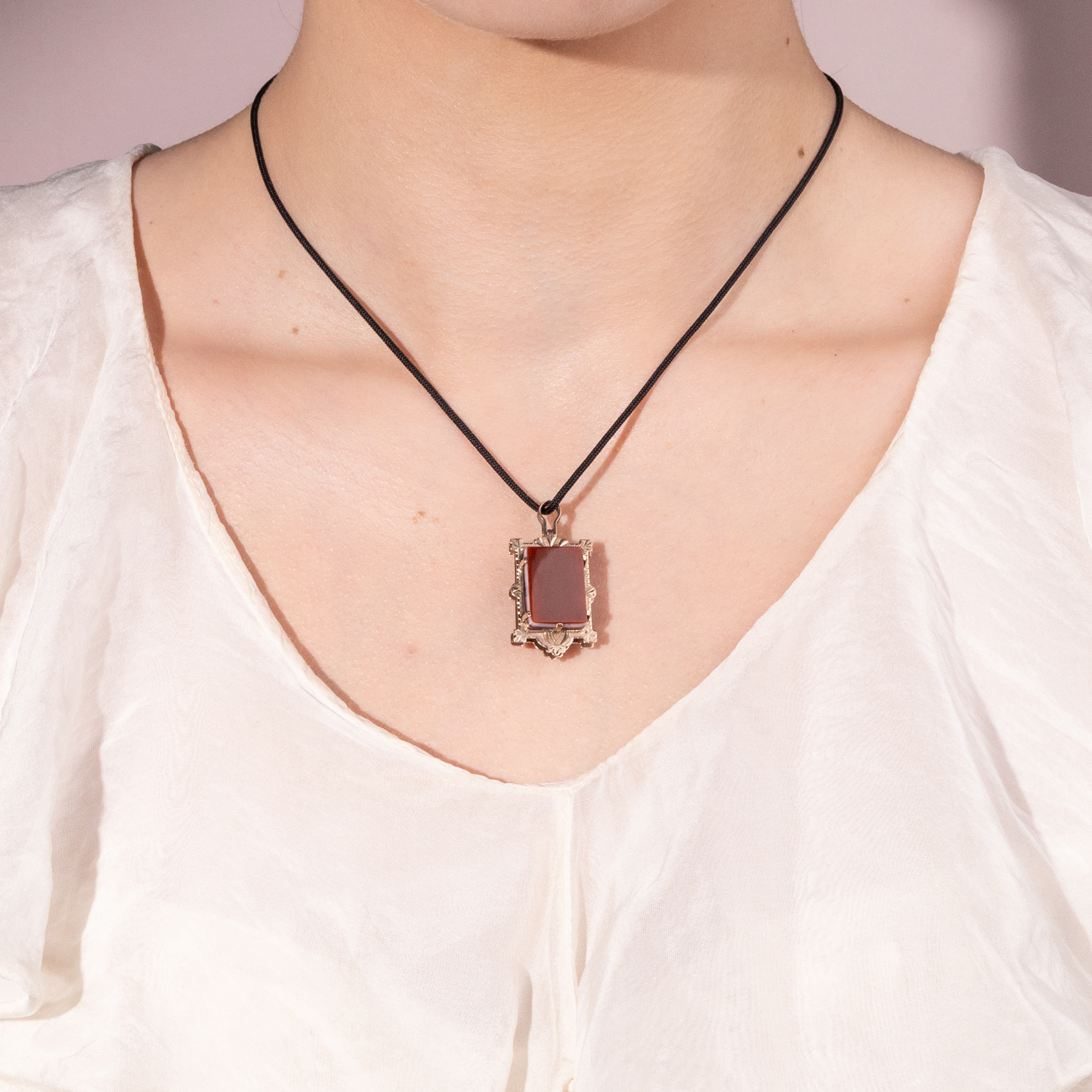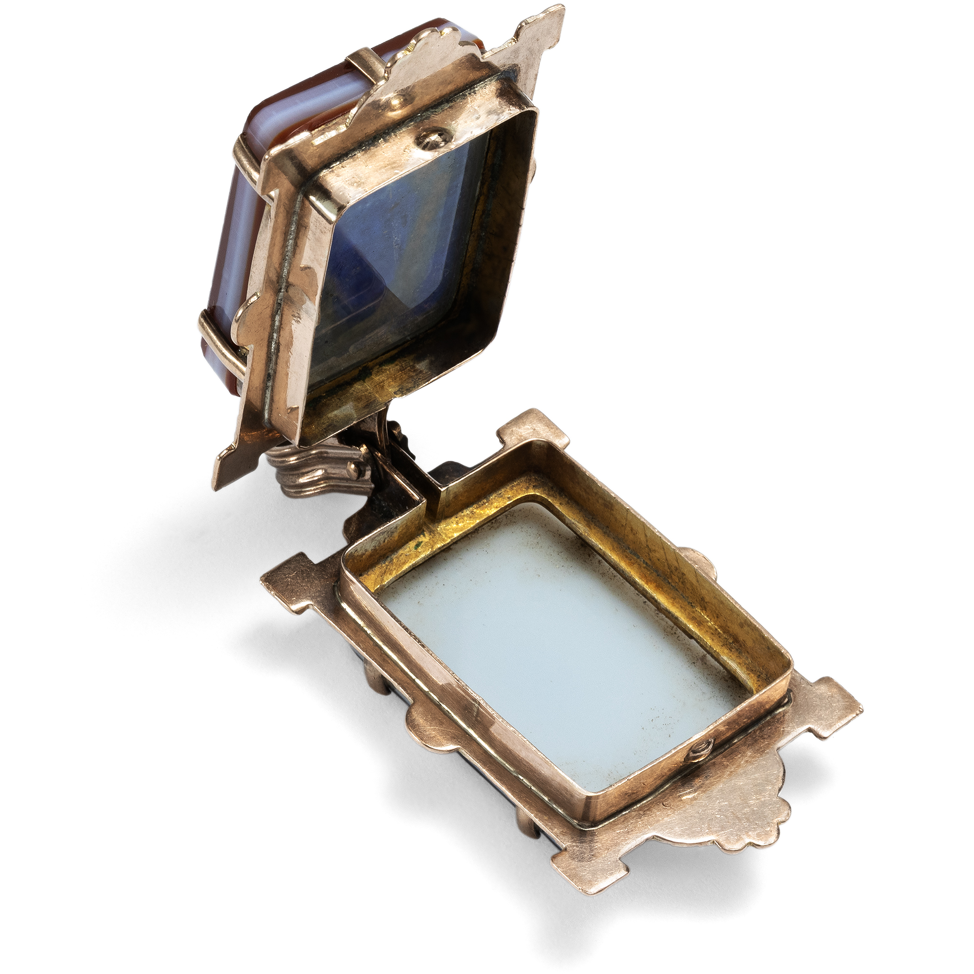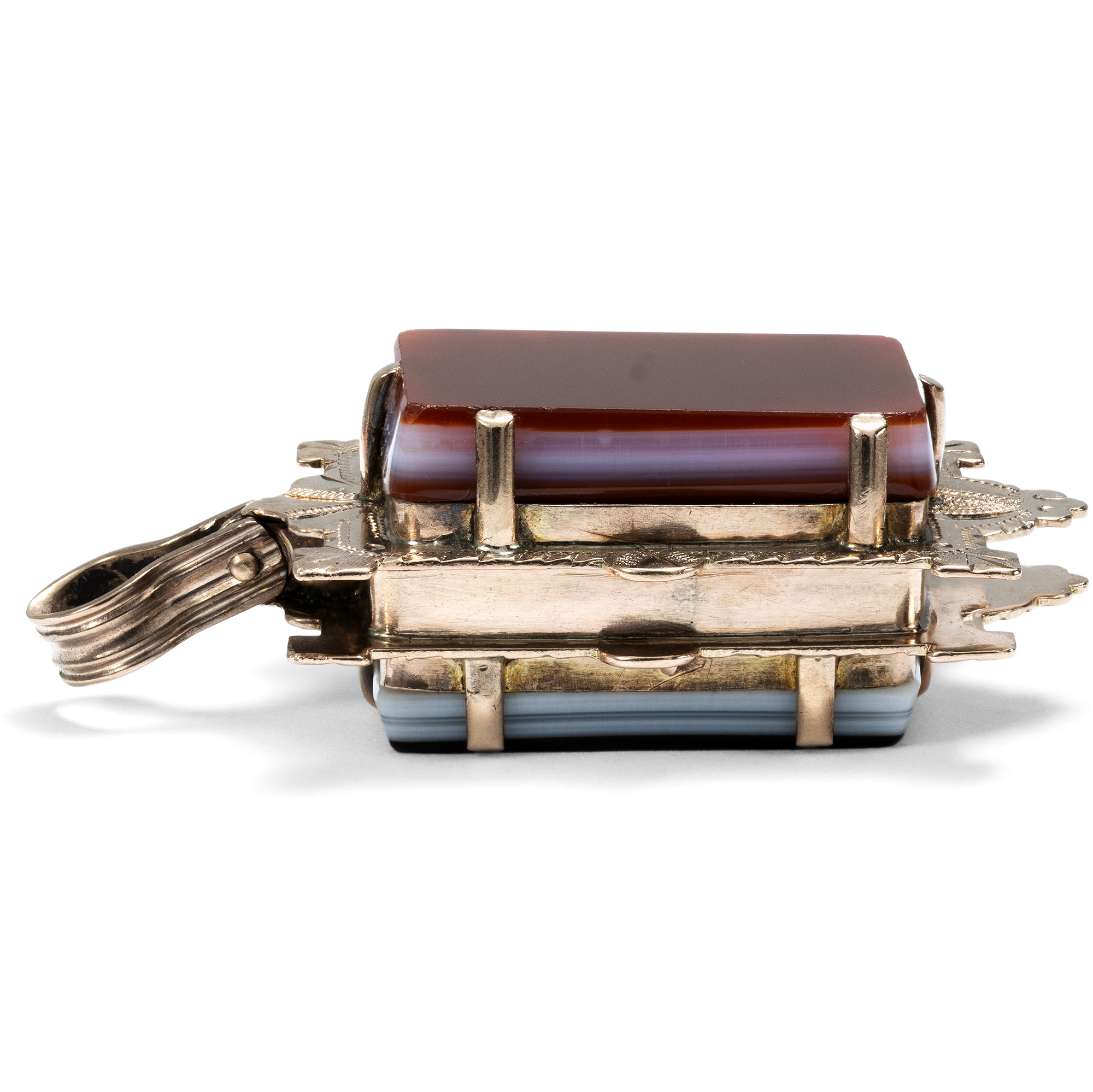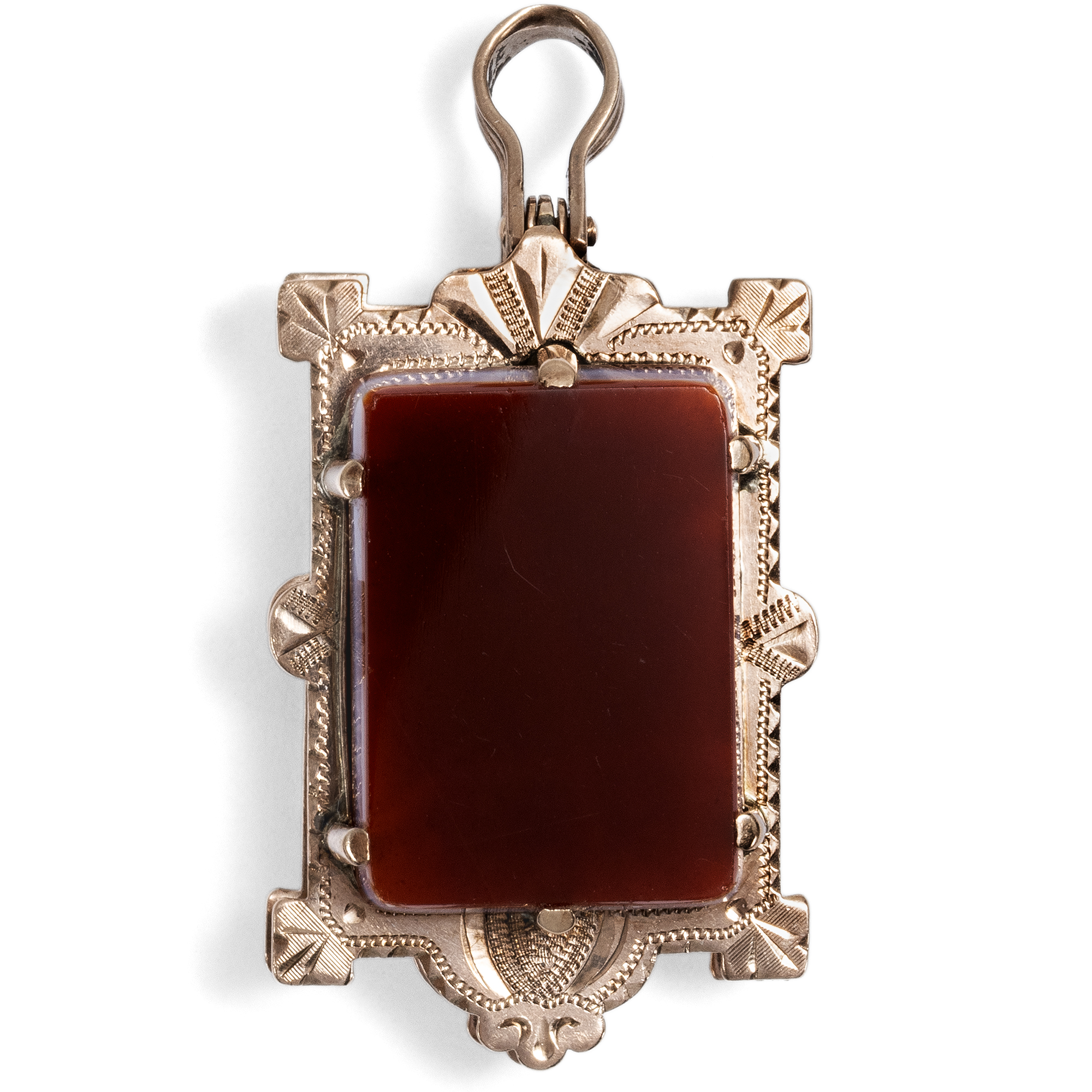 Antique lockets are one of these particularly sentimental pieces of jewellery. Worn close to the heart and yet protected from prying eyes, they can be used to safely store mementos in a precious case. As treasured treasures, they have been passed down from one generation to the next and still remind us today of people who have long since been carried away by the flow of time. This photo medallion from the last years of the 19th century shows a slice of polished stone in an engraved gold frame on both sides. We see a reddish-brown and a black hardstone. Both stones are particularly suitable for engraving and can be engraved with monograms or coats of arms. The inside of the pendant can hold two photographs. A beautiful and sentimental piece of jewellery that was originally intended for a watch chain, but can be worn around the neck just as well.