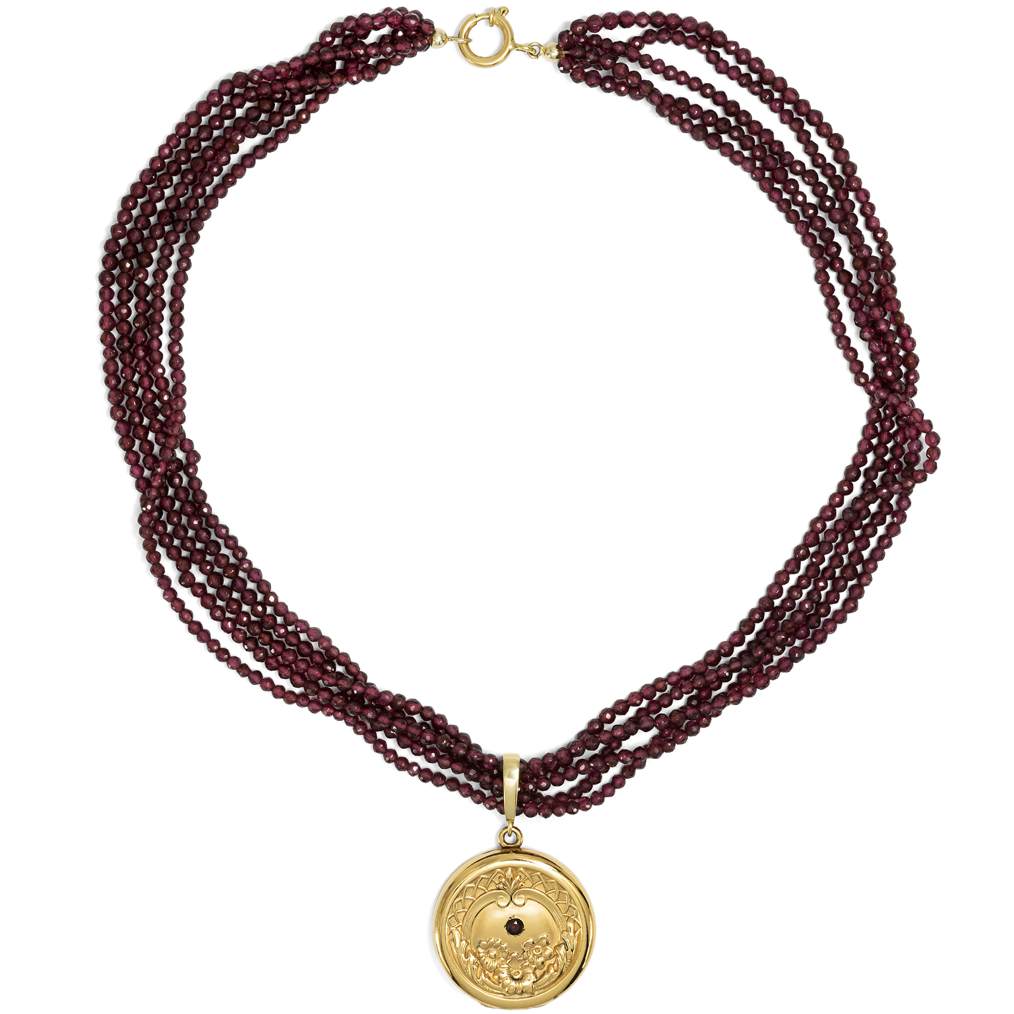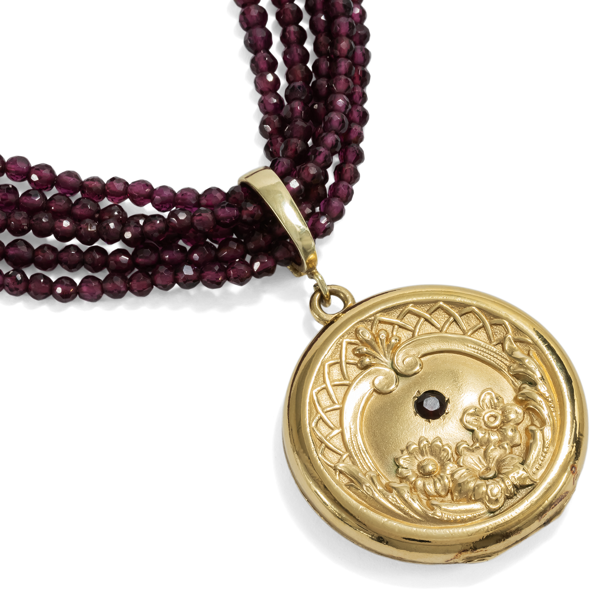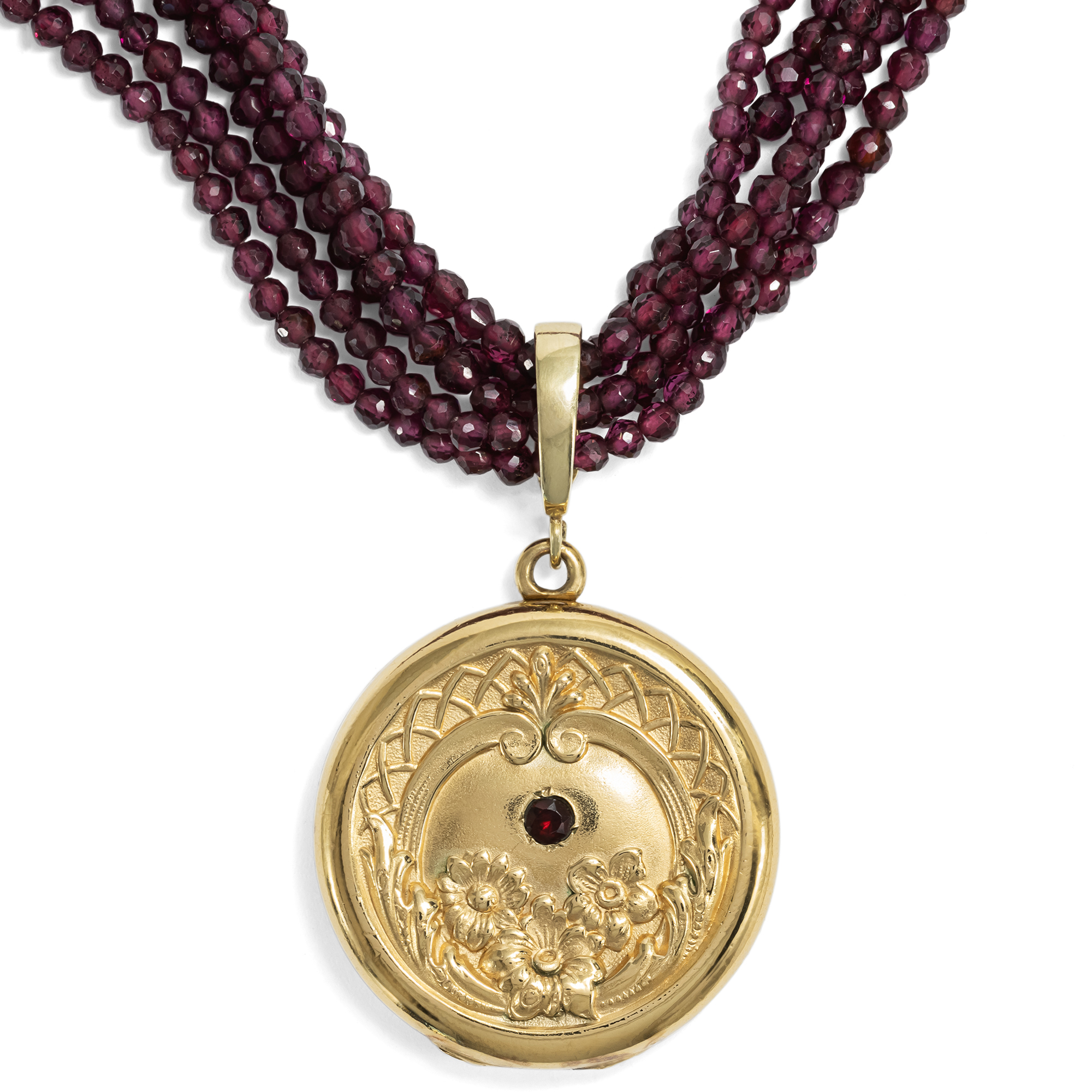 Antique jewelry forms were revived several times over the graduated 20th century. The 1980s and early 1990s in particular saw a return to models from the supposedly good old days. Antiques were in demand like never before and belonged in the stylish home as a sign of good taste. Not only were old pieces of jewellery worn again, but new creations were also created in the spirit of the past. This piece of jewellery is a typical representative of this fashion. It presents a large locket on a five-row chain of faceted garnets. The pendant is crafted from yellow gold and has a circular shape. On its front cover, graceful flowers and historicizing ornaments exude nostalgic charm. The design is based on 19th century models, but the materials and workmanship, and not least the idiosyncratic formulation of the individual shapes, reveal that this is a piece of jewellery from the late 20th century. Photographs can be stored inside the pendant behind two glazed frames. The practical clip loop can be easily opened and the locket can be worn on another chain, e.g. a pearl necklace. The well-preserved necklace with locket is an enchanting piece with a nostalgic appeal.