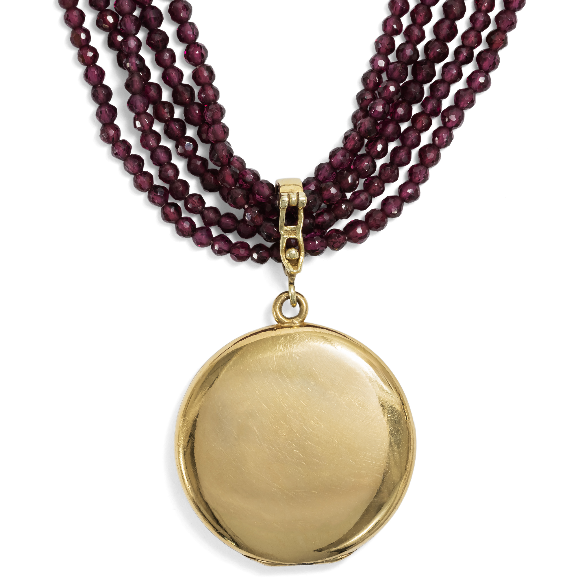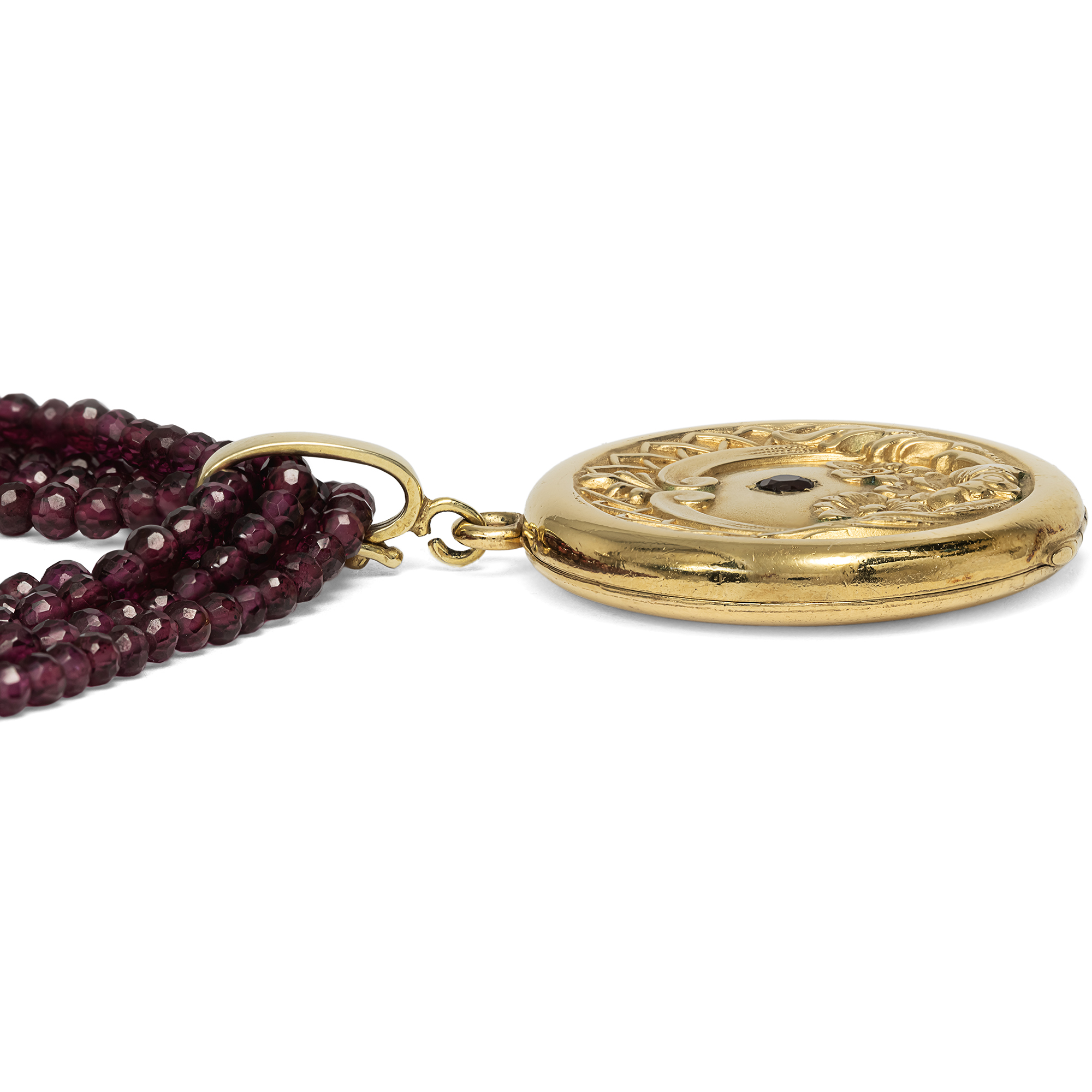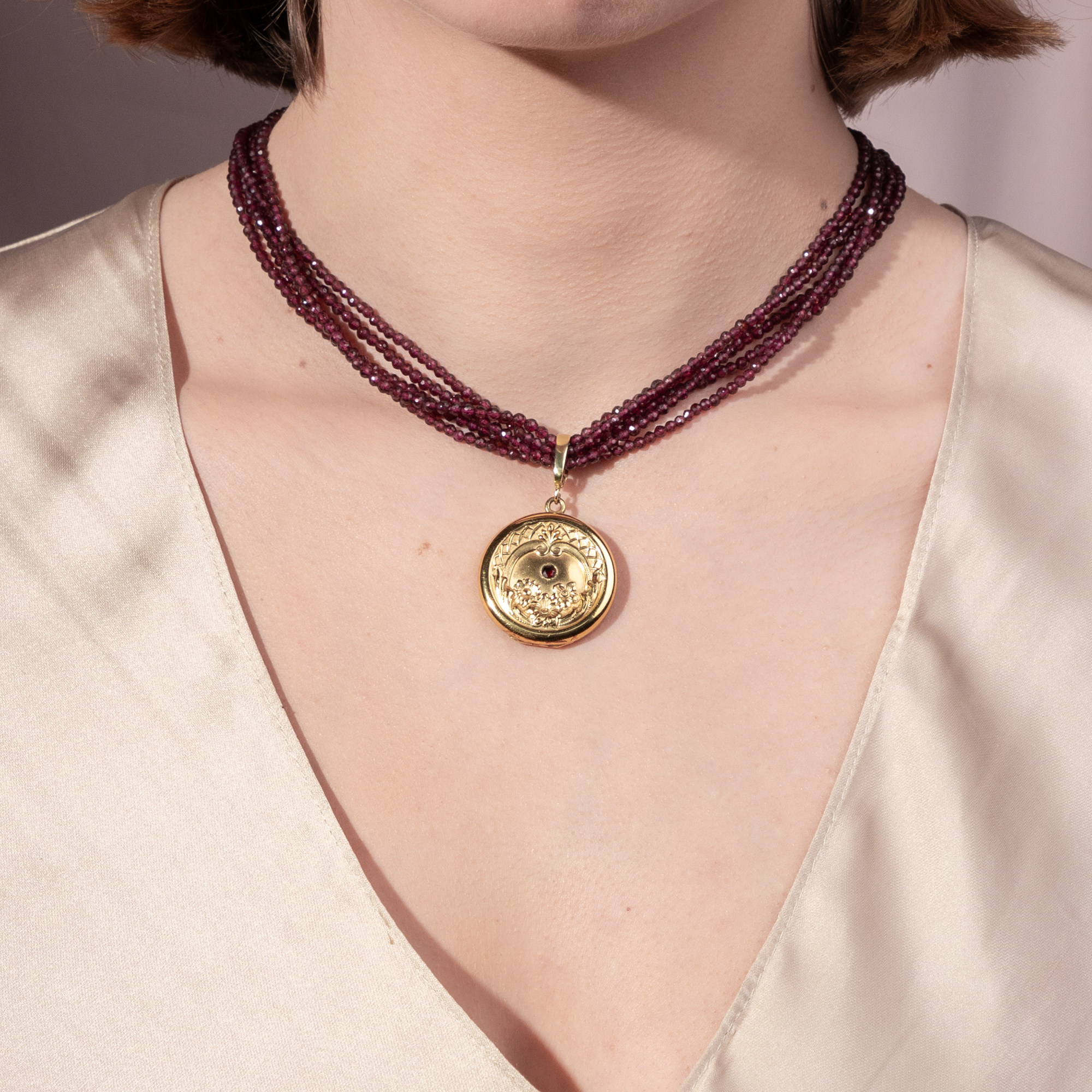 Antique jewelry forms were revived several times over the graduated 20th century. The 1980s and early 1990s in particular saw a return to models from the supposedly good old days. Antiques were in demand like never before and belonged in the stylish home as a sign of good taste. Not only were old pieces of jewellery worn again, but new creations were also created in the spirit of the past. This piece of jewellery is a typical representative of this fashion. It presents a large locket on a five-row chain of faceted garnets. The pendant is crafted from yellow gold and has a circular shape. On its front cover, graceful flowers and historicizing ornaments exude nostalgic charm. The design is based on 19th century models, but the materials and workmanship, and not least the idiosyncratic formulation of the individual shapes, reveal that this is a piece of jewellery from the late 20th century. Photographs can be stored inside the pendant behind two glazed frames. The practical clip loop can be easily opened and the locket can be worn on another chain, e.g. a pearl necklace. The well-preserved necklace with locket is an enchanting piece with a nostalgic appeal.