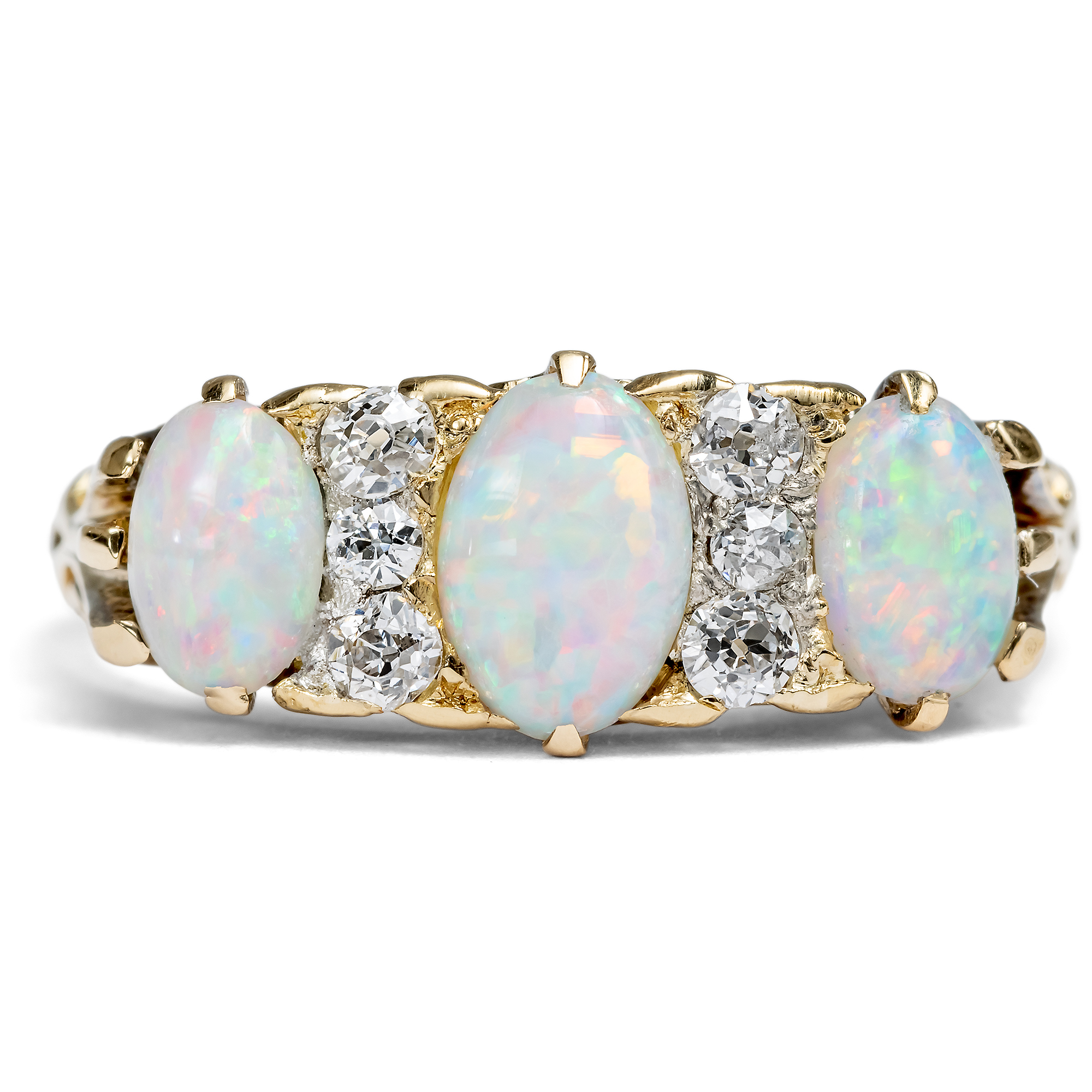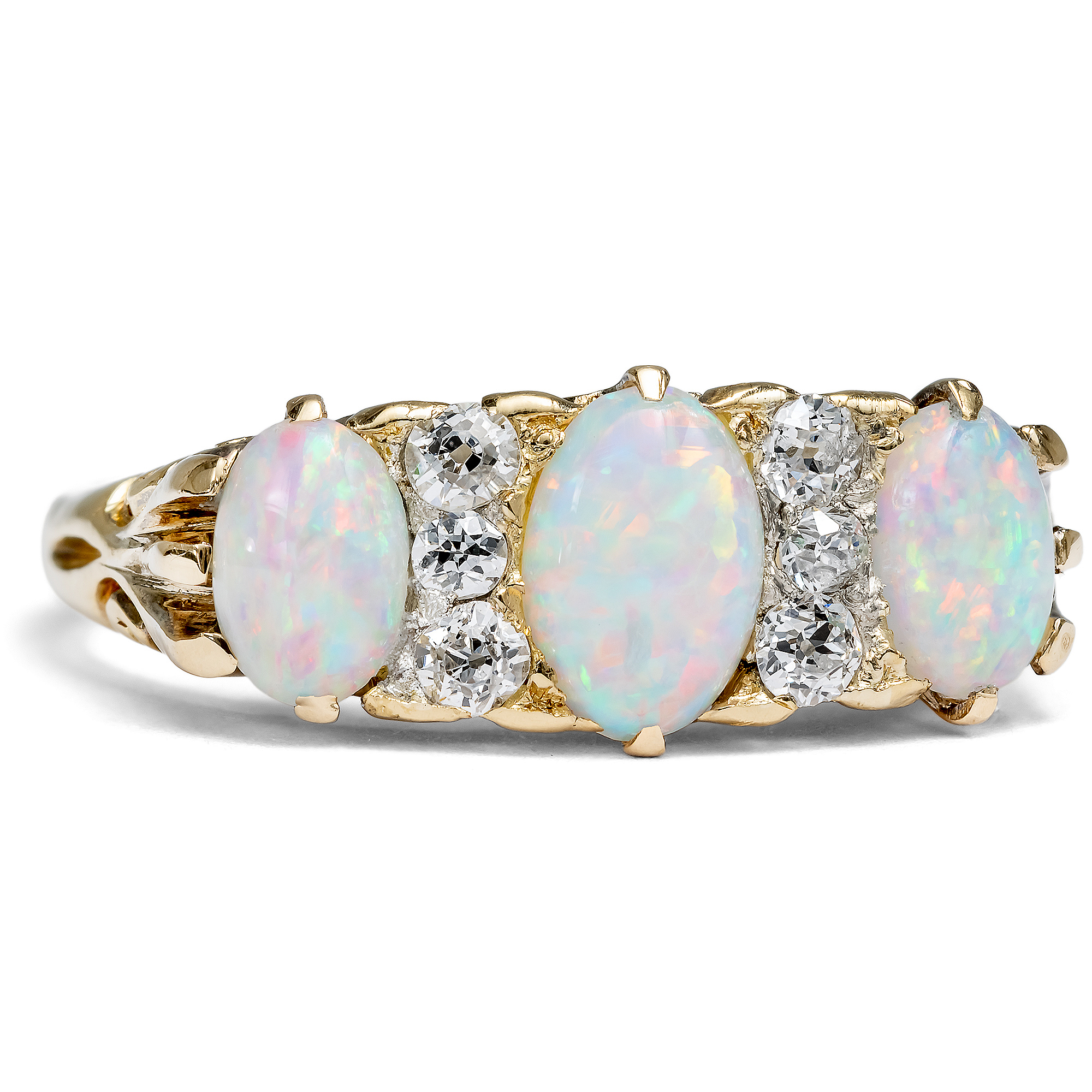 Today, opals are widely known gemstones and are among the classic gemstones used in jewelry. Most of the precious opals used today come from Australia, where they are mined underground by opal prospectors. But did you know that the first precious opal to be found in Australia was by a German researcher? It was the geologist Johannes Menge who discovered and scientifically recorded the first Australian opal in 1841. However, the Australian precious opal was not used as a gemstone until several decades later. As Australia was still an English colony in those years, it is not surprising that most of these early pieces of jewellery with opals were made in England - where the vast majority of the dazzling gemstones were exported. This ring was also created in England in the years before the turn of the last century. The protagonists of the ring are three wonderfully radiant opals. They are accompanied by six small old-cut diamonds, which are effectively set in platinum settings between the colorful gemstones. The opals have a base color of light blue and white, a delicate green and a strong red that glows when the light hits them. The ring is in very good condition. Its fine workmanship allows the special life of the stones to come into its own without making the ring unwieldy or difficult to wear. We discovered the ring in the south of England.