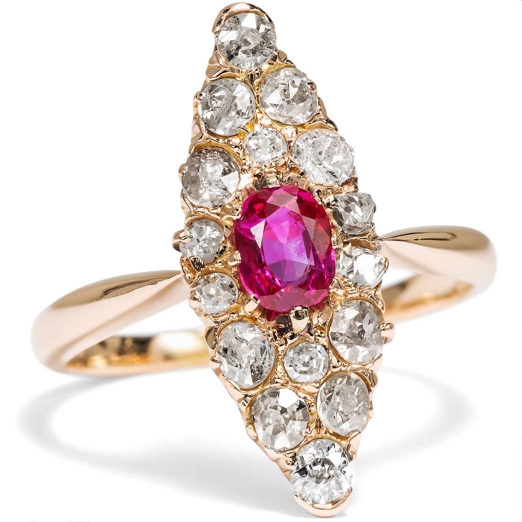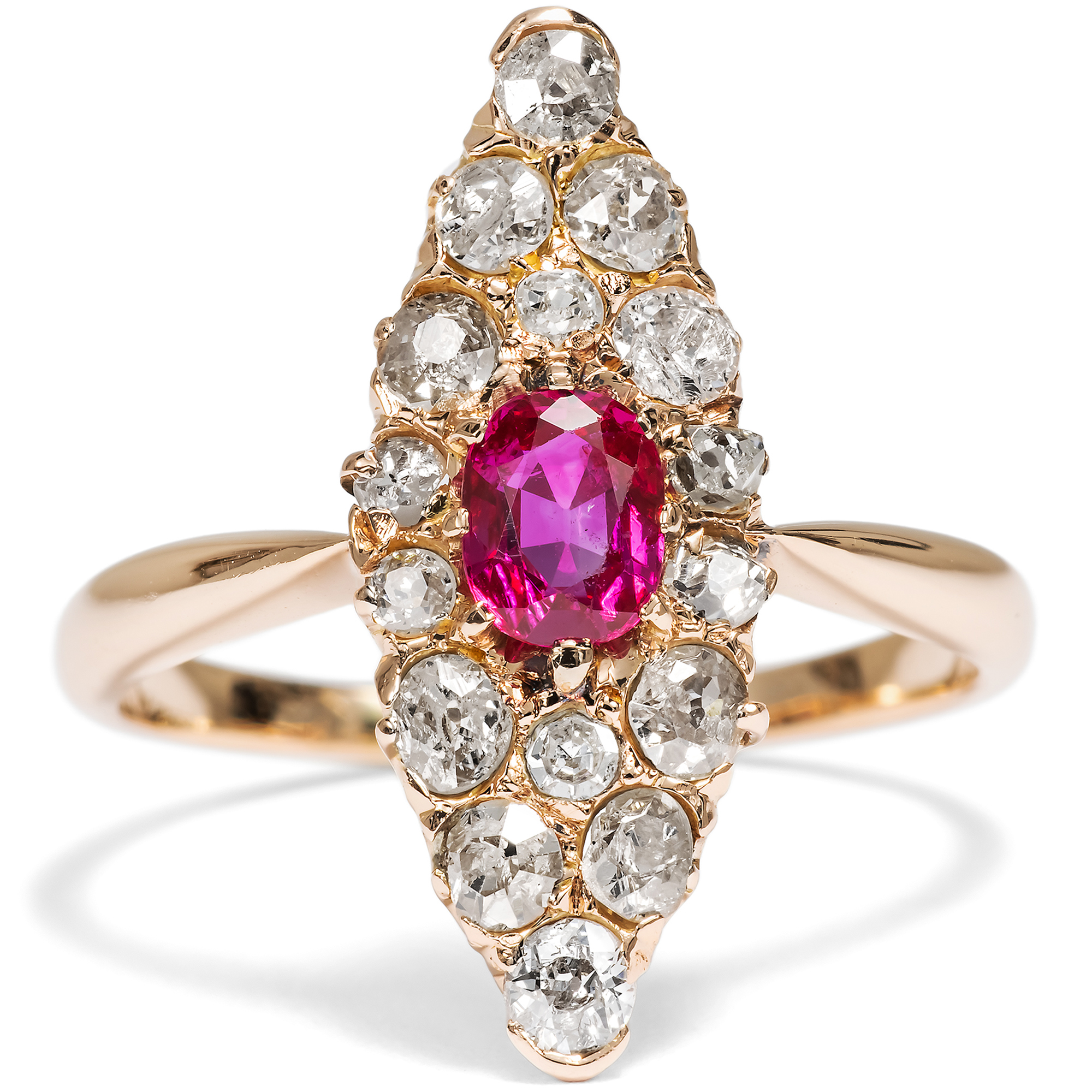 A grand ball, a get-together in a candlelit salon, a supper in an elegant hotel, an opera performance: in the years before the turn of the last century, there were plenty of occasions for the "happy few" to wear and present beautiful wardrobe and magnificent jewellery. In Guy de Maupassant's stories or contemporary testimonies such as Harry Graf Kessler's diaries, we can see this time right before our eyes. The ring presented here comes from this lost world. Its design as a so-called "marquise" ring was one of the most popular ring shapes of those years. The ring face is set with around one carat of old-cut diamonds, which are placed close together. The focal point is a pink-red natural ruby from Burma, the colour of which harmonizes with the warm gold of the ring band. The stone is untreated and not heated: a real little gem! As its hallmark shows, the ring was created in Germany - but it would also have been a welcome accessory in other countries of the western world, as an almost international fashion united the haute society of the Belle Époque.