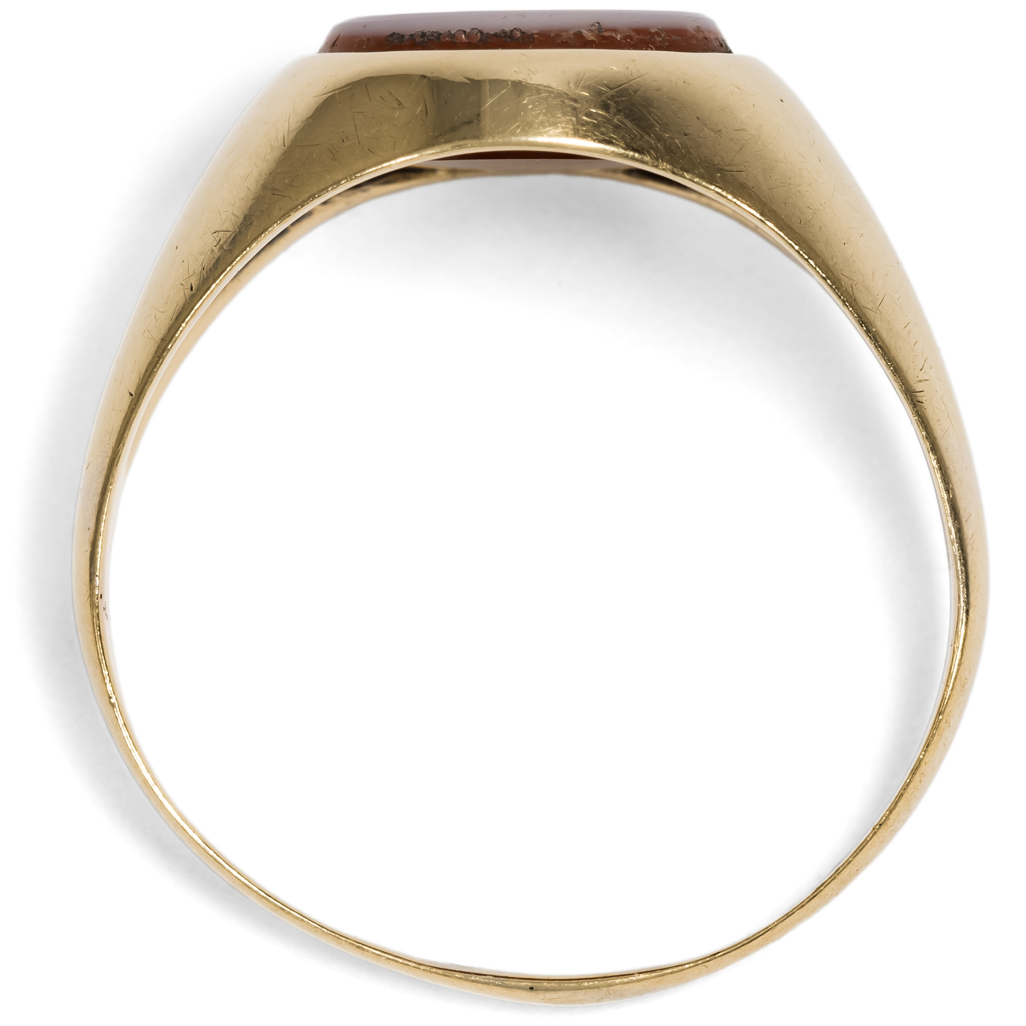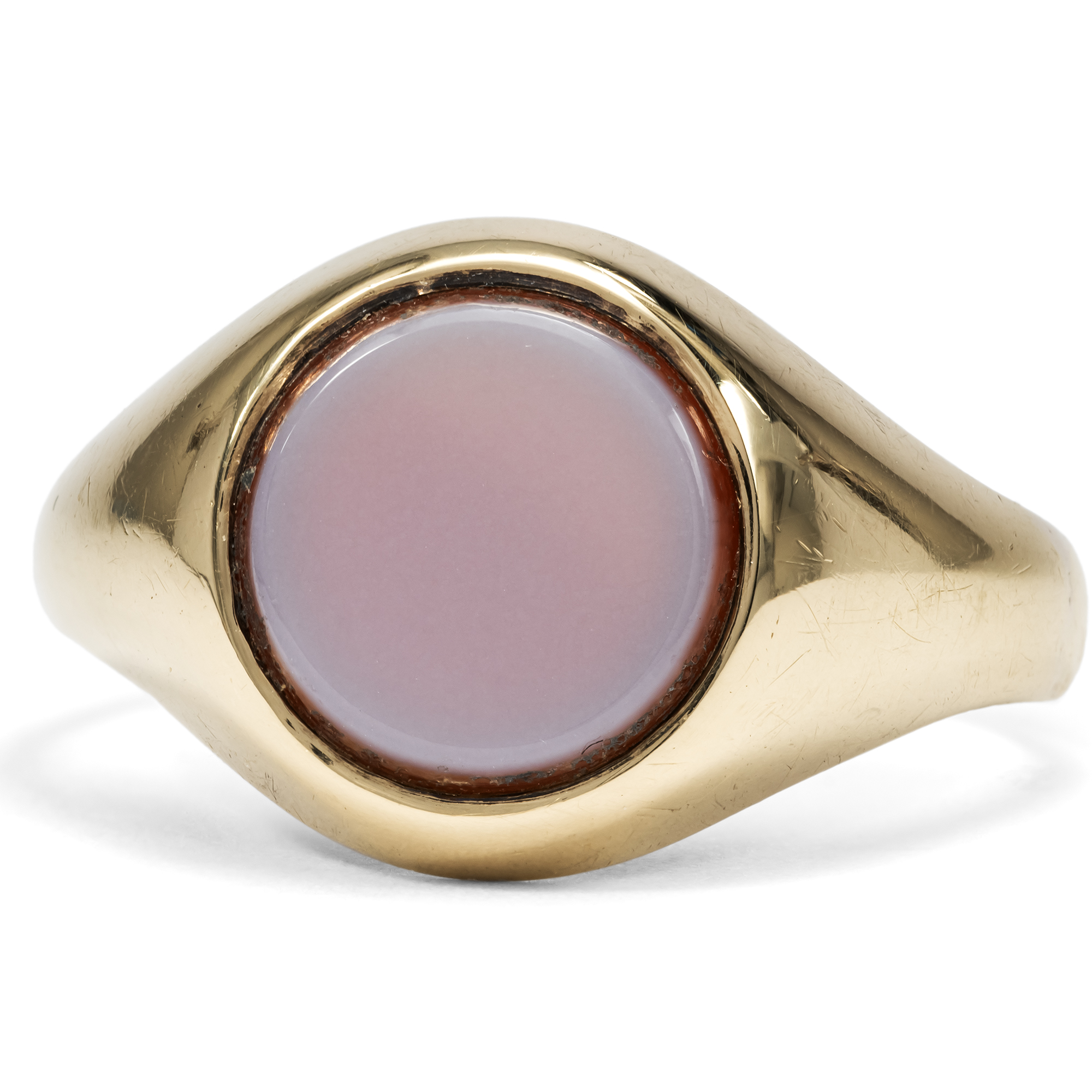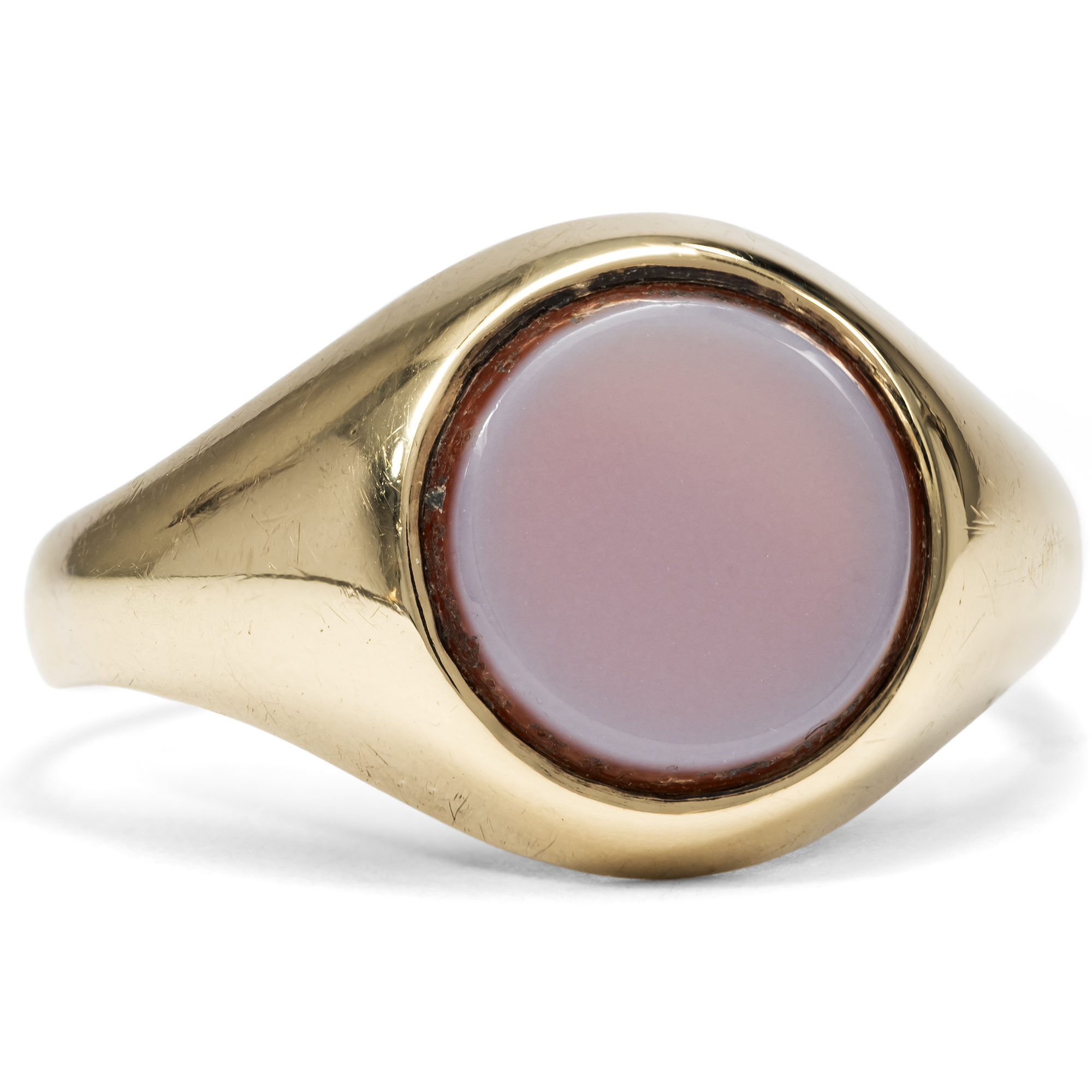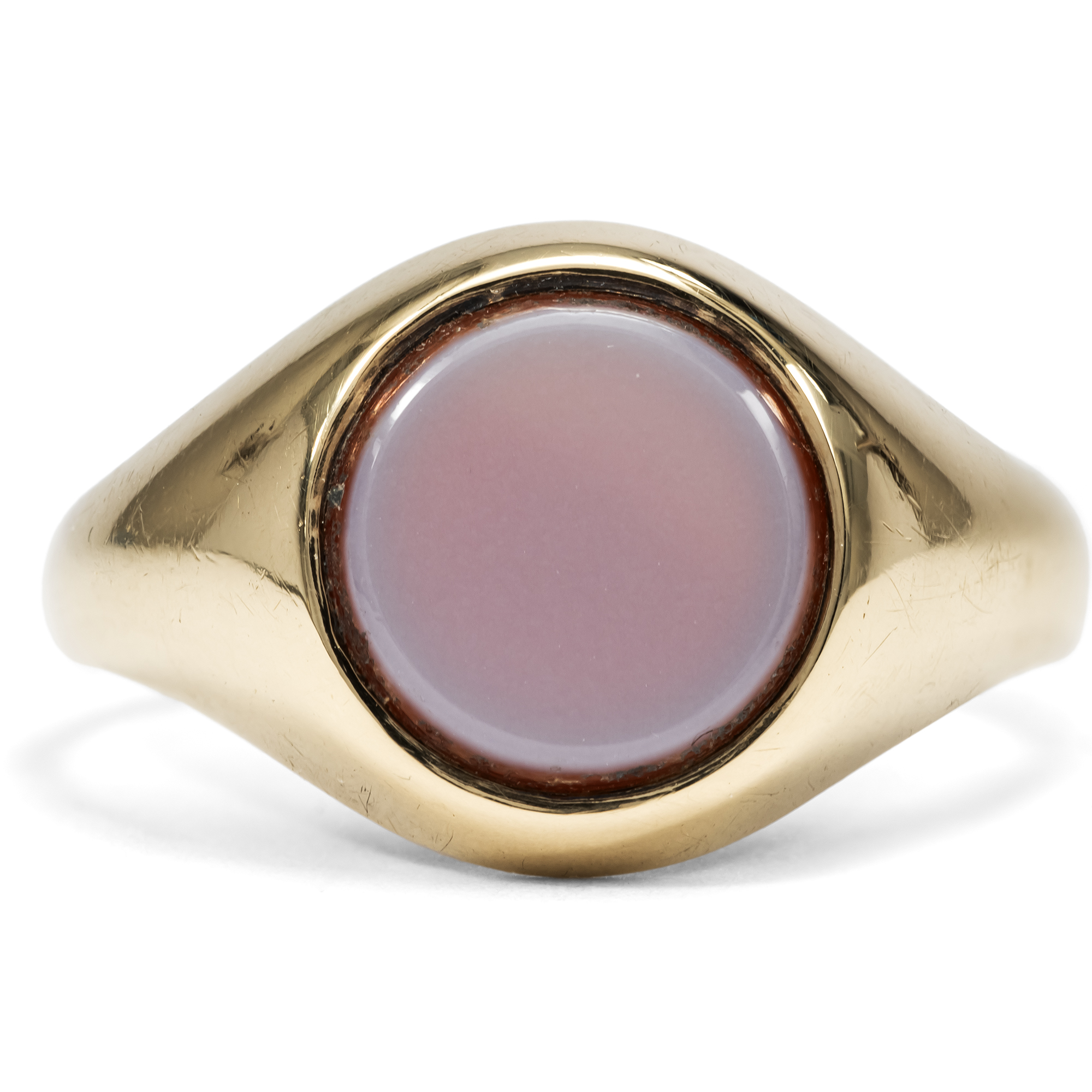Signet rings have been known since ancient times. With an engraved coat of arms or image that can be pressed into liquid wax, they have a very practical function - and at the same time are always a representative status object. This ring is such a signet ring and yet still a blank slate - because its stone is not engraved. The 14-karat yellow gold setting bears a circular disc of hardstone. The stone is mauve-coloured and beautiful even without engraving. The ring from c. 1910 came to us here in Berlin. It is in very good condition and can be worn by both men and women.