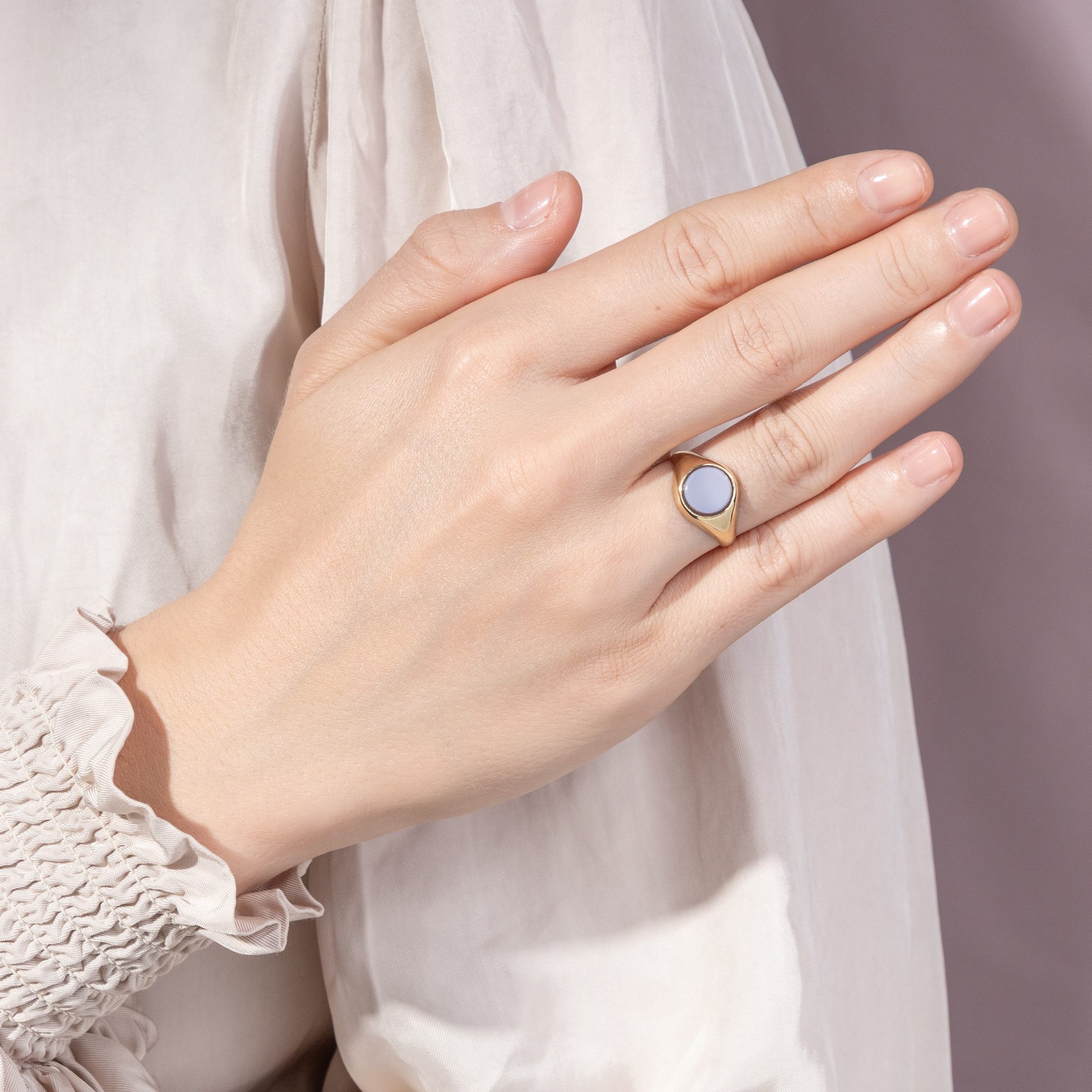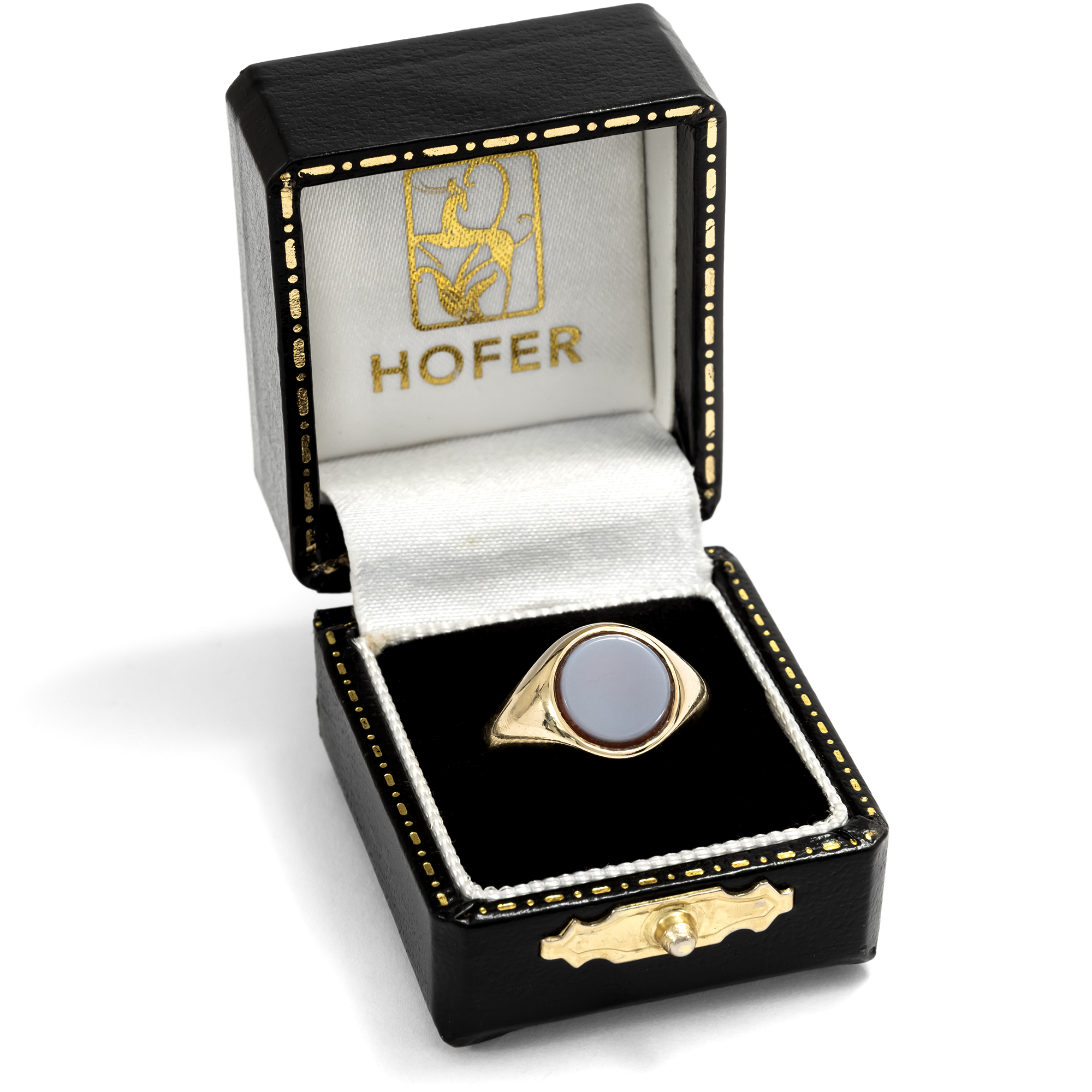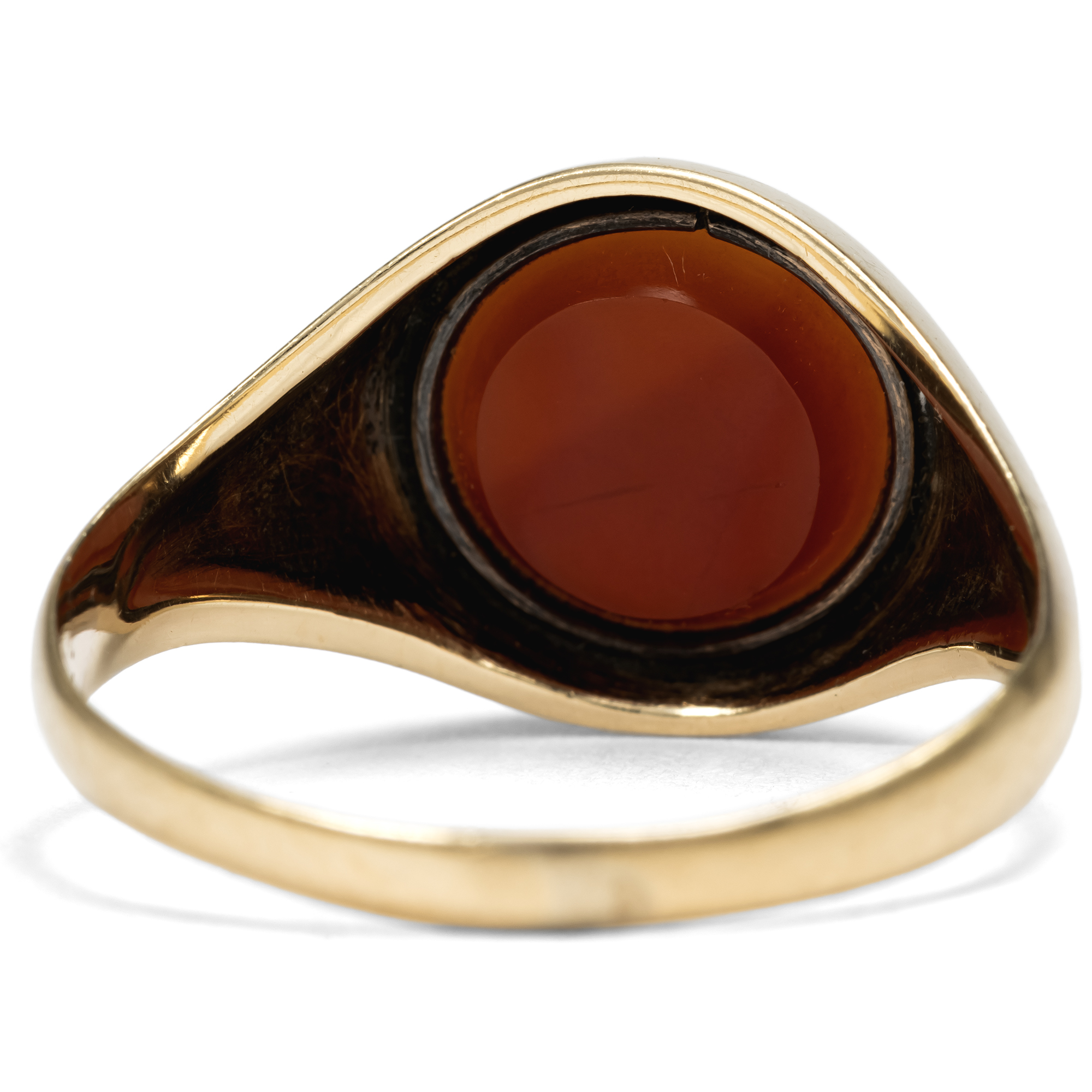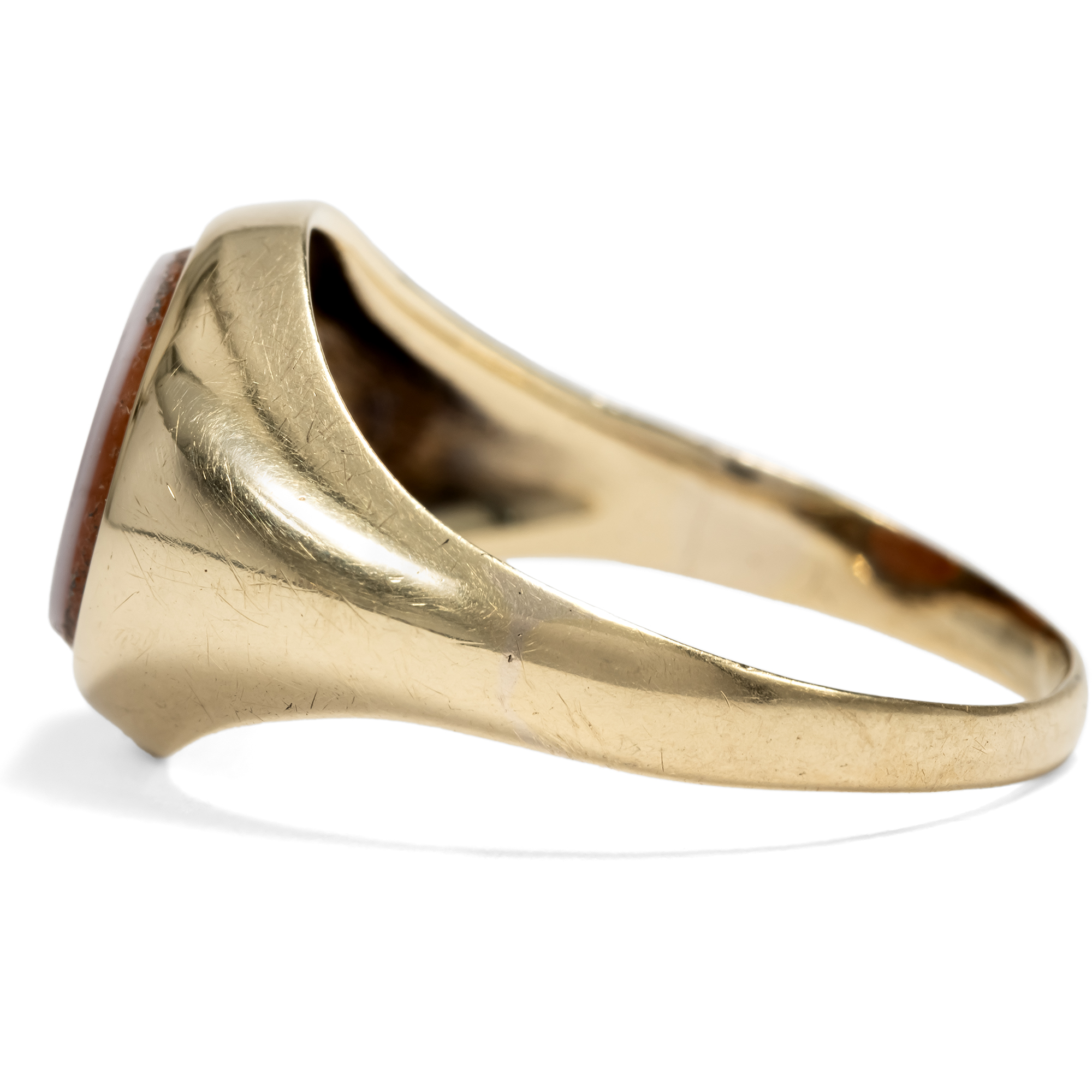 Signet rings have been known since ancient times. With an engraved coat of arms or image that can be pressed into liquid wax, they have a very practical function - and at the same time are always a representative status object. This ring is such a signet ring and yet still a blank slate - because its stone is not engraved. The 14-karat yellow gold setting bears a circular disc of hardstone. The stone is mauve-coloured and beautiful even without engraving. The ring from c. 1910 came to us here in Berlin. It is in very good condition and can be worn by both men and women.