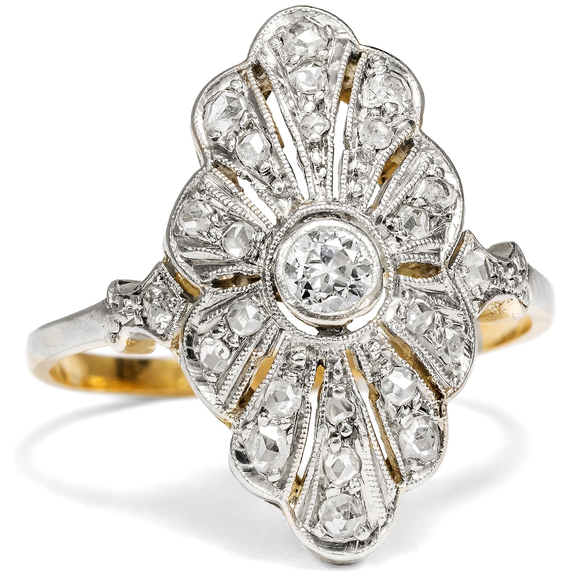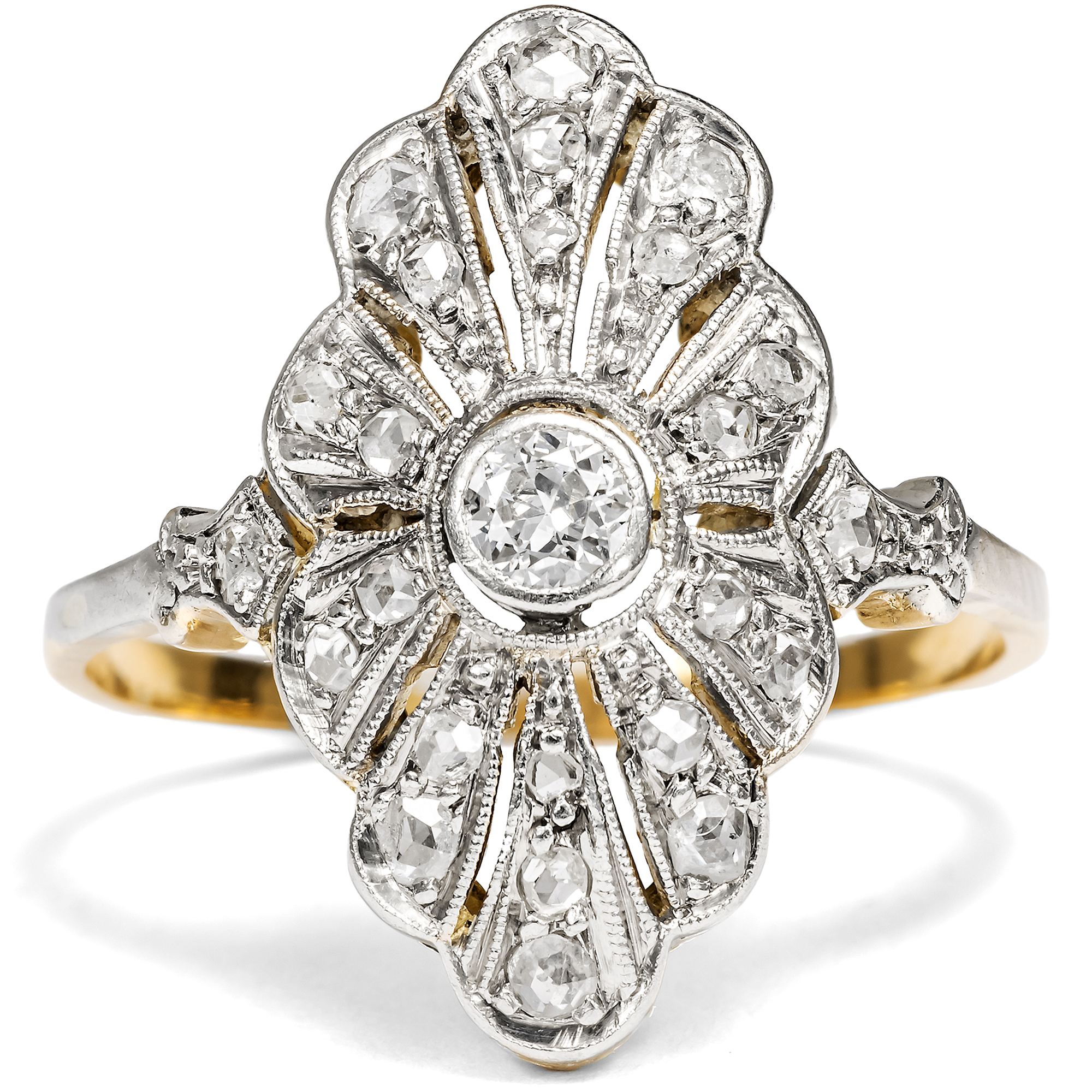 The fan is an accessory that was very popular in earlier eras but is now a little out of fashion. Even in the Rococo period, elegant court ladies used fans as a means of non-verbal communication. And in the luxury-loving years of Art Deco, the fan was a popular way to make your jewels shine! On Valentine's Day 1929, for example, the Jewelers' Circular reported: "The most indicative feature of the season as regards evening wear is the popularity of the fan. If the fan is to be used, the fingers must be covered with rings, while the arms must be covered with bracelets, the fan being a means of showing off these ornaments." On such an evening, with a hand clutching the fan and glittering in the electric light, the ring shown here may also have been made. It is designed as an elongated, multipass shield ring that is organized in a fan shape around an old-cut diamond. The surface of the ring is set with a total of 24 rose cut diamonds and features milgrains and sawn joints, giving the ring a beautiful interplay of light and shadow. The ring is made of gold with a platinum front and is in very good condition. A beautiful, decorative original from the years of jazz and cabaret. The quote from The Jewelers' Circular, Vol. 98 (February 14, 1929), p. 41.