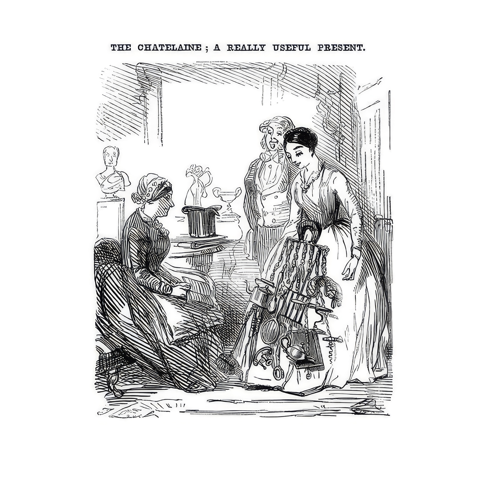 This box is a graceful piece of jewellery from the c. 1900's. It is made of silver and designed in the most beautiful Art Nouveau style. Elegant curves and iris flowers enliven the surface. The domed lid can be opened to reveal the lightly gold-plated interior. There is space for sweets, drops, tablets or even personal souvenirs. With an eyelet and a movable loop, the tin can be worn around the neck on a silver irring chain. It was originally intended for powder and was part of a chatelaine. This characteristic form of jewellery from the 18th and 19th centuries combined decoration and function in a special way. It adorned the ladies' belts and also served as a holder for a variety of useful utensils. In some respects, it allowed more direct access to everyday objects than we are used to today - just think of how easily keys or phones get lost in pockets. Similar to an individually assembled set of tools, the chatelaine offered its wearer exactly those objects that she regularly needed, such as notebooks, needle boxes, mirrors or watches. Despite its practical function, however, the decorative effect became increasingly important, so that the outfit could sometimes appear almost overloaded - a fact that John Leech commented on with subtle irony in the English magazine Punch as early as 1886 (see illustration). We discovered the box here in Berlin.