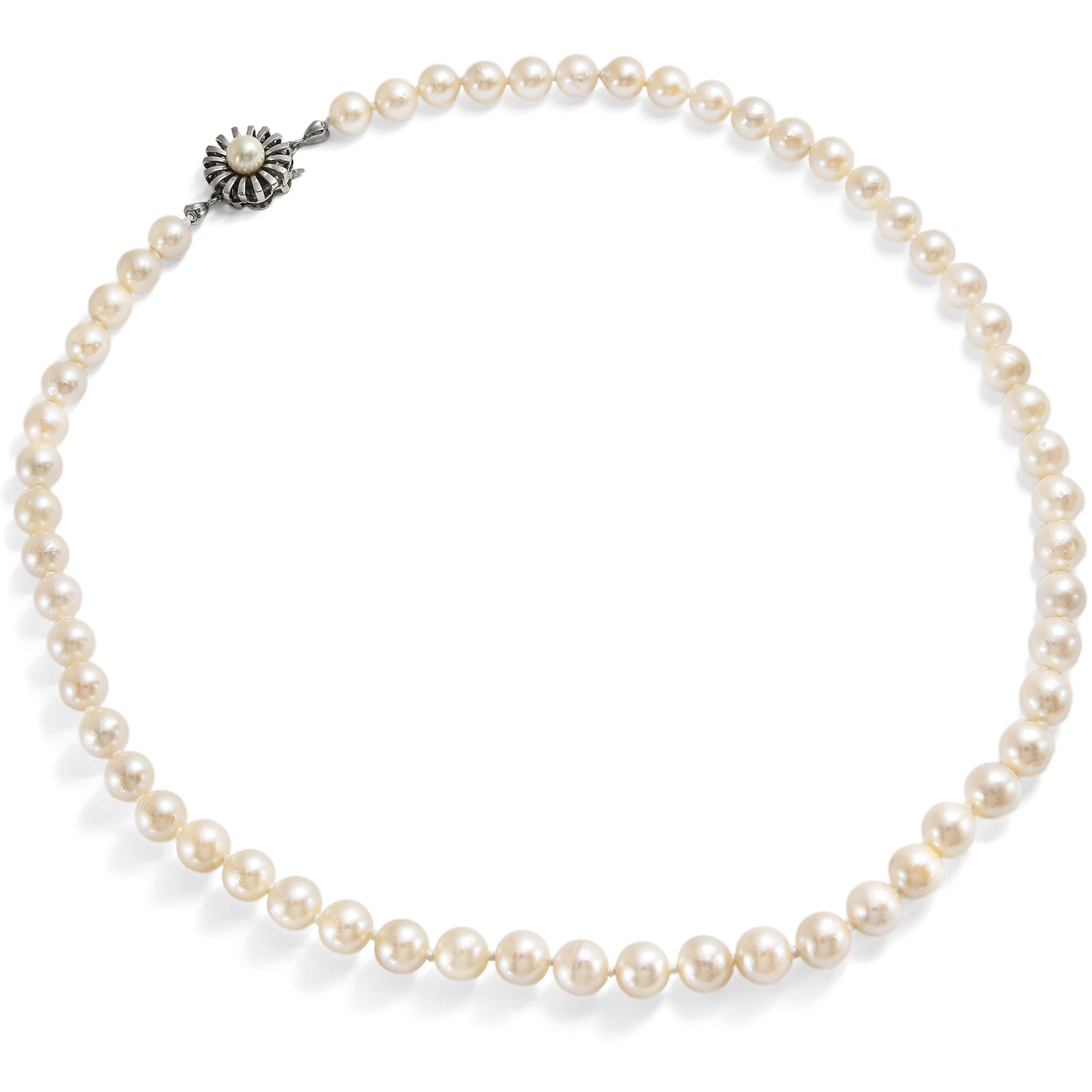 Pearl necklaces come in very different lengths, which is why they are so versatile. Whether sporty or elegant, each pearl necklace can enhance clothing in different ways: we recommend the classic "choker" (35-40 cm) for casual and business wear, the slightly longer "matinée necklace" (50-60 cm) for more festive occasions, and the 70-90 cm "opera" length, also known as the "sautoir", is a luxurious eye-catcher for the grand ball, whether worn single or double. This necklace, which is approximately 46.0 cm long, is a so-called princess length. The beautifully arranged pearls all have a considerable diameter of around 7.2 mm and shimmer softly in a warm cream tone. The luster is good to medium and the surface of the pearls shows slight to clear signs of growth. The clasp is made of white and yellow gold and is designed in the shape of a stylized flower with another pearl in the center. We have had the necklace from around 1980 restrung and knotted.