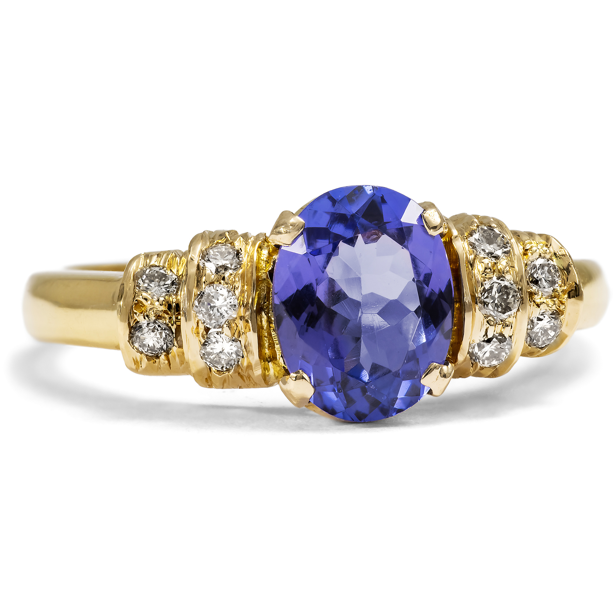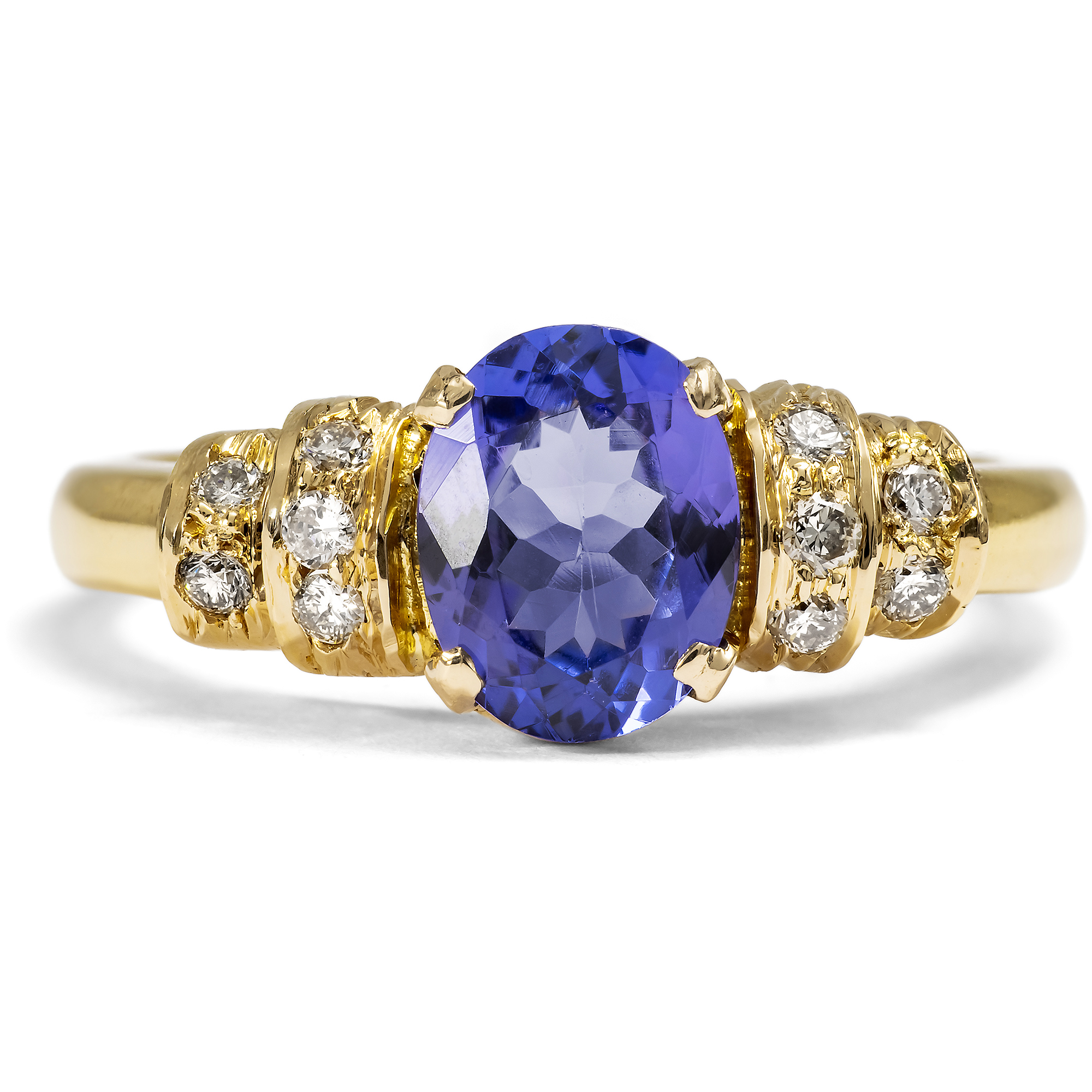 When gemologists brought the first blue gemstones from the steppe sands of Tanzania to New York in 1967, which had previously been unknown on the gemstone market, Tiffany & Co. secured the rights to this new mineral. The gemstone quickly became one of the most sought-after minerals in the jewelry industry. We see such a tanzanite as the centerpiece of this ring made of high-carat yellow gold. It is oval faceted and weighs around 1.20 ct. Its color alternates between royal blue and violet. Ten brilliant-cut diamonds accompany it on the shoulders of the ring. They have a slightly warm tint and complement the warm shine of the gold wonderfully. The ring came to us here in Berlin. It is in very good condition.