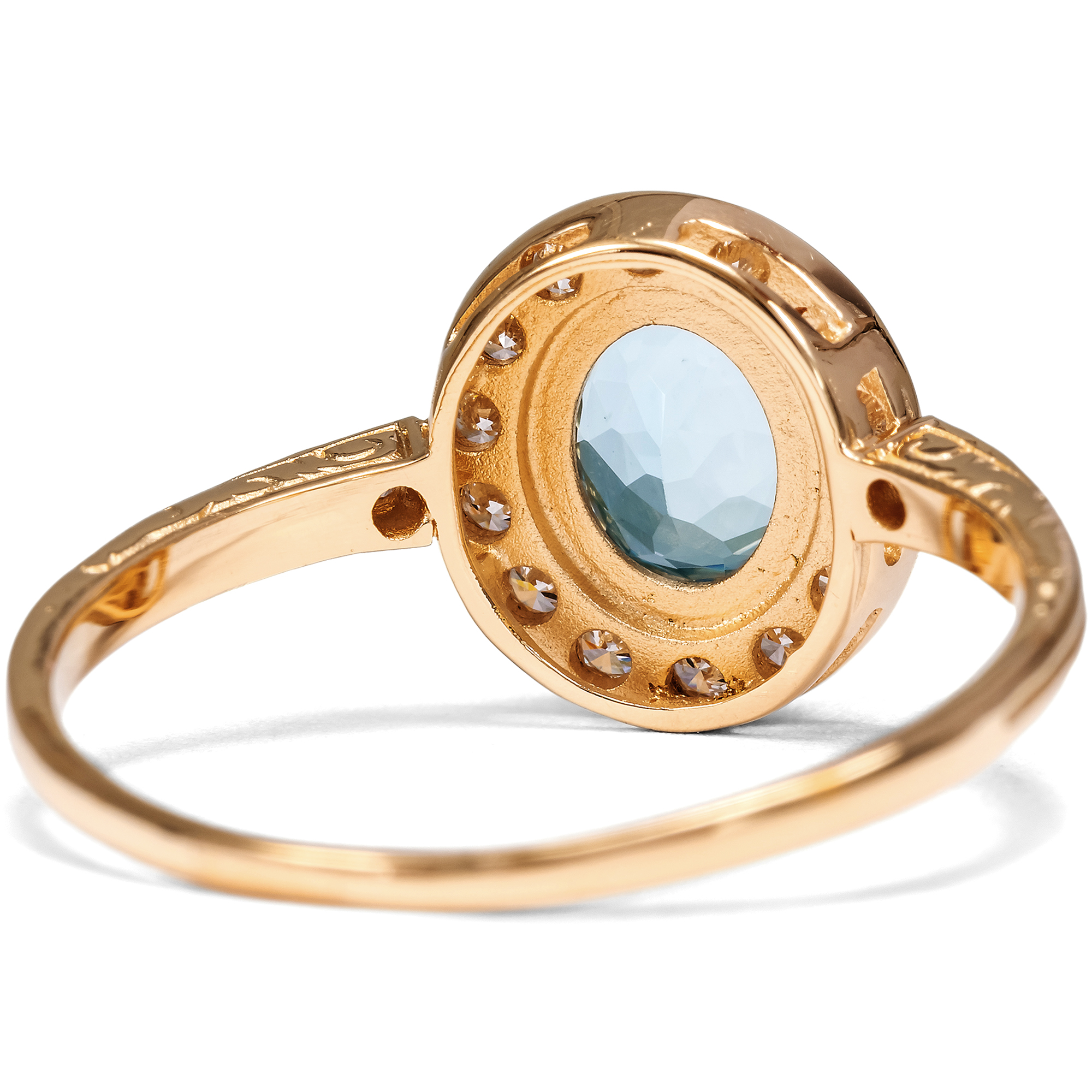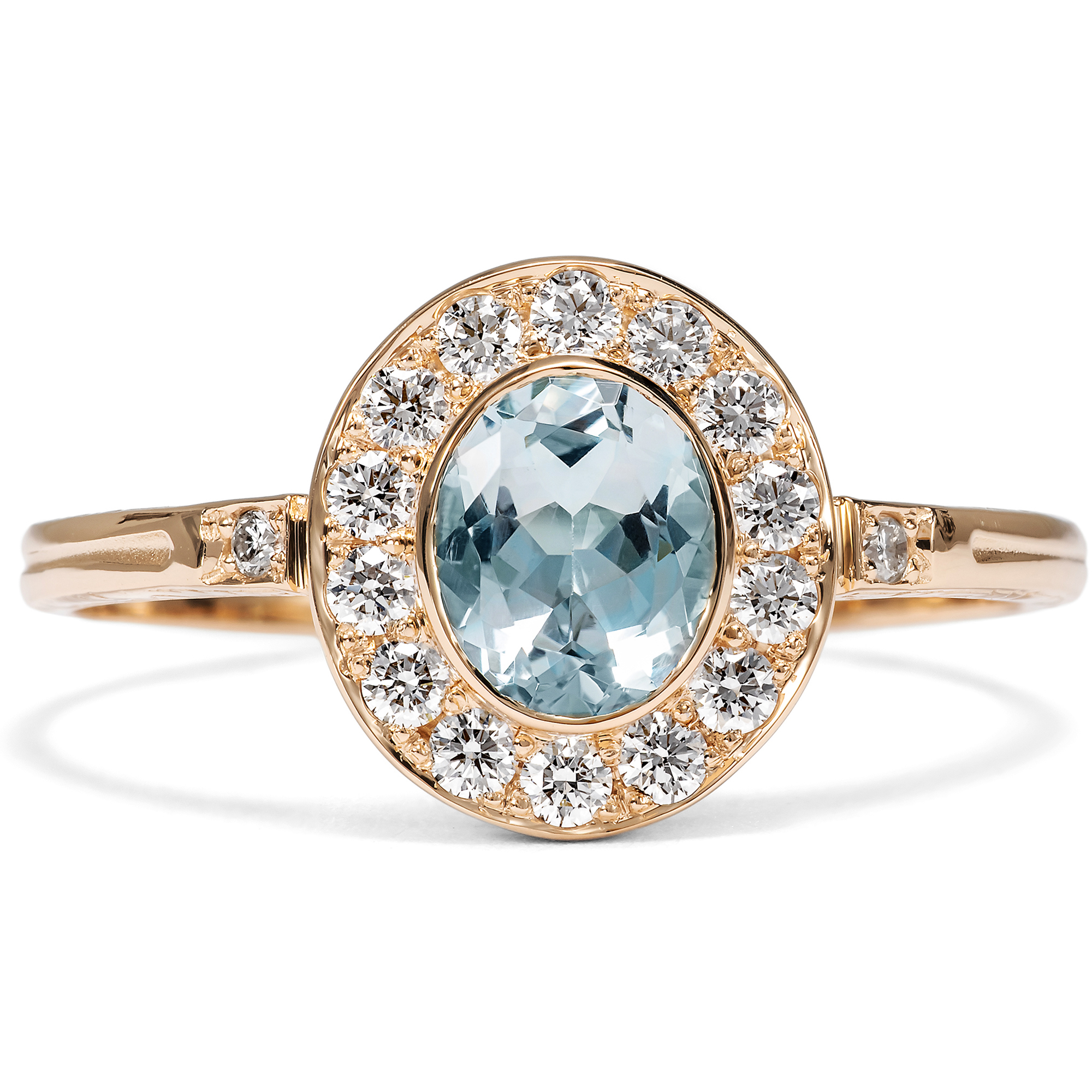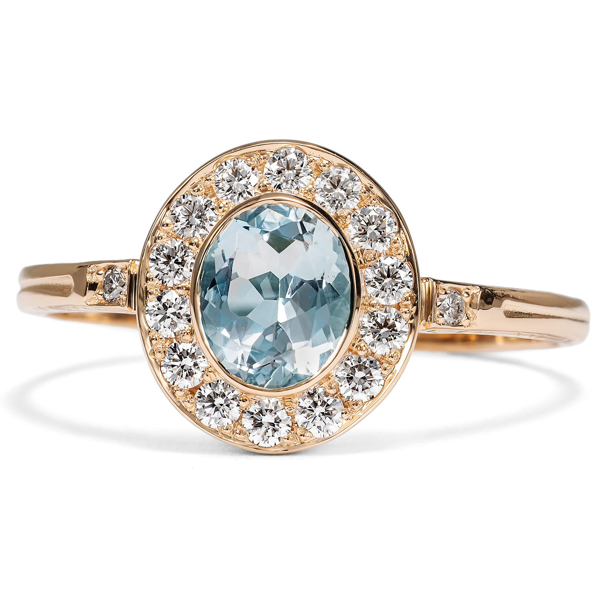 This ring from our workshop is a classic cluster ring, presenting a choice gemstone within a halo of diamonds. We encounter this timeless design throughout the centuries, always adapted to the latest fashion. In this ring from our workshop, a natural aquamarine forms the centerpiece of the design. The gemstone has a beautiful, clear, light blue color and is reminiscent of a bright summer sky. Fourteen brilliant-cut diamonds of very good quality and rare white line the center stone and surround it with festive sparkle. Two more diamonds adorn the ring shoulders. A total of 0.24 carats of diamonds have come together here. All gemstones are set in warm, shiny, high-carat rose gold. We have designed the ring to be extremely comfortable to wear. Due to its low design and the gemstone settings without distracting prongs, the ring can be worn every day without any problems. The ring shoulders are decorated on the sides with delicate ornaments based on models from around 1890; all parts are kept as fine and delicate as possible to draw the eye to the beauty of the gemstones. The ring was made for us entirely in Germany, in workshops in Pforzheim, Idar-Oberstein and here in Berlin. This is the first time the gemstones have been used in a piece of jewellery.