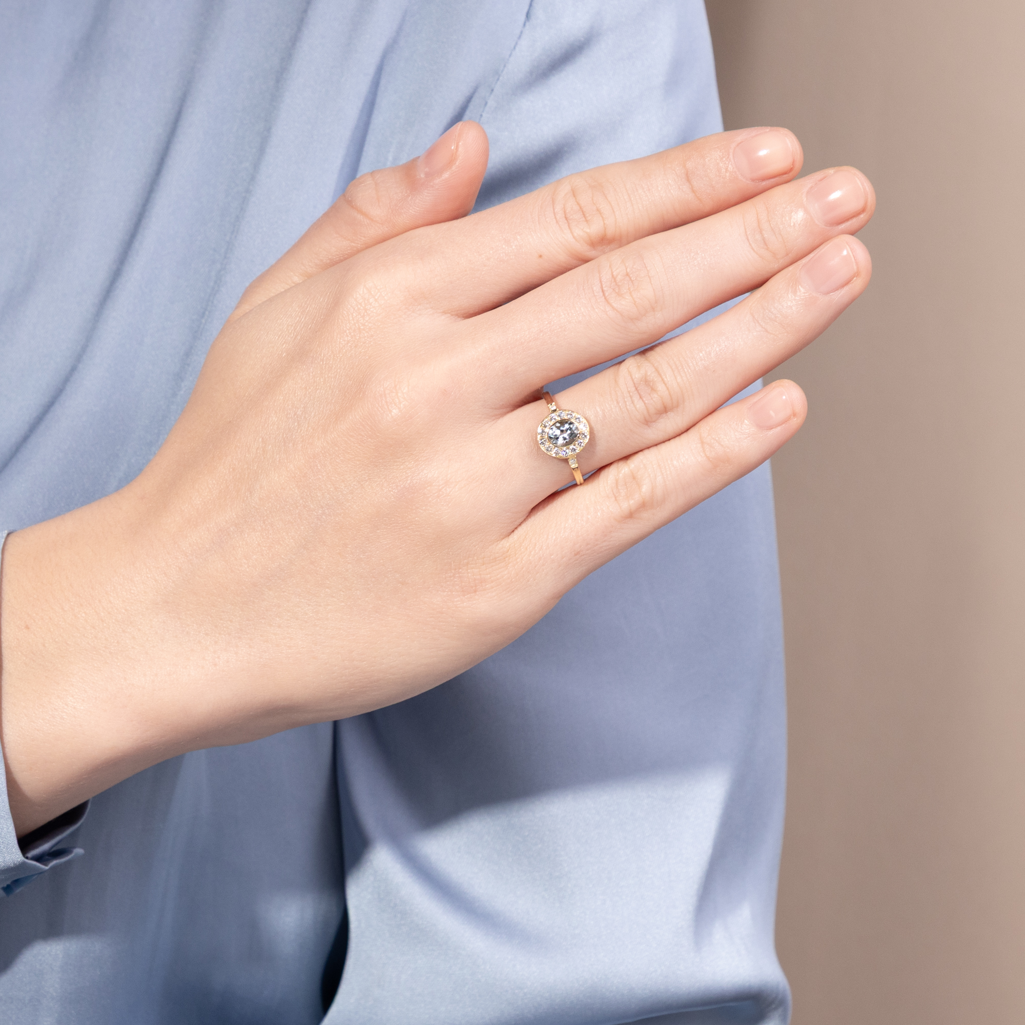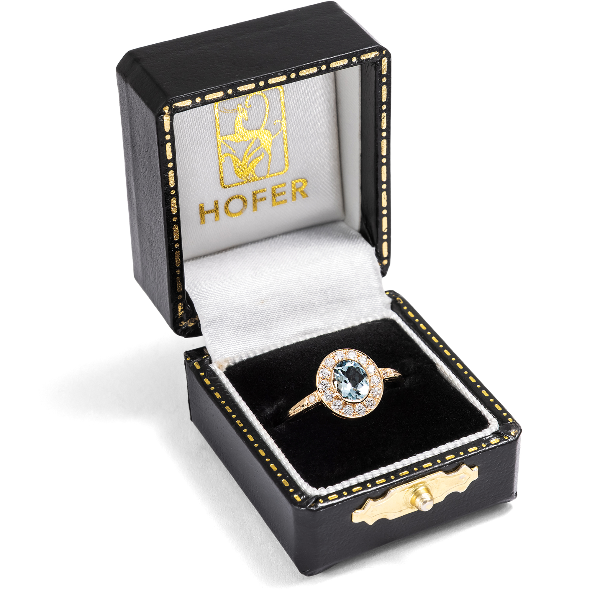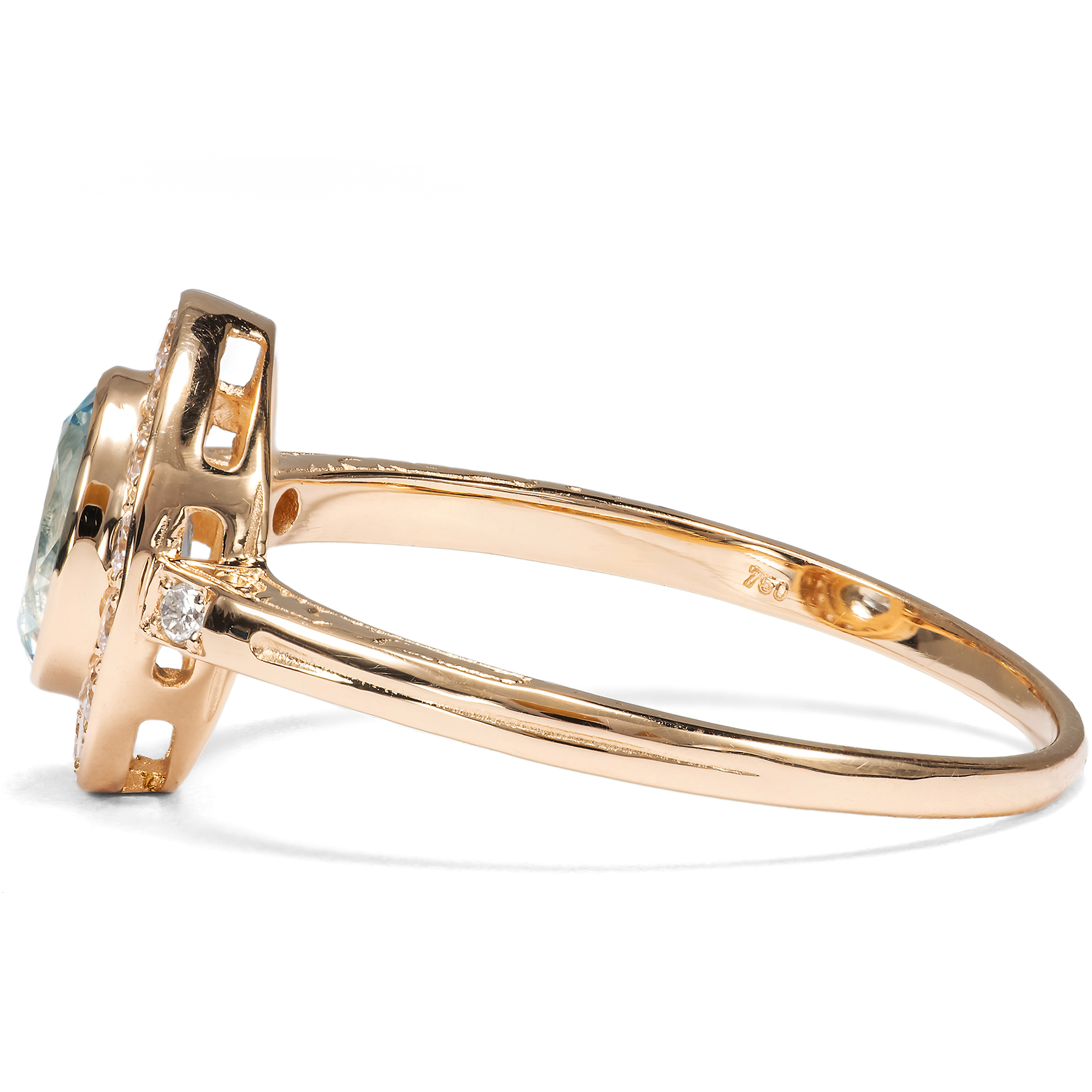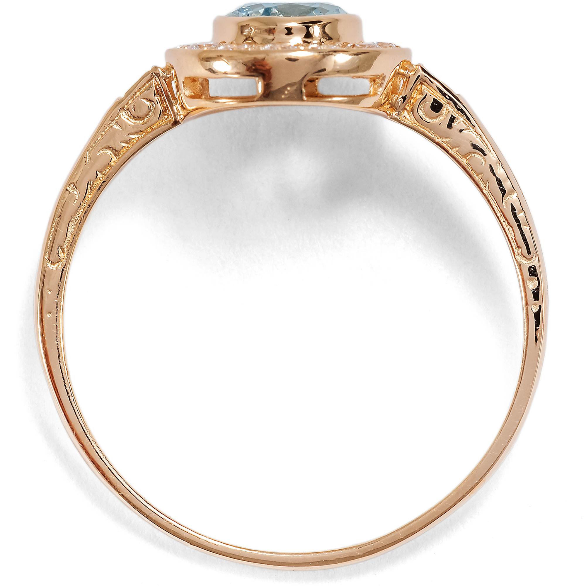 This ring from our workshop is a classic cluster ring, presenting a choice gemstone within a halo of diamonds. We encounter this timeless design throughout the centuries, always adapted to the latest fashion. In this ring from our workshop, a natural aquamarine forms the centerpiece of the design. The gemstone has a beautiful, clear, light blue color and is reminiscent of a bright summer sky. Fourteen brilliant-cut diamonds of very good quality and rare white line the center stone and surround it with festive sparkle. Two more diamonds adorn the ring shoulders. A total of 0.24 carats of diamonds have come together here. All gemstones are set in warm, shiny, high-carat rose gold. We have designed the ring to be extremely comfortable to wear. Due to its low design and the gemstone settings without distracting prongs, the ring can be worn every day without any problems. The ring shoulders are decorated on the sides with delicate ornaments based on models from around 1890; all parts are kept as fine and delicate as possible to draw the eye to the beauty of the gemstones. The ring was made for us entirely in Germany, in workshops in Pforzheim, Idar-Oberstein and here in Berlin. This is the first time the gemstones have been used in a piece of jewellery.