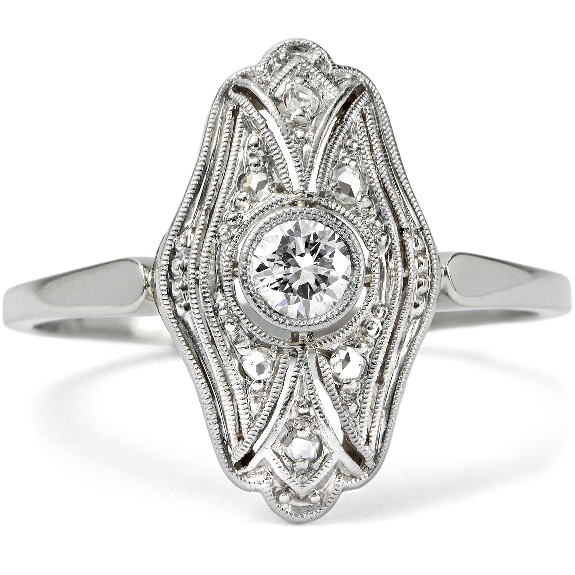 White jewellery was considered the ideal of the late 19th and early 20th century. The newly introduced electric light made diamonds shine with an unprecedented brilliance, while new precious metals such as platinum and later white gold further enhanced the brilliance of the white stones. This ring is also completely bathed in white light. The geometrically structured ring face is open-worked and reminiscent of fine lace ornaments. In the center sparkles a 0.17 ct diamond in the so-called transitional cut, the direct predecessor of today's brilliant cut. It is held in place by frames with milgrains. A fine shadow gap separates the stone from the surrounding surface. Further small diamonds are set here, lending the ring additional vibrancy. Typical of the time, the ring face and shoulders are platinum-plated, while the lower band and shank are made of white gold. The ring is in excellent condition and is a precisely crafted, delicate white jewel from around 1935.