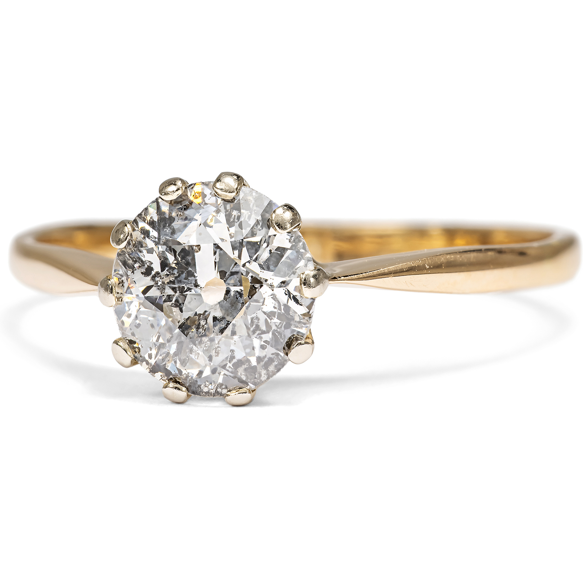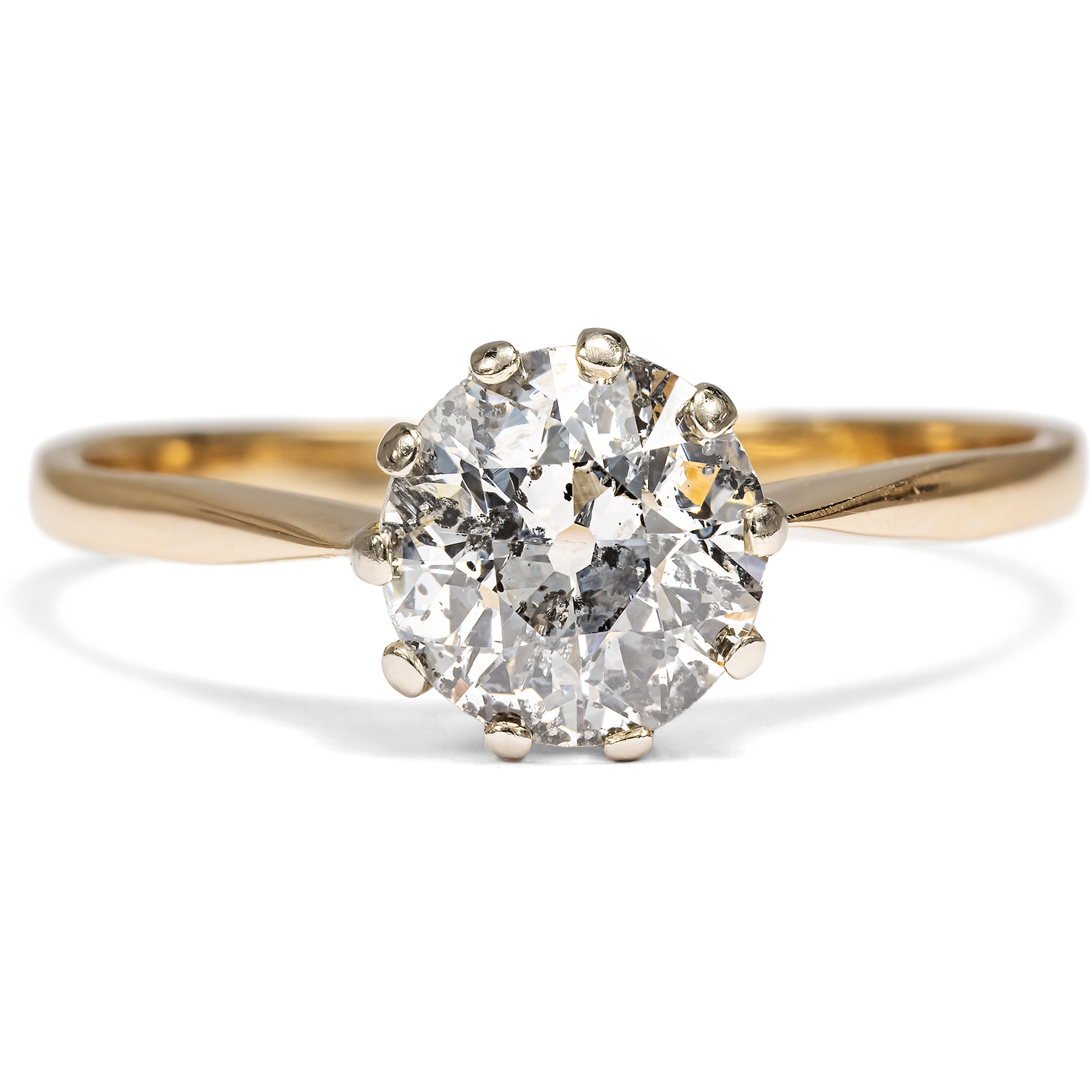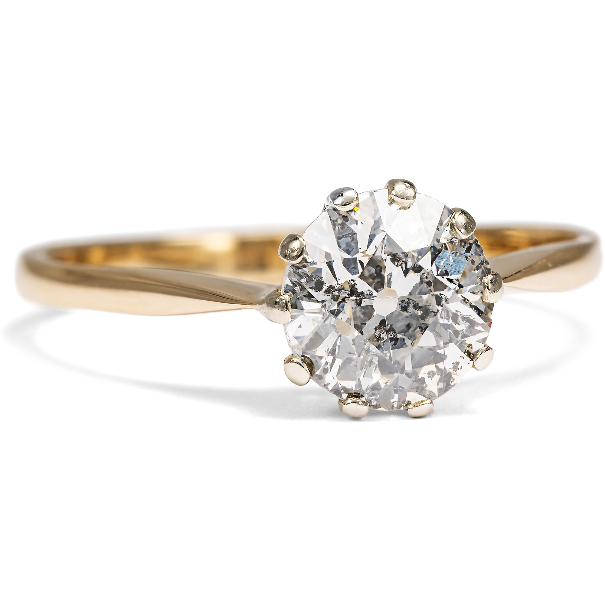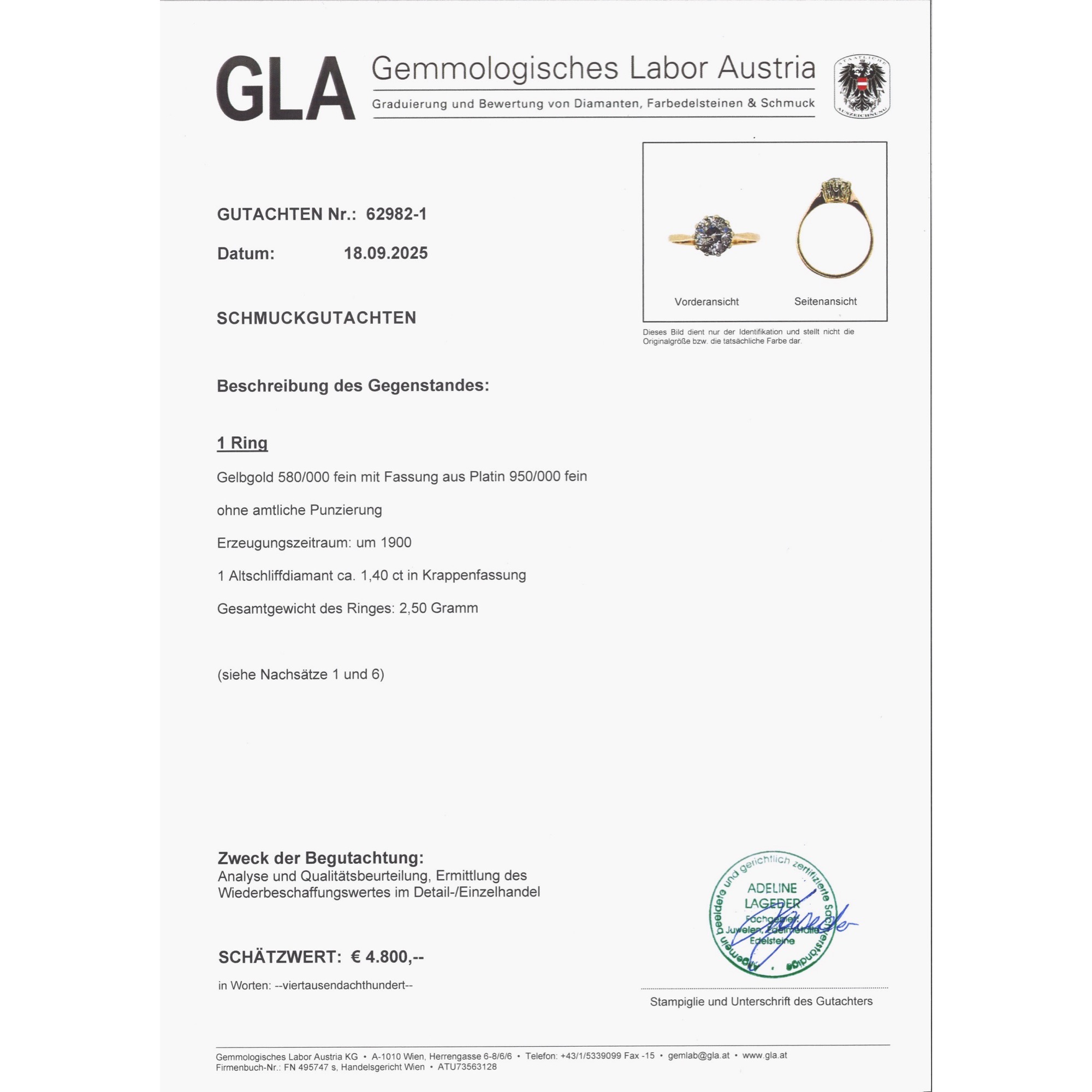"Even if the preferred gemstones change and only after years celebrate their resurrection as the ladies' favorite - the brilliant has never lost its position, evenly as its impeccably clear fire it outlasts all currents of fashion. It is therefore understandable that so many secretly desire rings with diamonds..." (From a jewelry brochure of the 1930s) Hardly any other piece of jewellery has the special meaning and deep symbolism of a diamond ring. As a sign of everlasting love and connection, the hardest mineral on earth has been worn for centuries and will certainly never go out of fashion in the future. We are therefore delighted to be able to present a diamond ring here, the simple beauty of which inspires us. The elegant ring in polished, slightly reddish gold sets a sparkling old-cut diamond in a platinum setting with ten prongs. The 1.40 ct diamond has a very good color and has been graded as "rare white+" (F). Its interior is structured by clear graphite inclusions, which make the diamond unique. Looking into the stone with a magnifying glass is reminiscent of a kaleidoscope; each of the inclusions is reflected in the stone and multiplied an infinite number of times. The classic engagement ring from the c. 1900s has always been worn with pleasure. To ensure that it continues to be a reliable companion, the prongs have been reworked and reinforced in more recent times. An independent expert opinion has confirmed the quality of the materials used.