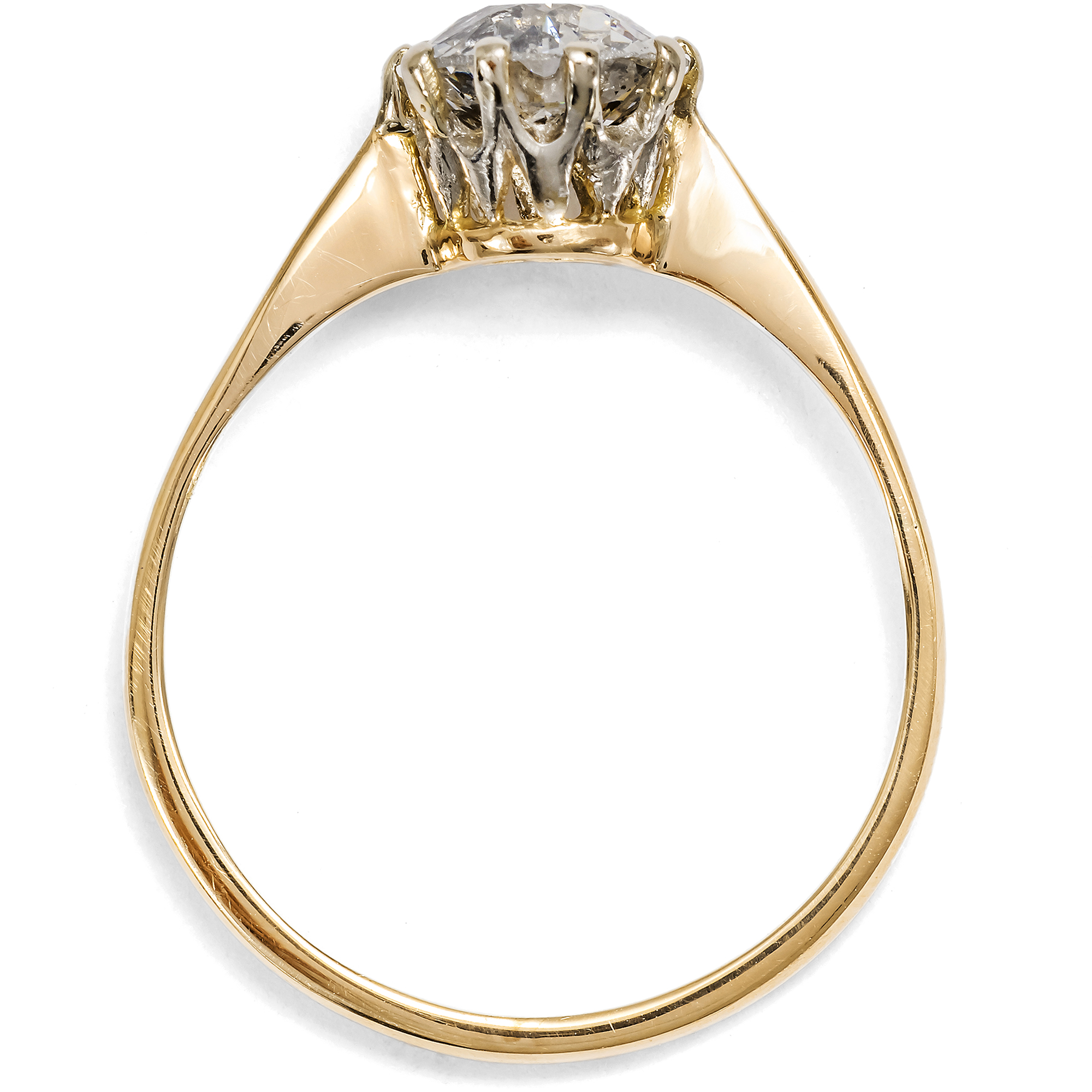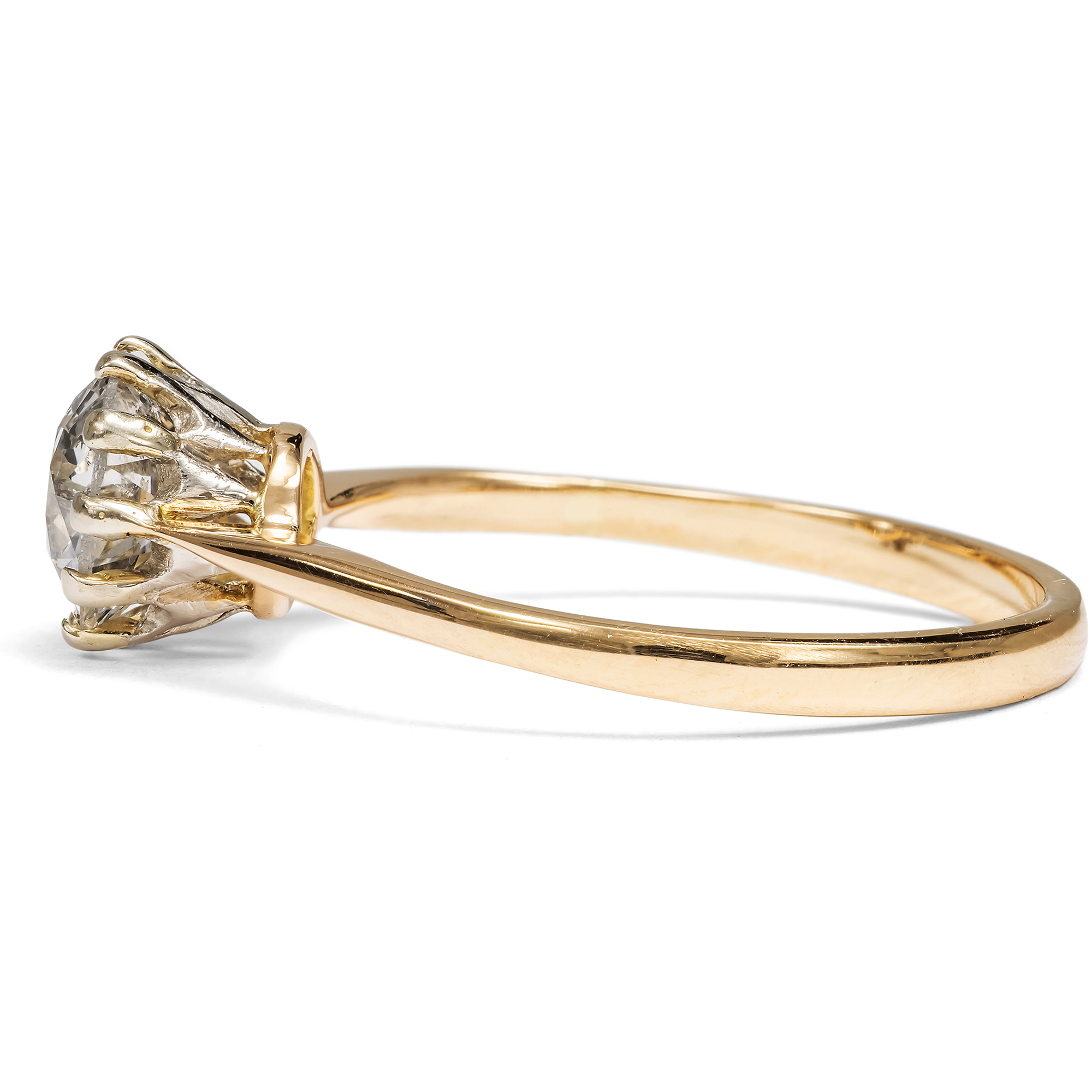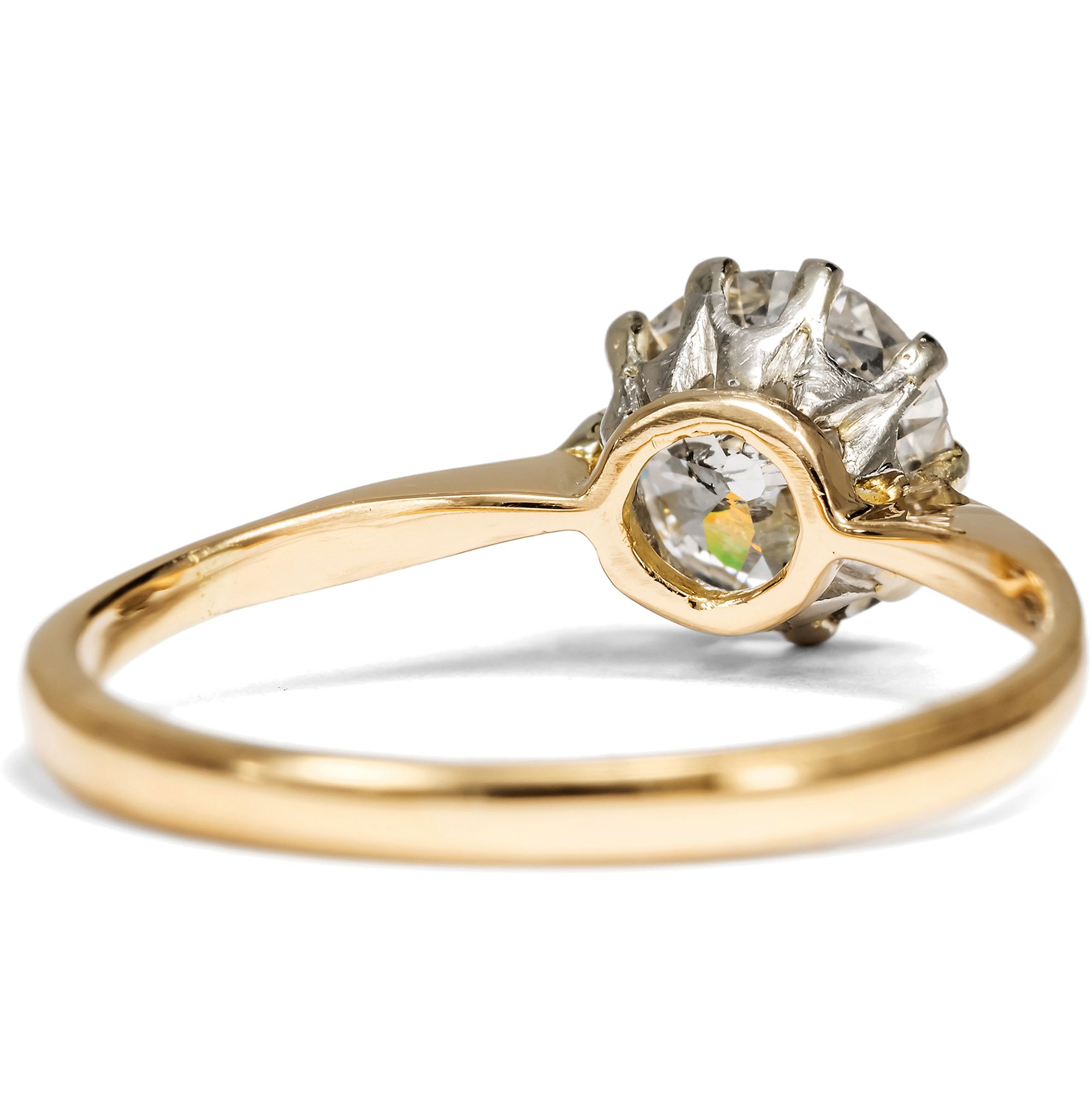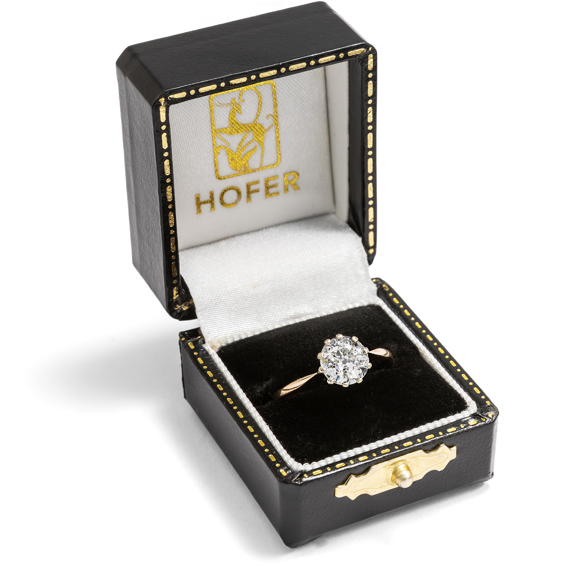 "Even if the preferred gemstones change and only after years celebrate their resurrection as the ladies' favorite - the brilliant has never lost its position, evenly as its impeccably clear fire it outlasts all currents of fashion. It is therefore understandable that so many secretly desire rings with diamonds..." (From a jewelry brochure of the 1930s) Hardly any other piece of jewellery has the special meaning and deep symbolism of a diamond ring. As a sign of everlasting love and connection, the hardest mineral on earth has been worn for centuries and will certainly never go out of fashion in the future. We are therefore delighted to be able to present a diamond ring here, the simple beauty of which inspires us. The elegant ring in polished, slightly reddish gold sets a sparkling old-cut diamond in a platinum setting with ten prongs. The 1.40 ct diamond has a very good color and has been graded as "rare white+" (F). Its interior is structured by clear graphite inclusions, which make the diamond unique. Looking into the stone with a magnifying glass is reminiscent of a kaleidoscope; each of the inclusions is reflected in the stone and multiplied an infinite number of times. The classic engagement ring from the c. 1900s has always been worn with pleasure. To ensure that it continues to be a reliable companion, the prongs have been reworked and reinforced in more recent times. An independent expert opinion has confirmed the quality of the materials used.