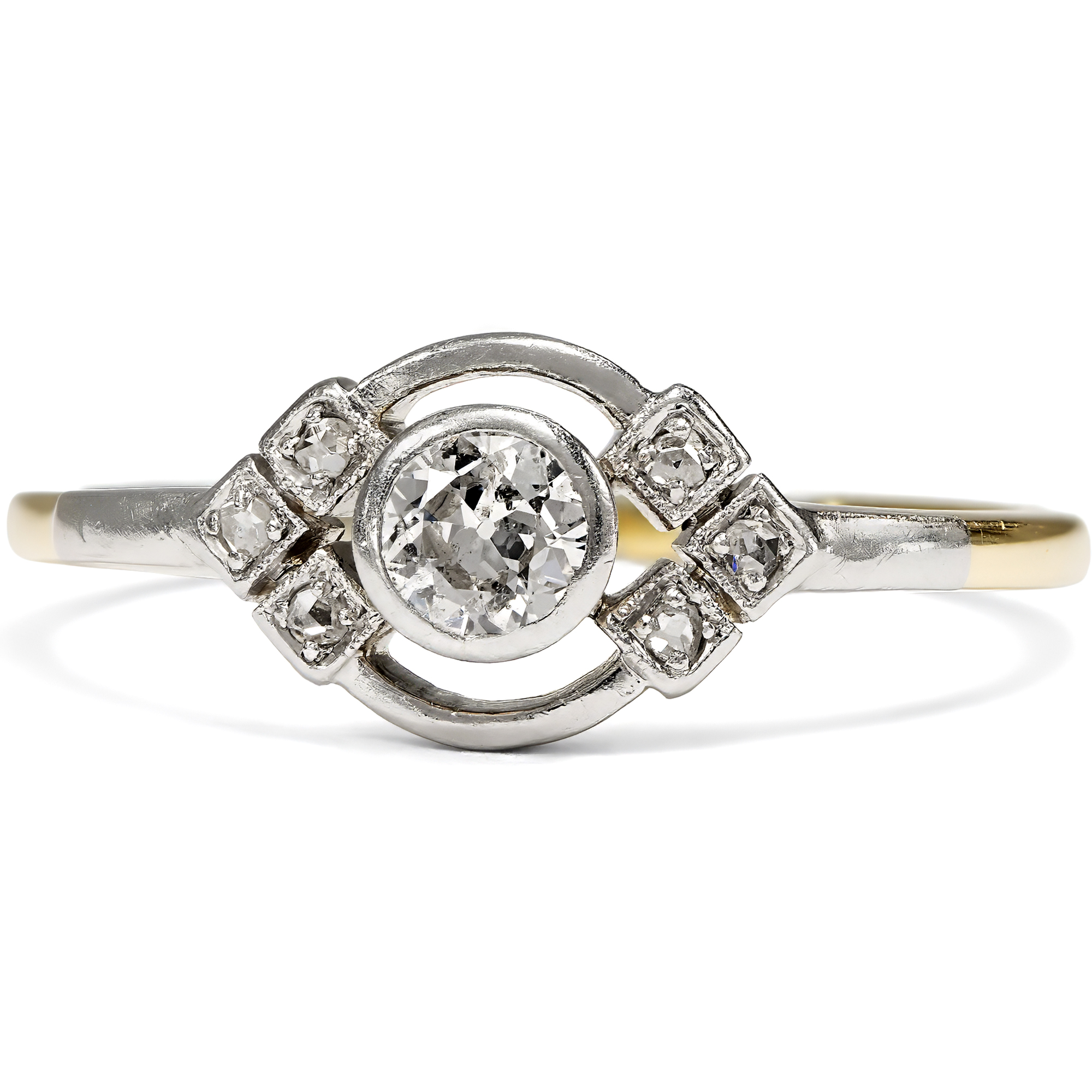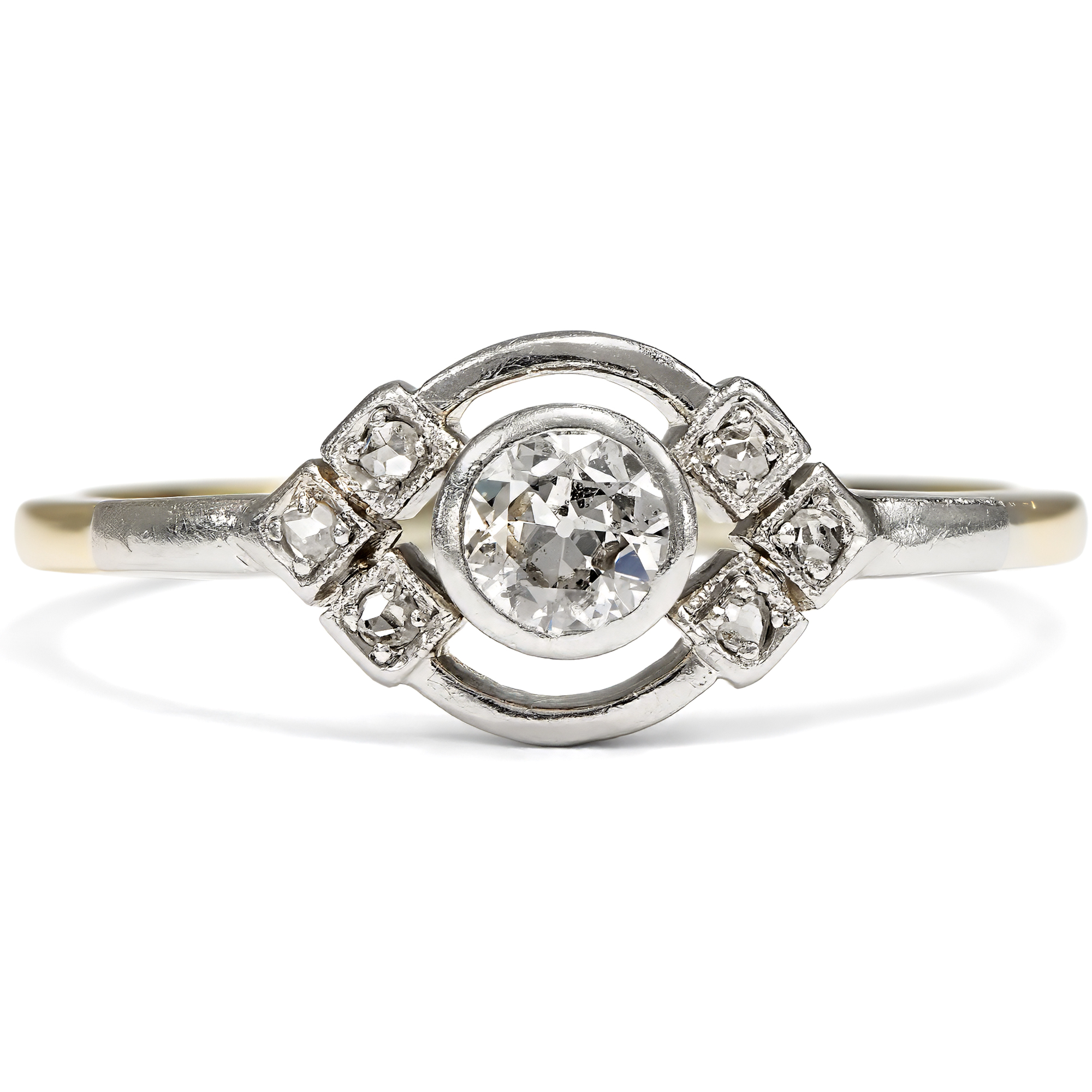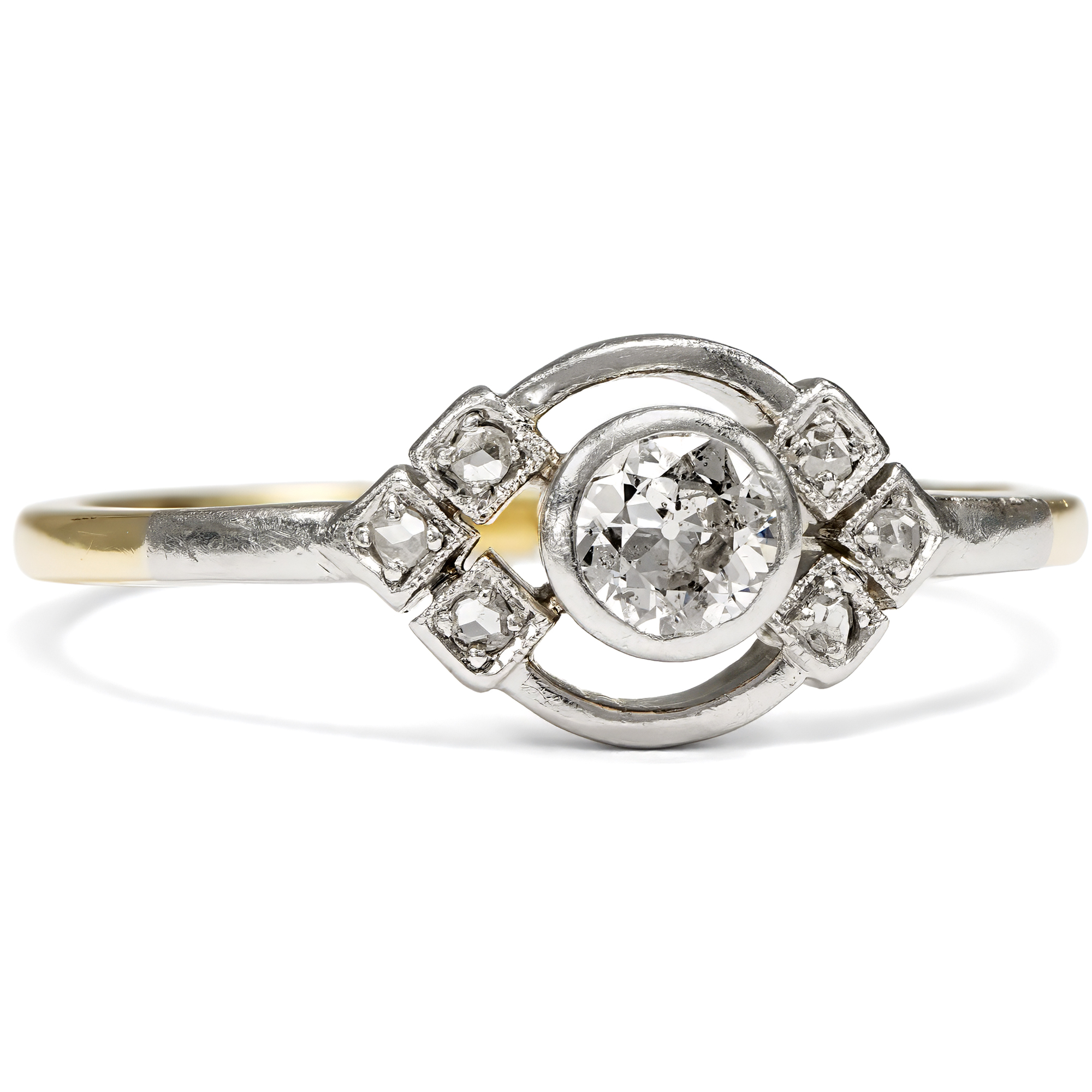 With the spread of electric light at the end of the 19th century, the ballrooms were suddenly filled with dazzling brightness. No more flickering candlelight or yellowish gaslight, but the white glow of hundreds of lamps made the ladies' jewellery shine and sparkle like never before. As a result, white platinum jewels set with diamonds conquered the hearts of ladies and the shop windows of jewelers. "White is the watchword today, white is fashion," said the Leipzig Watchmaker's Newspaper in 1912 about the current jewellery fashions. This ring is a small, delicate representative of this fashion. It is made of gold with a thin layer of platinum on the front - as was customary at the time, as the price of solid platinum was exorbitant. A round old-cut diamond sparkles in the center of the ring. It is surrounded by a narrow frame, on the sides of which a total of six diamonds have been composed into geometric groups. The delicate ring came to us from Cologne. Its fine but minimalist design captures the modern spirit of the years c. 1910 wonderfully and shows the basis on which the Art Déco of the following decades was able to take root.
