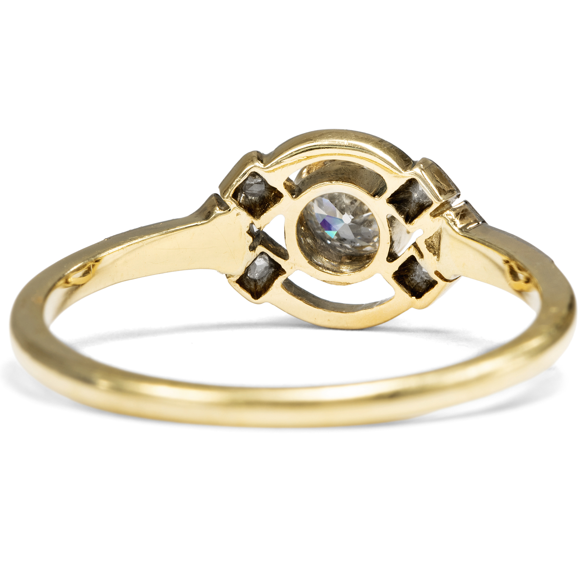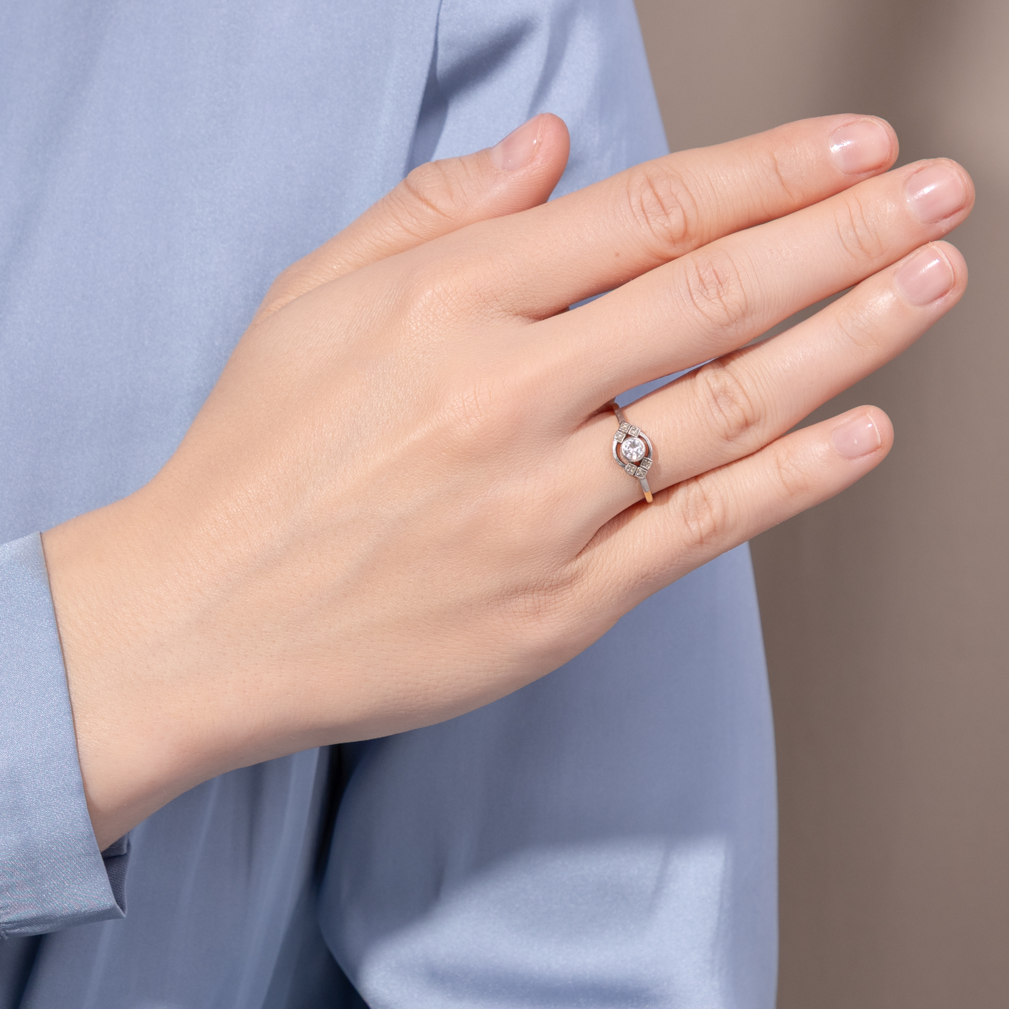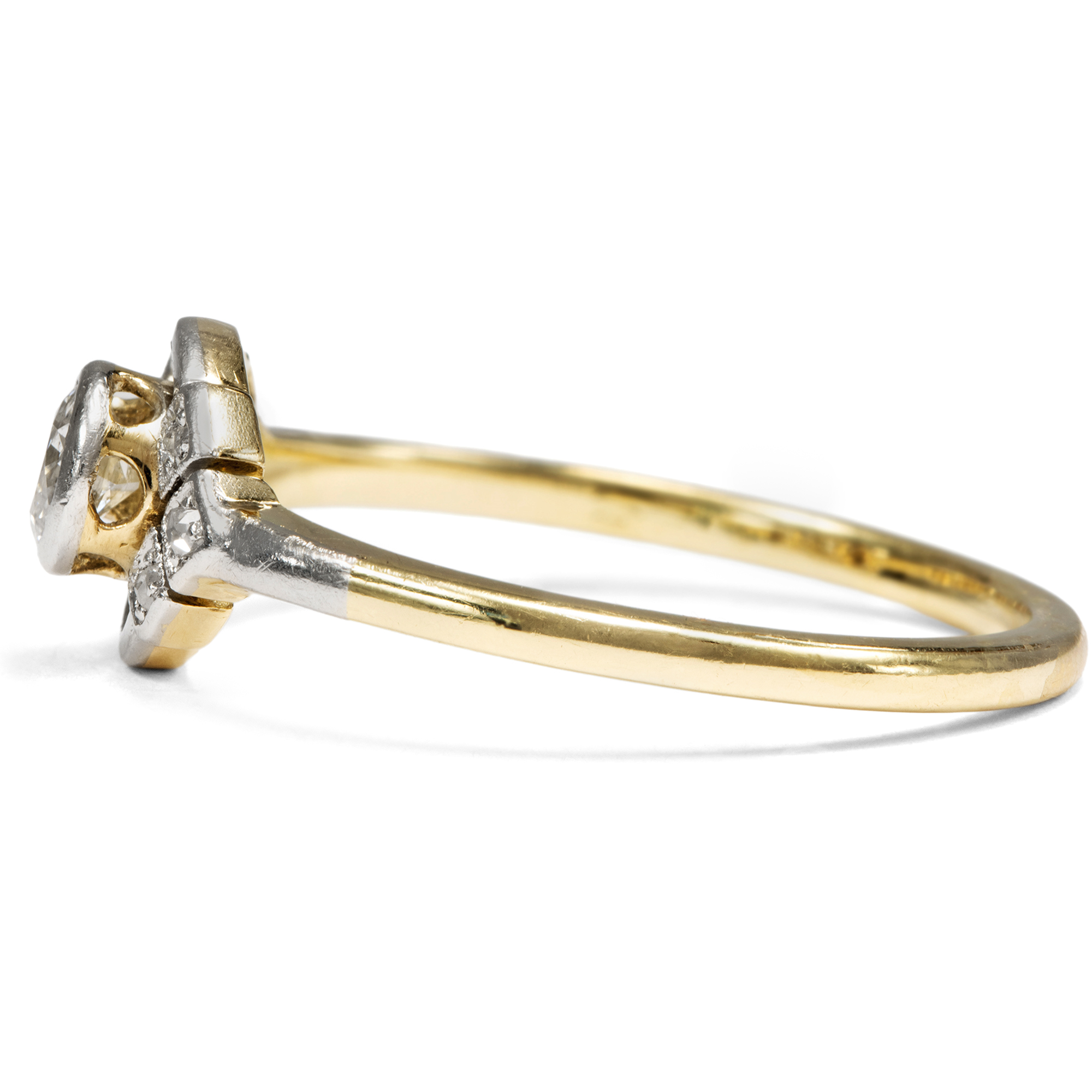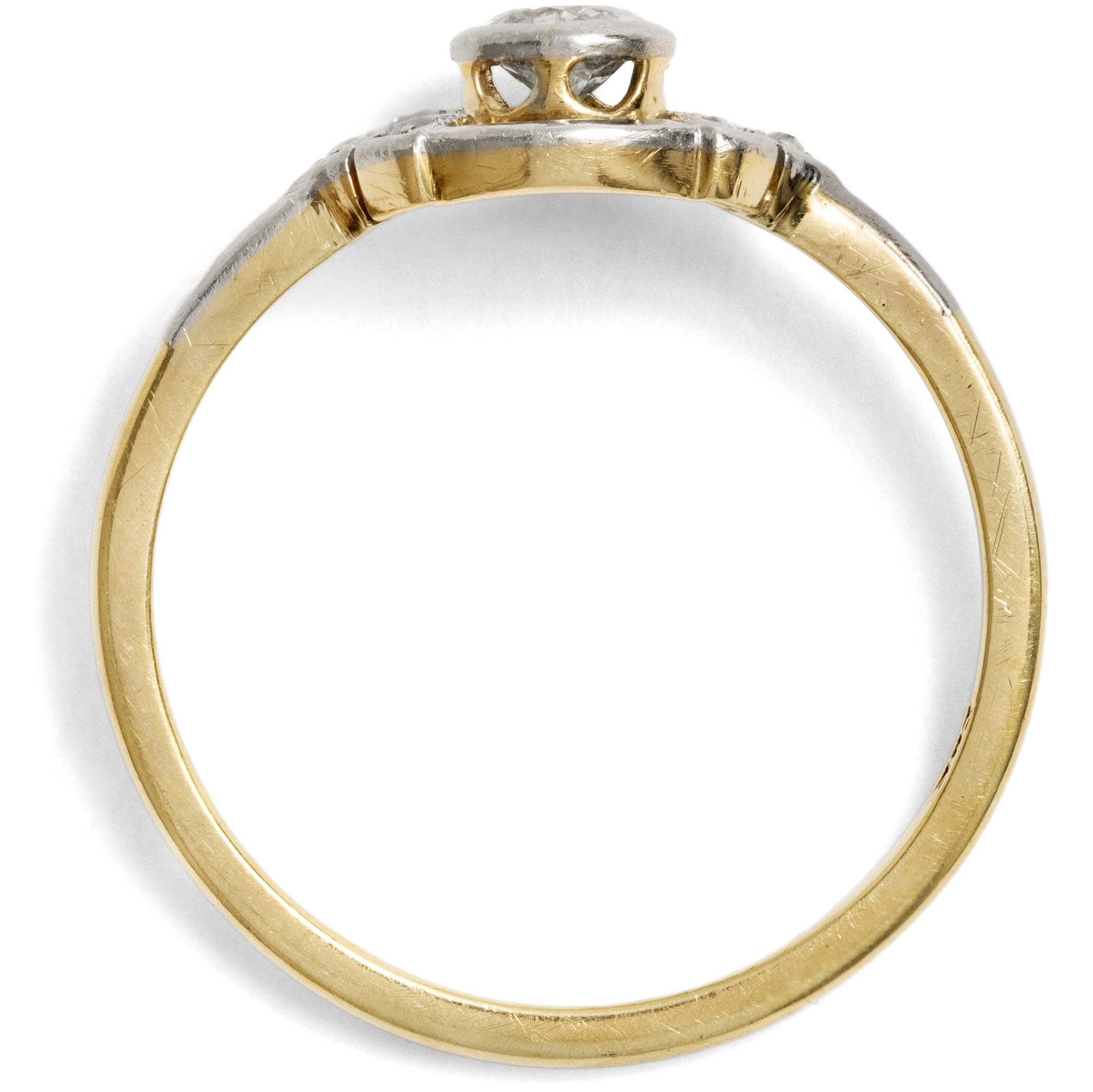With the spread of electric light at the end of the 19th century, the ballrooms were suddenly filled with dazzling brightness. No more flickering candlelight or yellowish gaslight, but the white glow of hundreds of lamps made the ladies' jewellery shine and sparkle like never before. As a result, white platinum jewels set with diamonds conquered the hearts of ladies and the shop windows of jewelers. "White is the watchword today, white is fashion," said the Leipzig Watchmaker's Newspaper in 1912 about the current jewellery fashions. This ring is a small, delicate representative of this fashion. It is made of gold with a thin layer of platinum on the front - as was customary at the time, as the price of solid platinum was exorbitant. A round old-cut diamond sparkles in the center of the ring. It is surrounded by a narrow frame, on the sides of which a total of six diamonds have been composed into geometric groups. The delicate ring came to us from Cologne. Its fine but minimalist design captures the modern spirit of the years c. 1910 wonderfully and shows the basis on which the Art Déco of the following decades was able to take root.