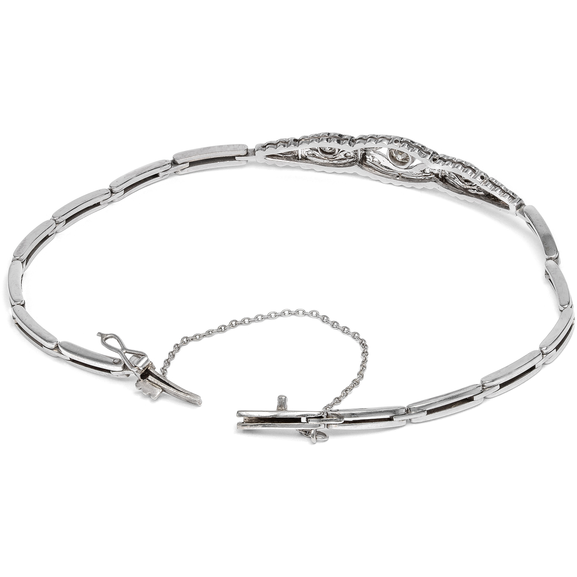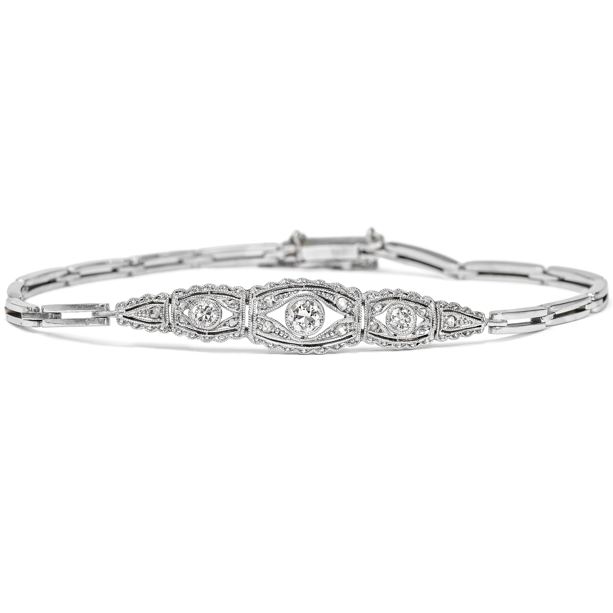 Whether Moscow, Paris or Berlin - at the beginning of the 20th century, the fashions of the great metropolises were similar. The metropolitan industrialists, the old aristocracy, the jeunesse dorée: they were all able to wear their elegantly tailored dresses and suits, as well as their jewellery, in all the major cities of Europe and even North America. This bracelet speaks this glamorous, metropolitan design language. Three old-cut diamonds sparkle in the center of the design. Delicate platinum prongs hold them in place. A curved frame, set with small rose cut diamonds, stretches around the arrangement, which is divided into five sections. An almost minimalist, fine band is attached to the side. All parts are made of white gold. The front of the middle section is also platinum-plated, creating a white look when worn - just as one would expect from evening jewelry in particular. A hallmark on the clasp shows that the bracelet was most likely made in Germany. However, its first wearer could have admired very similar designs not only in Berlin on Kurfürstendamm, but also in the Rue de la Paix in Paris, in London or even in Moscow. The use of white gold shows that the bracelet was probably created in the 1920s. A beautiful and wearable piece of jewelry history that tells of the globalization of elegant taste.