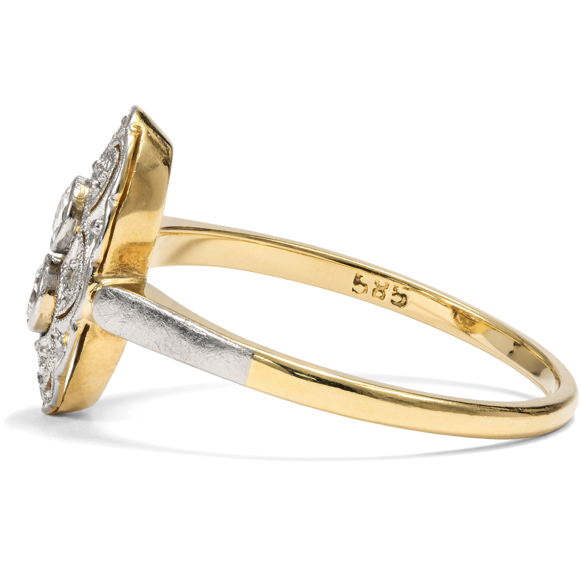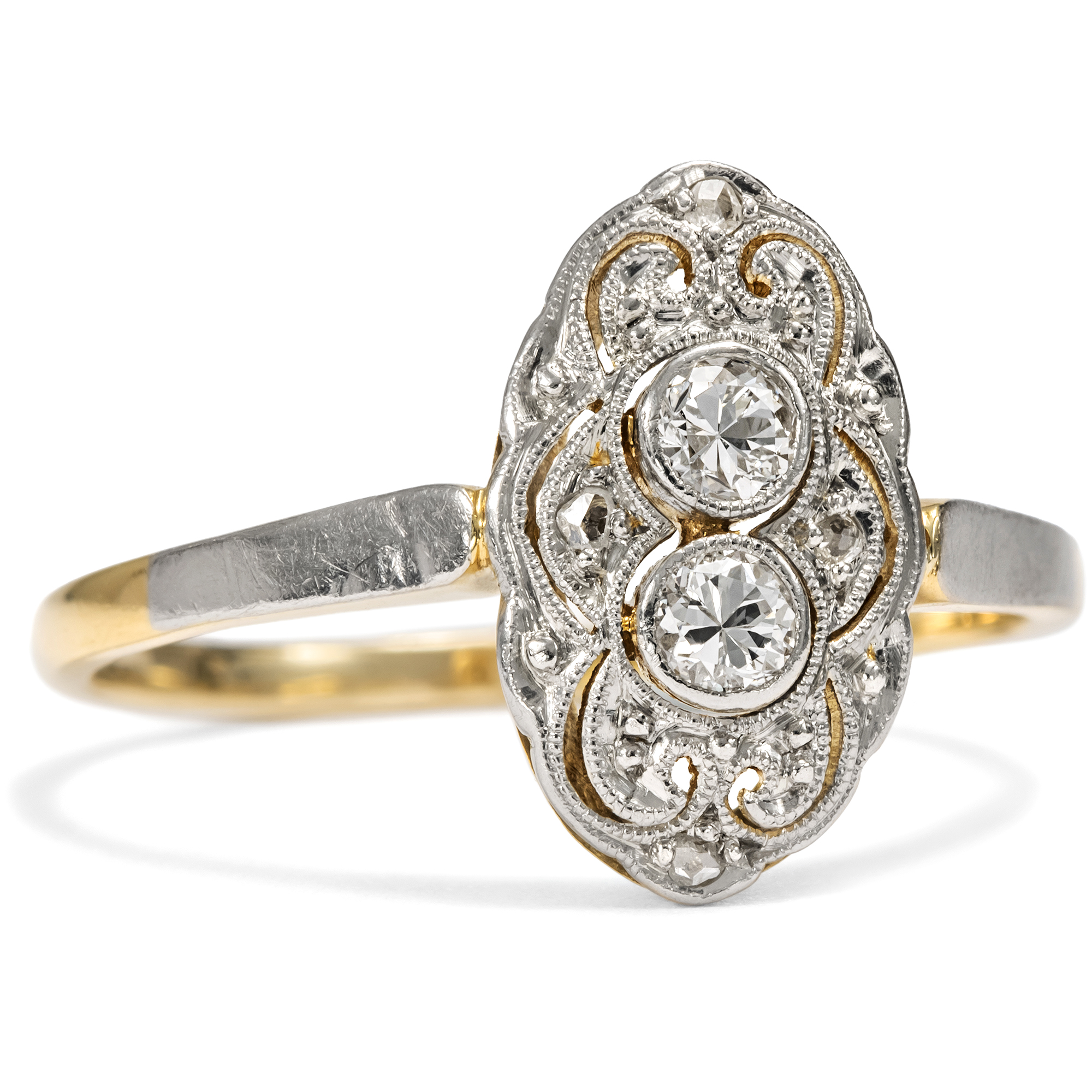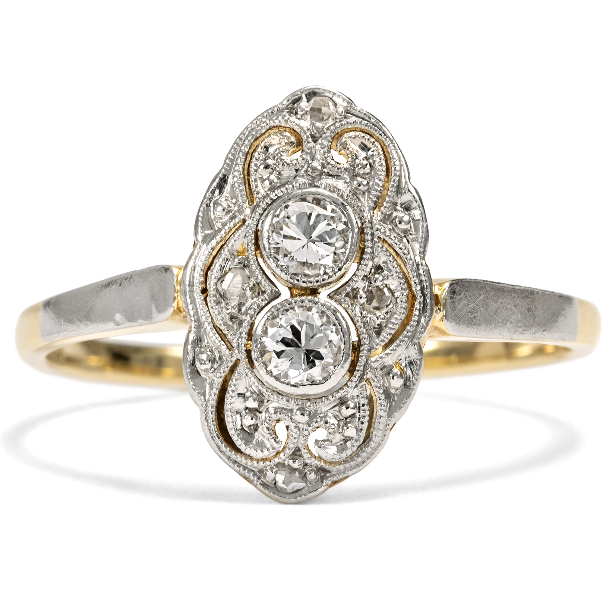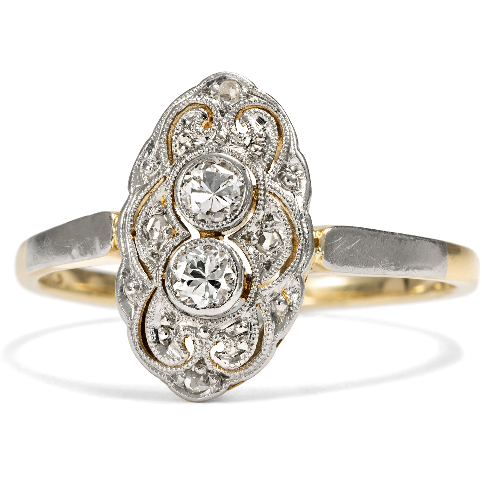 The jewellery fashions of the first decades after 1900 in continental Europe knew only one color: white. The shapes became ever lighter, more delicate, even ethereal. In particular, the increasingly widespread use of platinum made it possible to create ever more delicate structures, with elegant sawn ornaments, sparkling milgrains and always set with diamonds. This ring is a beautiful example of this fashion. At its center, it features two transitional-cut diamonds and four sparkling diamond roses. The entire front is made of platinum, which adds its own cool elegance to the white light of the diamonds. Floral shadow gaps and fine bars structure the front in an elegant symmetry that reveals the formal language of Art Deco. The delicate ring band is made of yellow gold, typical of the period. This gives the ring a certain warmth. The ring came to us from Bremen.