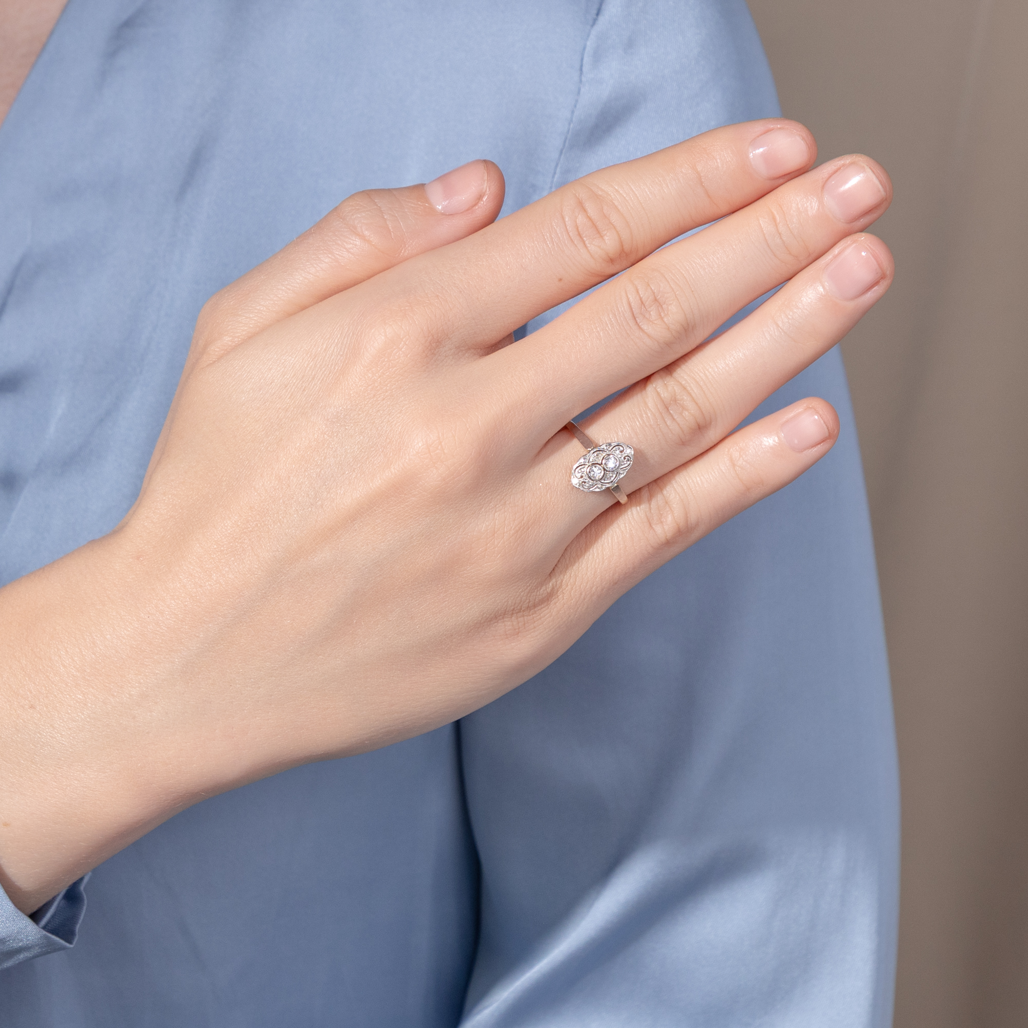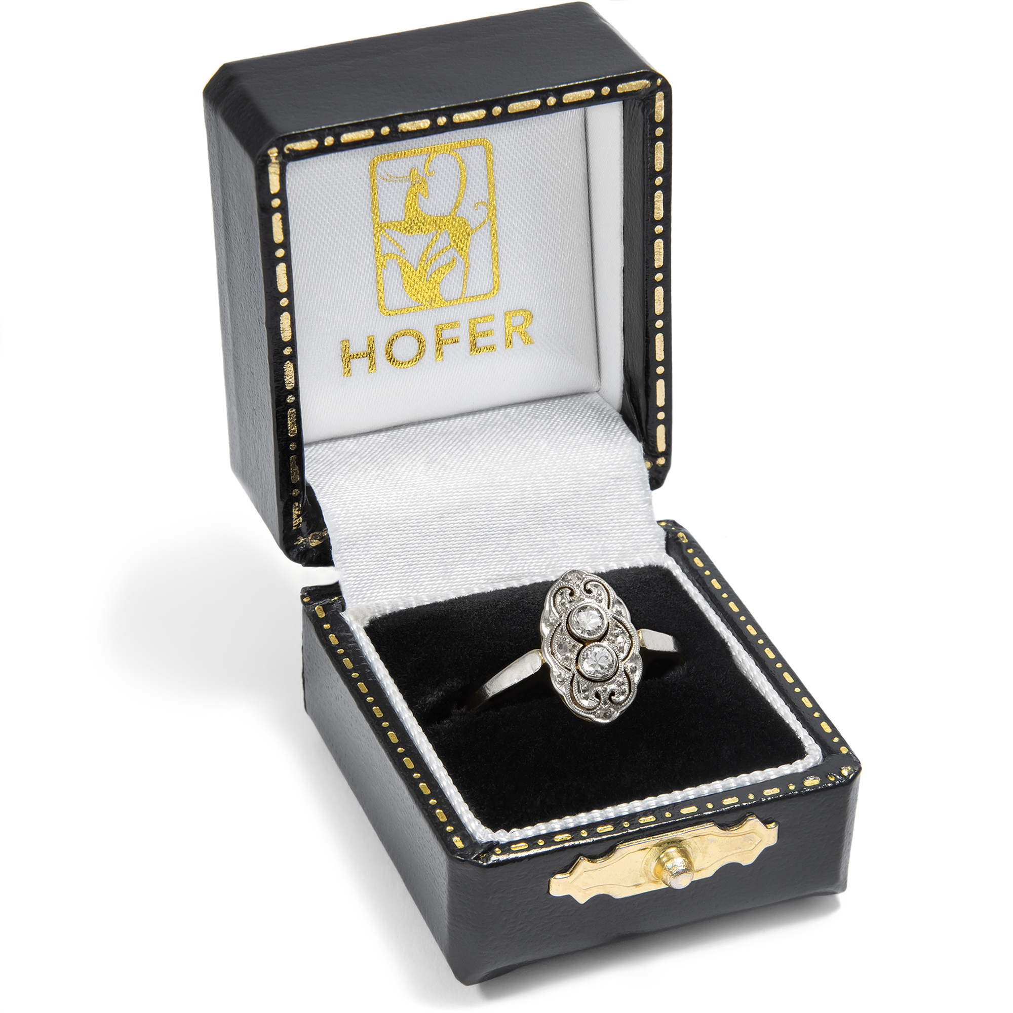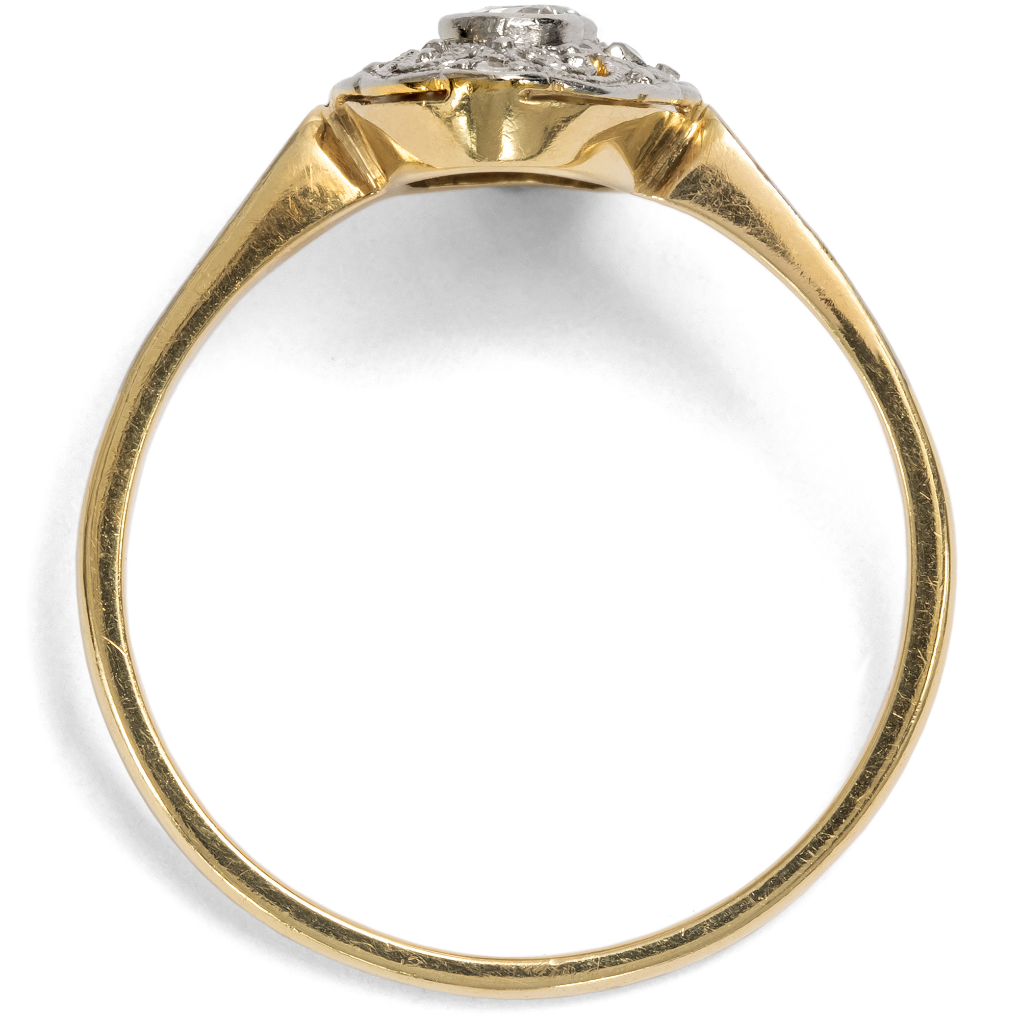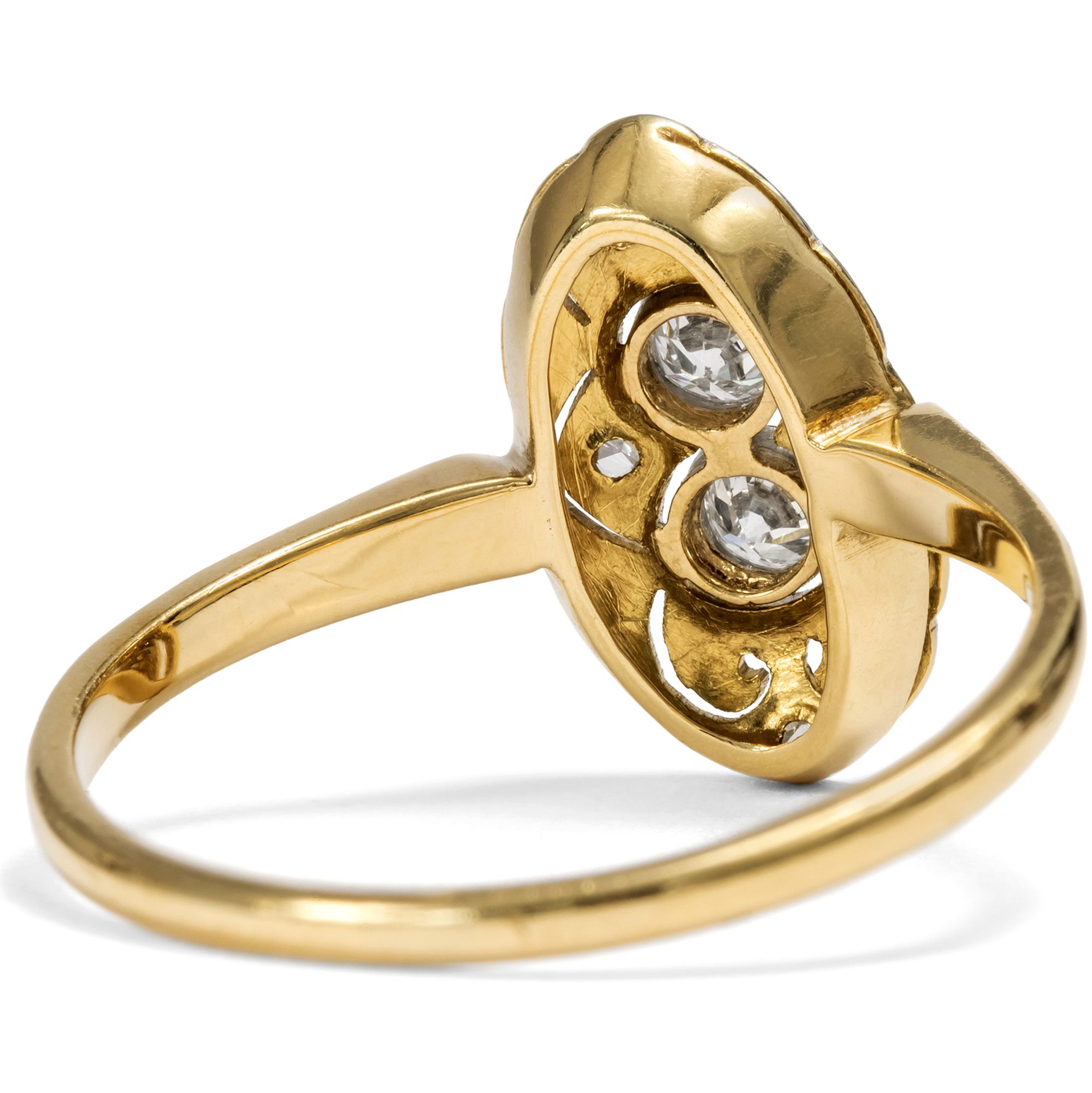 The jewellery fashions of the first decades after 1900 in continental Europe knew only one color: white. The shapes became ever lighter, more delicate, even ethereal. In particular, the increasingly widespread use of platinum made it possible to create ever more delicate structures, with elegant sawn ornaments, sparkling milgrains and always set with diamonds. This ring is a beautiful example of this fashion. At its center, it features two transitional-cut diamonds and four sparkling diamond roses. The entire front is made of platinum, which adds its own cool elegance to the white light of the diamonds. Floral shadow gaps and fine bars structure the front in an elegant symmetry that reveals the formal language of Art Deco. The delicate ring band is made of yellow gold, typical of the period. This gives the ring a certain warmth. The ring came to us from Bremen.