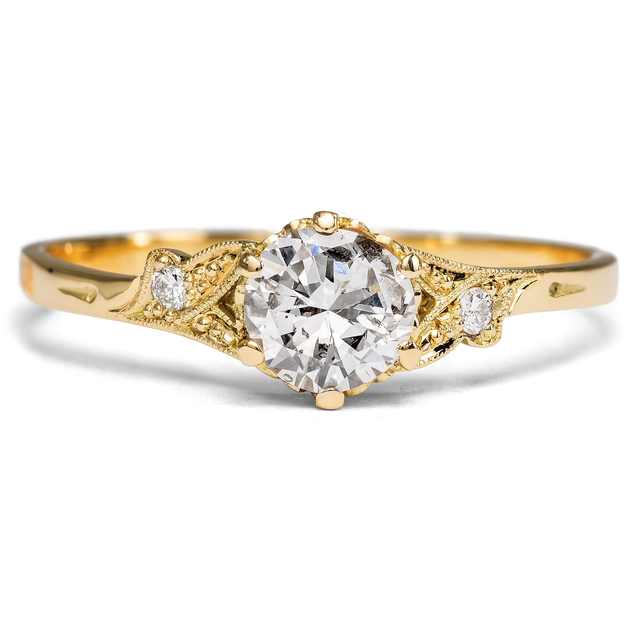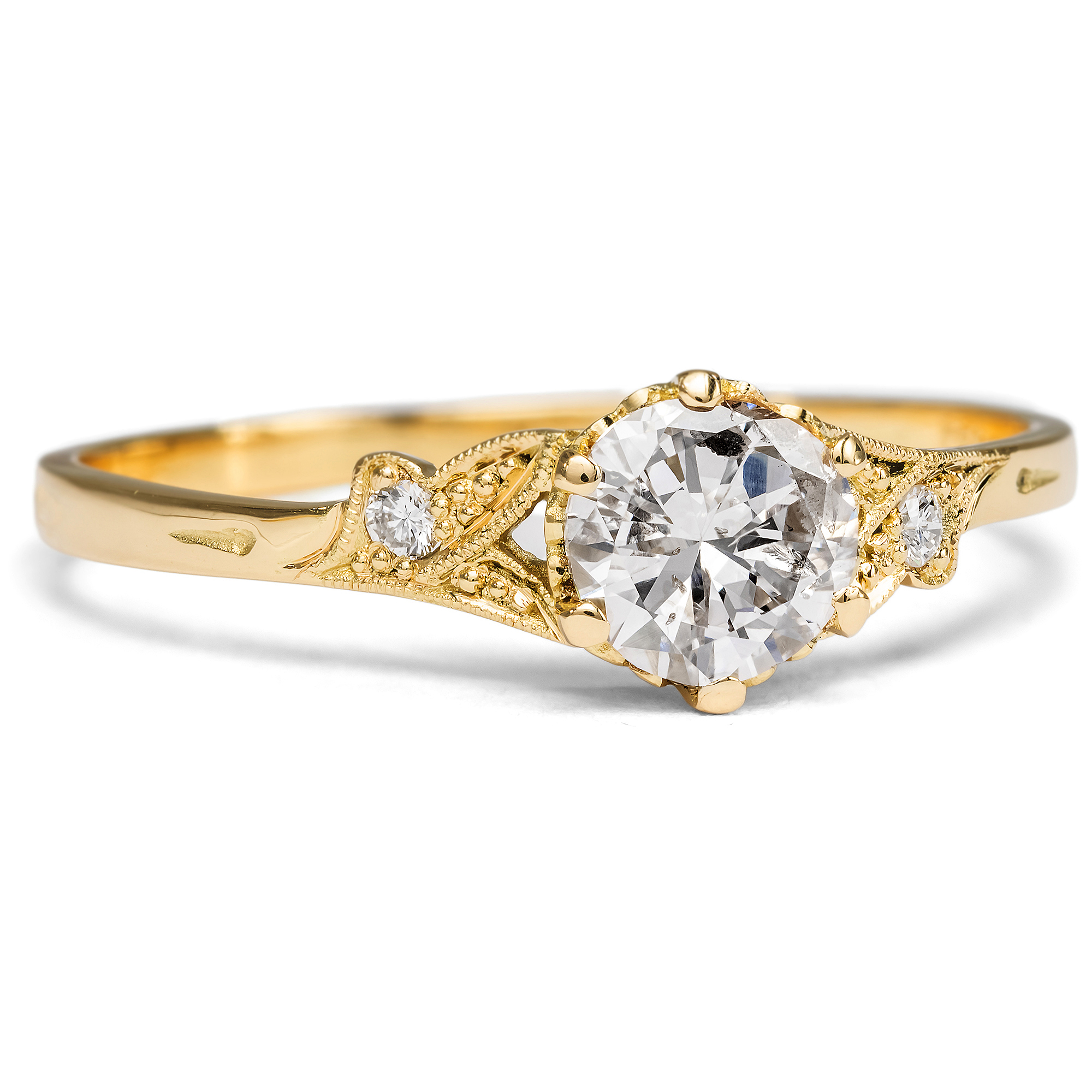 As antique jewellery dealers, our love of antique objects means that we occasionally also buy unmounted gemstones. After all, every historical diamond is an unmistakable one-off with its very own character. However, the search for beautiful settings for our diamonds turned out to be more difficult than expected. Modern ready-made settings, as you can buy them in stores, are often soulless machine products with no feeling for shape and proportion. But beautiful, hand-forged, antique settings rarely come to us without matching diamonds. So we commissioned our goldsmith to make a ring setting according to our design, which we then had cast using an old technique. We had this ring made from high-carat yellow gold and used historical gold. The diamond that we had set in the setting is a vintage brilliant-cut diamond. The brilliant weighs 0.64 ct and shines in a warm K colour. It shows some inclusions of natural graphite. Thanks to the setting in warm, shiny yellow gold, the warm hue of the diamond is barely visible. Two smaller diamonds in delicate settings with milgrains structure the ring shoulders and give the piece its light elegance, which sets off the large brilliant-cut diamond wonderfully. At the same time, the piece of jewellery sparkles with every ray of light that hits its finely crafted surfaces. The ring can also be worn every day thanks to its high-quality, durable materials and flat design. An ideal ring for what is probably the most important question in life - and that is always a matter of the heart!