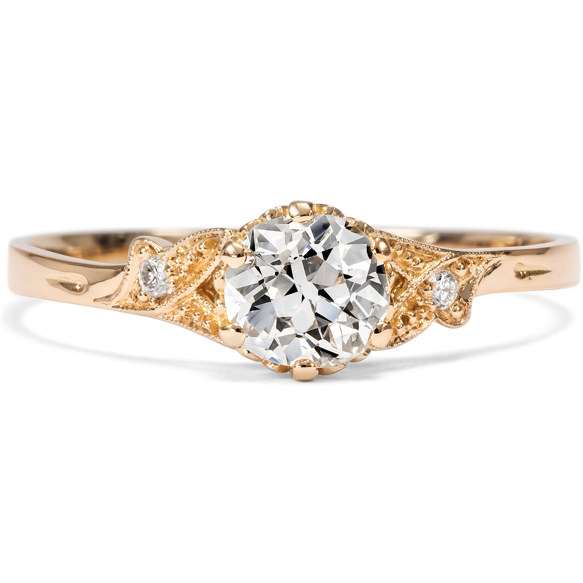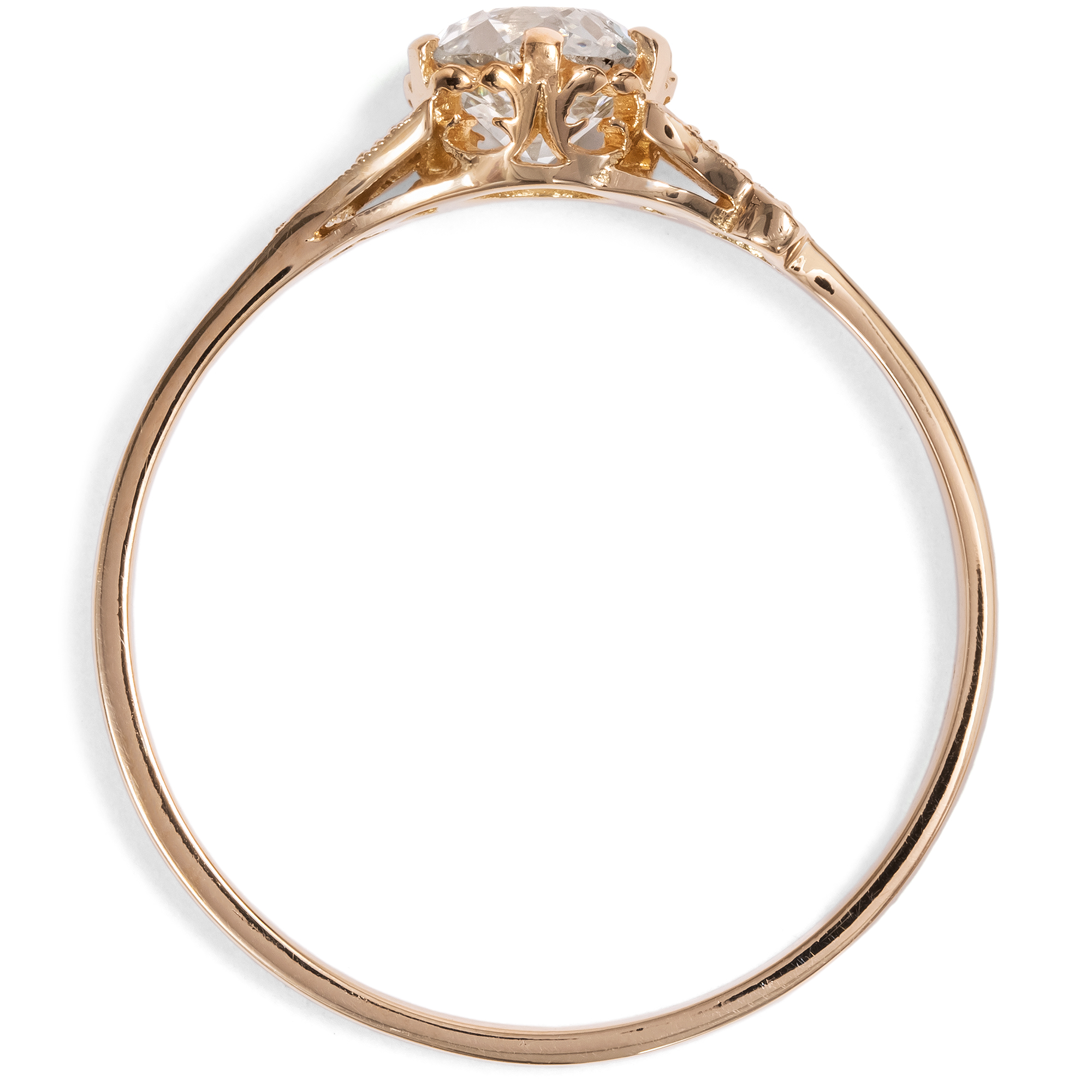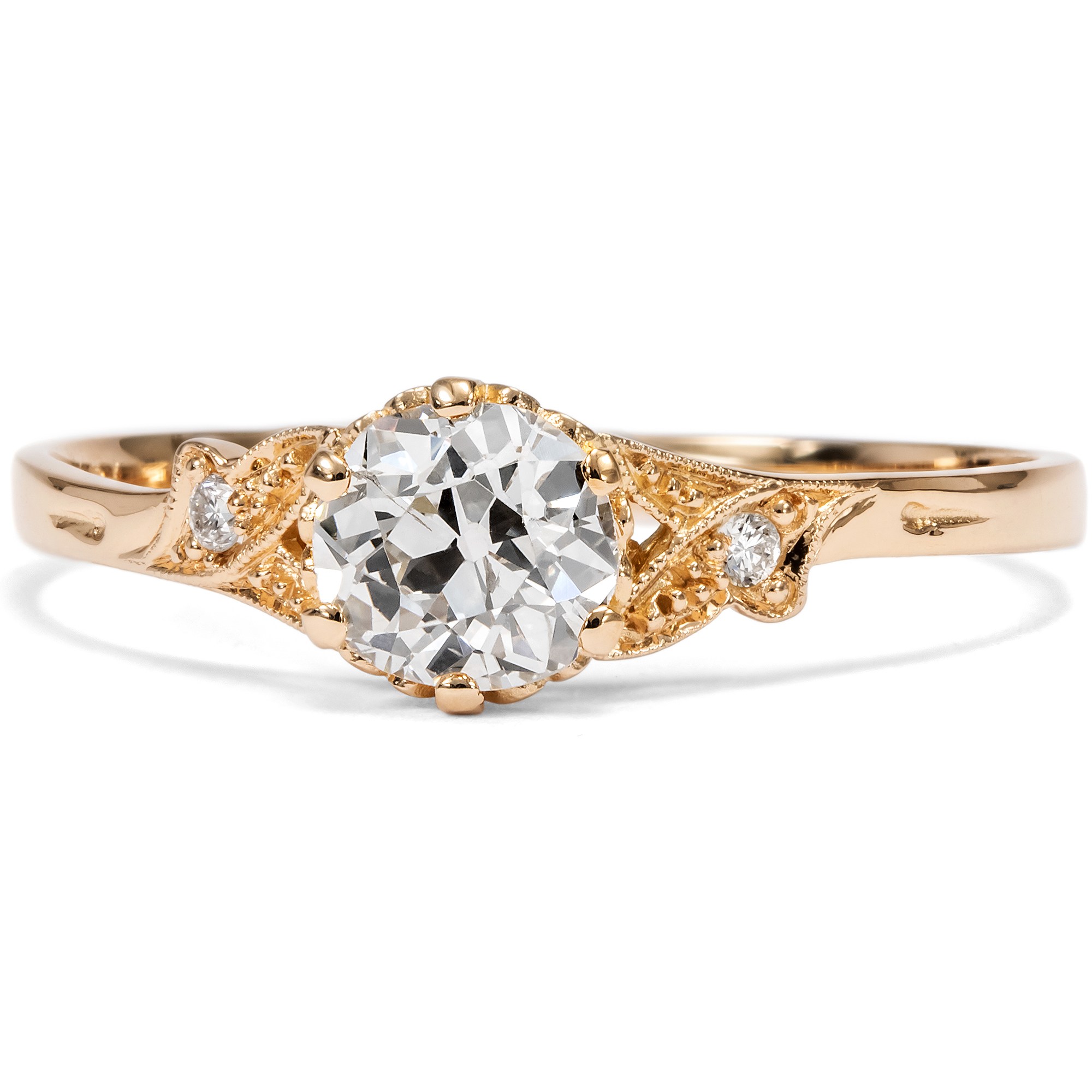 As antique jewelry dealers, our love of antique objects means that we occasionally also buy unmounted gemstones. After all, every historical diamond is an unmistakable one-off with its very own character. However, the search for beautiful settings for our diamonds turned out to be more difficult than expected. Modern ready-made settings, as you can buy them in stores, are often soulless machine products with no feeling for shape and proportion. But beautiful, hand-forged, antique settings rarely come to us without matching diamonds. So we commissioned our goldsmith to make a ring setting according to our design, which we then had cast using an old technique. We had this ring made from high-carat rose gold and used historical gold for this purpose. The diamond that we had set in the setting is a historical diamond in the old European cut diamond. The diamond weighs 0.68 ct and shines in a very slightly warm tinted white (slightly tinted white+ (Top Crystal, I). It shows some natural inclusions, especially a longer, feather-shaped inclusion on the side of the table. Set in a setting of warm, shiny rose gold, the diamond appears bright and white. Two smaller diamonds in delicate settings with milgrains structure the ring shoulders and give the piece its light elegance, which sets off the large brilliant-cut diamond wonderfully. At the same time, the piece of jewellery sparkles with every ray of light that hits its finely crafted surfaces. The ring can also be worn every day thanks to its high-quality, durable materials and flat design. An ideal ring for what is probably the most important question in life - and that is always a matter of the heart!