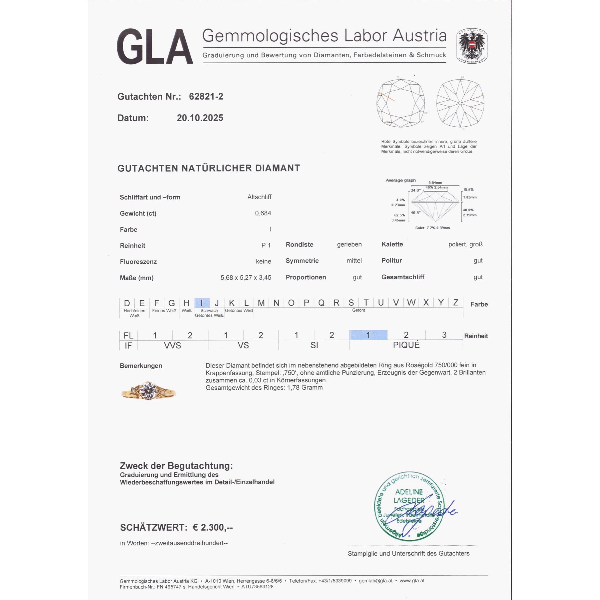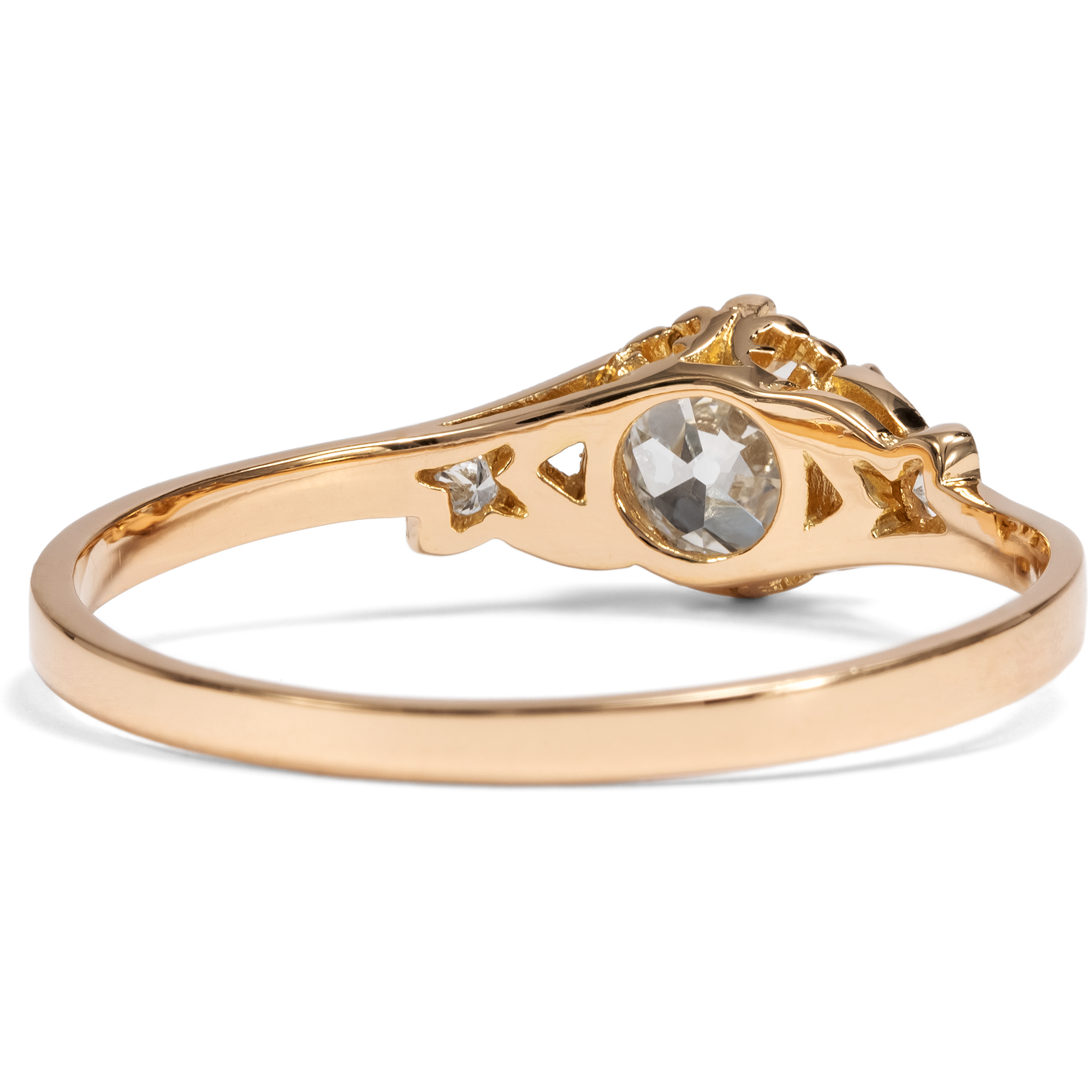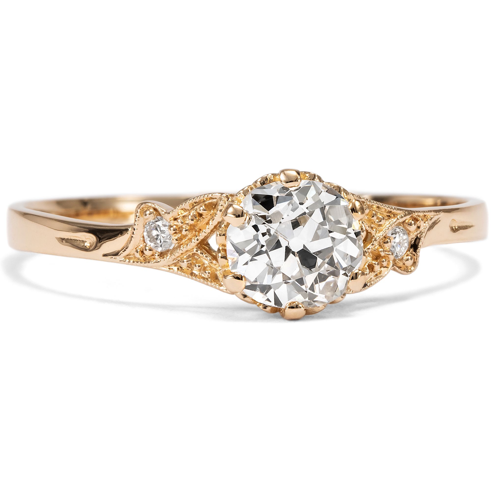 As antique jewelry dealers, our love of antique objects means that we occasionally also buy unmounted gemstones. After all, every historical diamond is an unmistakable one-off with its very own character. However, the search for beautiful settings for our diamonds turned out to be more difficult than expected. Modern ready-made settings, as you can buy them in stores, are often soulless machine products with no feeling for shape and proportion. But beautiful, hand-forged, antique settings rarely come to us without matching diamonds. So we commissioned our goldsmith to make a ring setting according to our design, which we then had cast using an old technique. We had this ring made from high-carat rose gold and used historical gold for this purpose. The diamond that we had set in the setting is a historical diamond in the old European cut diamond. The diamond weighs 0.68 ct and shines in a very slightly warm tinted white (slightly tinted white+ (Top Crystal, I). It shows some natural inclusions, especially a longer, feather-shaped inclusion on the side of the table. Set in a setting of warm, shiny rose gold, the diamond appears bright and white. Two smaller diamonds in delicate settings with milgrains structure the ring shoulders and give the piece its light elegance, which sets off the large brilliant-cut diamond wonderfully. At the same time, the piece of jewellery sparkles with every ray of light that hits its finely crafted surfaces. The ring can also be worn every day thanks to its high-quality, durable materials and flat design. An ideal ring for what is probably the most important question in life - and that is always a matter of the heart!
