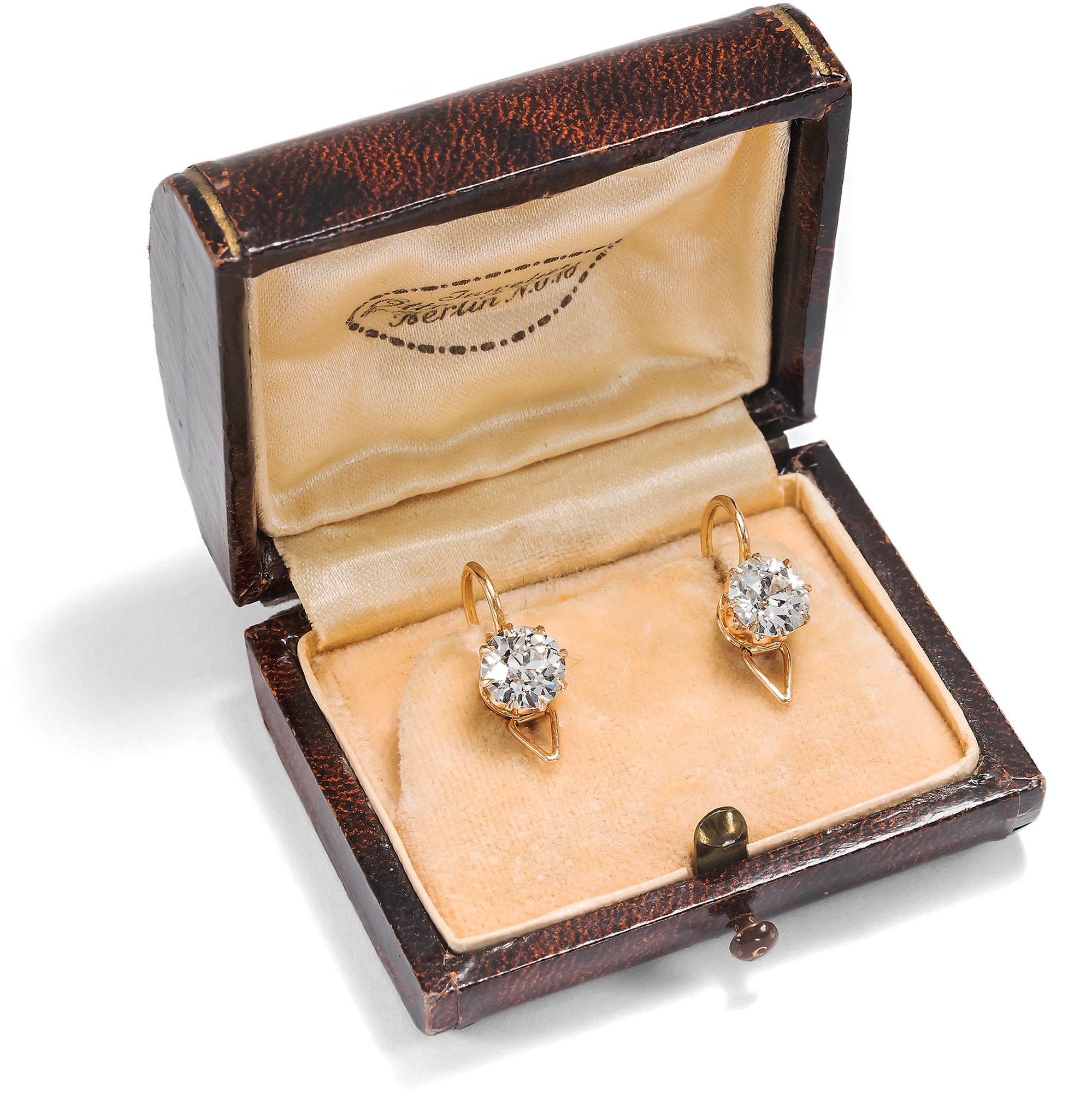 This pair of delicate earrings are so-called dormeuses. „Dormeuses“ are small earrings, usually with leverbacks, which are worn just below the earlobe and can also be worn during naps or at night (French "dormir" = to sleep). Dormeuses became very fashionable in the late 19th century: after long earrings had been popular for many decades, they were suddenly considered unfashionable from the 1880s onwards. Earrings of a smaller size were now socially acceptable: "Small dangle earrings are still popular. A pearl, a large diamond close to the earlobe and, at most, a falling stone will suffice perfectly," wrote the influential German ladies' journal Der Bazar in 1897. This pair is a particularly luxurious example of this fashion. Each of the earrings is set with an old-cut diamond of around one carat. The diamonds are slightly warm toned (slightly tinted white, J) and very pure (VS). The sparkling diamonds are held in place by airy chaton settings that look like little crowns. The earwires and settings are made of rose gold, giving the pair a wonderfully warm appearance. We discovered the earrings in Hamburg. The pair has been beautifully preserved and impresses with a soft, nostalgic shimmer that you will look in vain for in modern diamonds. An independent appraisal has confirmed the quality of the materials used.