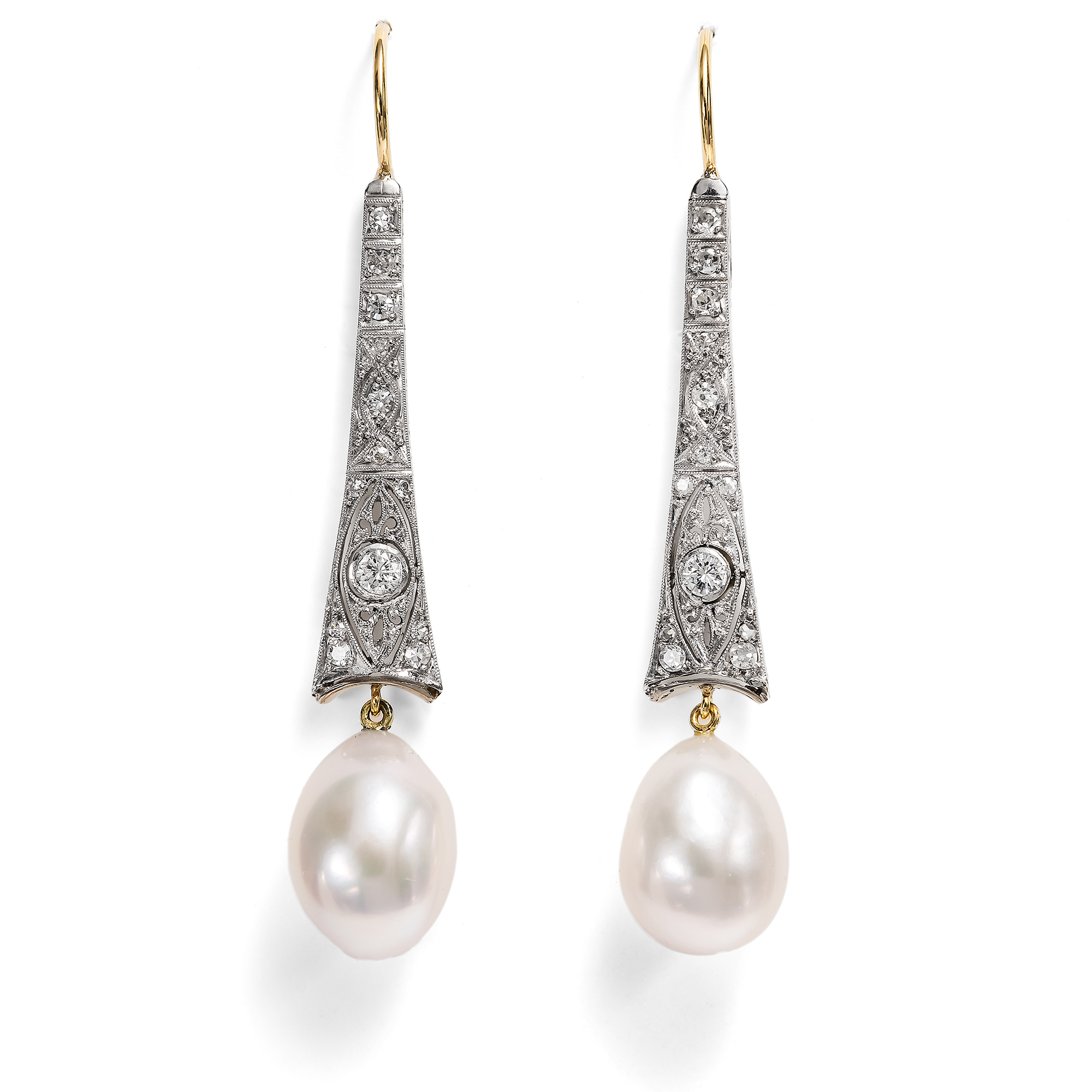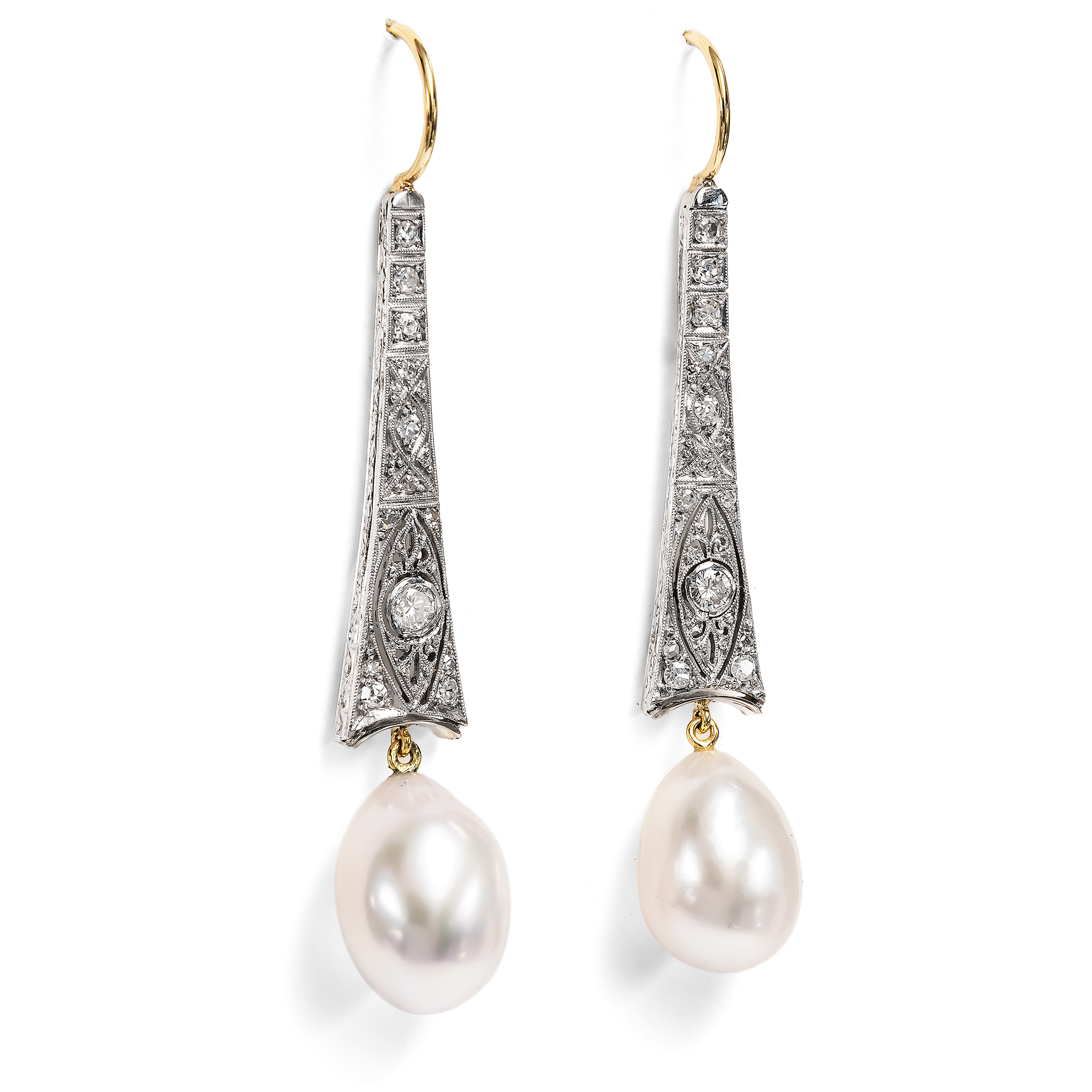 From time to time, we buy fragments or parts of antique pieces of jewellery on our forays through antique stores, auction houses and flea markets. Even if they no longer seem wearable as they are, we often can't pass them by. Our goldsmith is always delighted to receive these finds, which he can then give a new lease of life. In the case of these earrings, the starting point was a fragment of an Art Deco brooch. Our goldsmiths combined the elements made of white gold with large, drop-shaped pearls to create a luxurious pair of earrings. A total of 24 white diamonds in historical cuts adorn the elegantly openworked elements. The large pearls with a creamy white luster subtly complement the elegant monochrome look. The old goldsmith work from the 1920s can now be worn as earrings. A beautiful pair of earrings that only exists once and spans over a hundred years of craftsmanship.