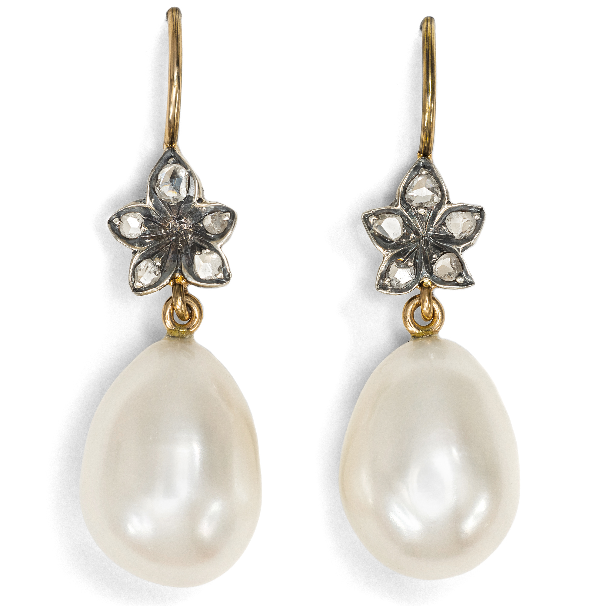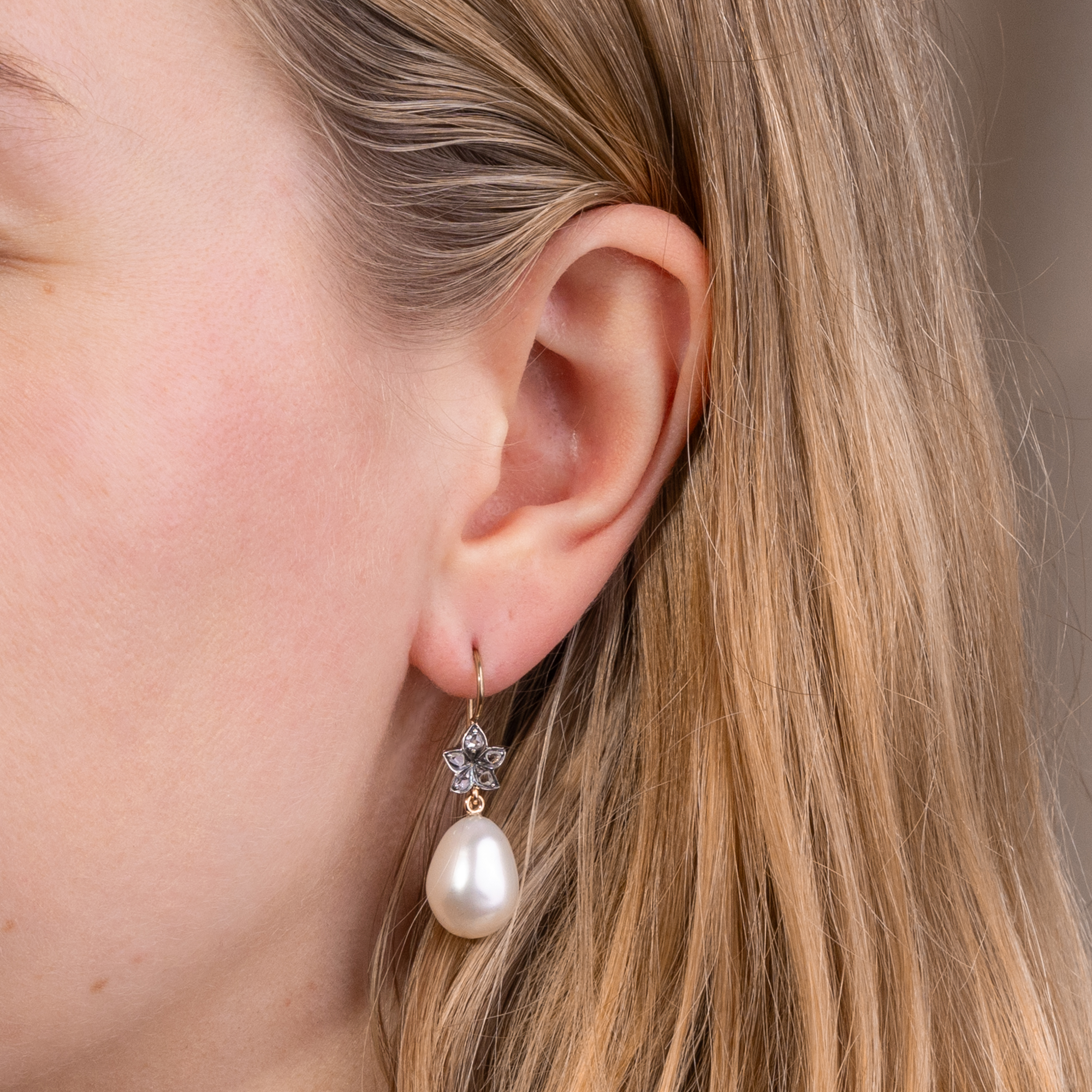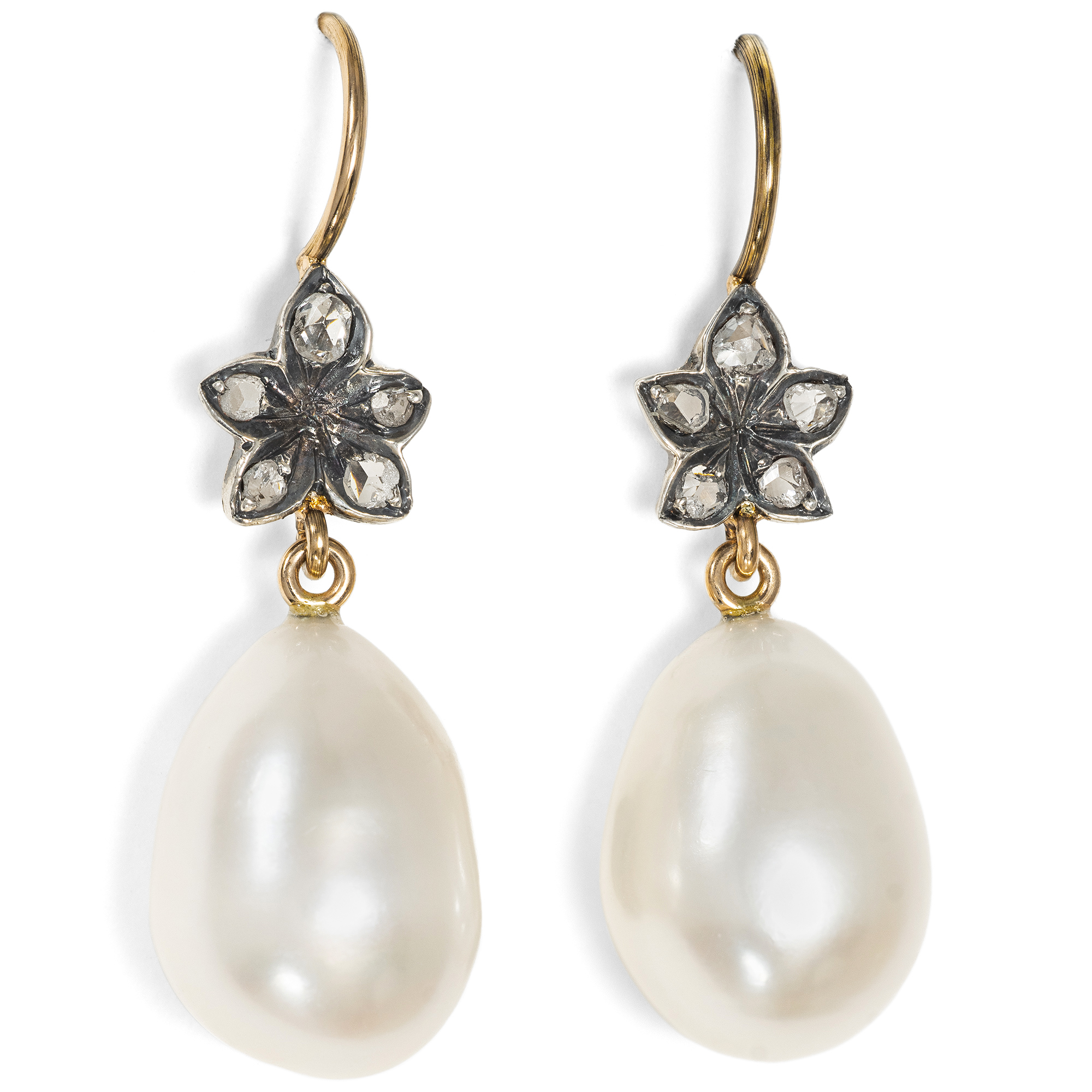 Sometimes the jewelry story produces particularly beautiful blossoms. One of these flowers is a rose - in the truest sense of the word. This is because the rose cut is the name of the historic diamond cut that has been known since the end of the 16th century. With its flat bottom and faceted top, it gives the precious stone a special shine that was originally designed for the warm glow of candlelight. A total of ten such rose diamonds adorn flowers made of silver and embellished with gold. These floral elements were once part of a 19th century necklace, which - like so many other pieces - we have only acquired in fragments. Due to the beauty of the incomplete necklace, we decided to breathe new life into it. Our goldsmith added a drop-shaped pearl with a delicate rose-colored luster to each of the historical elements. The yellow gold hoops are also new, making them easy to put on and yet safe to wear. The antique diamond roses can now accompany you again - whether by candlelight or in daylight.