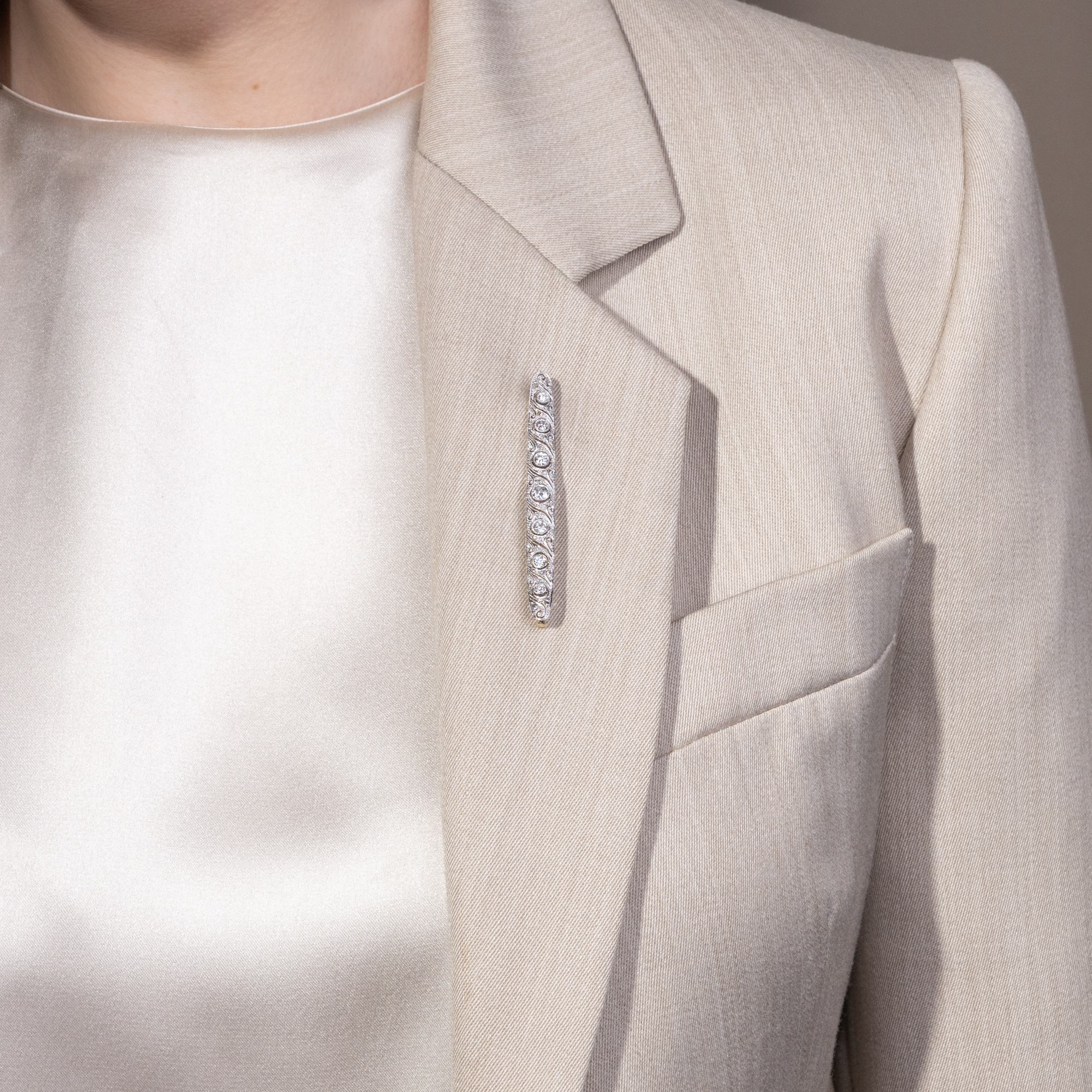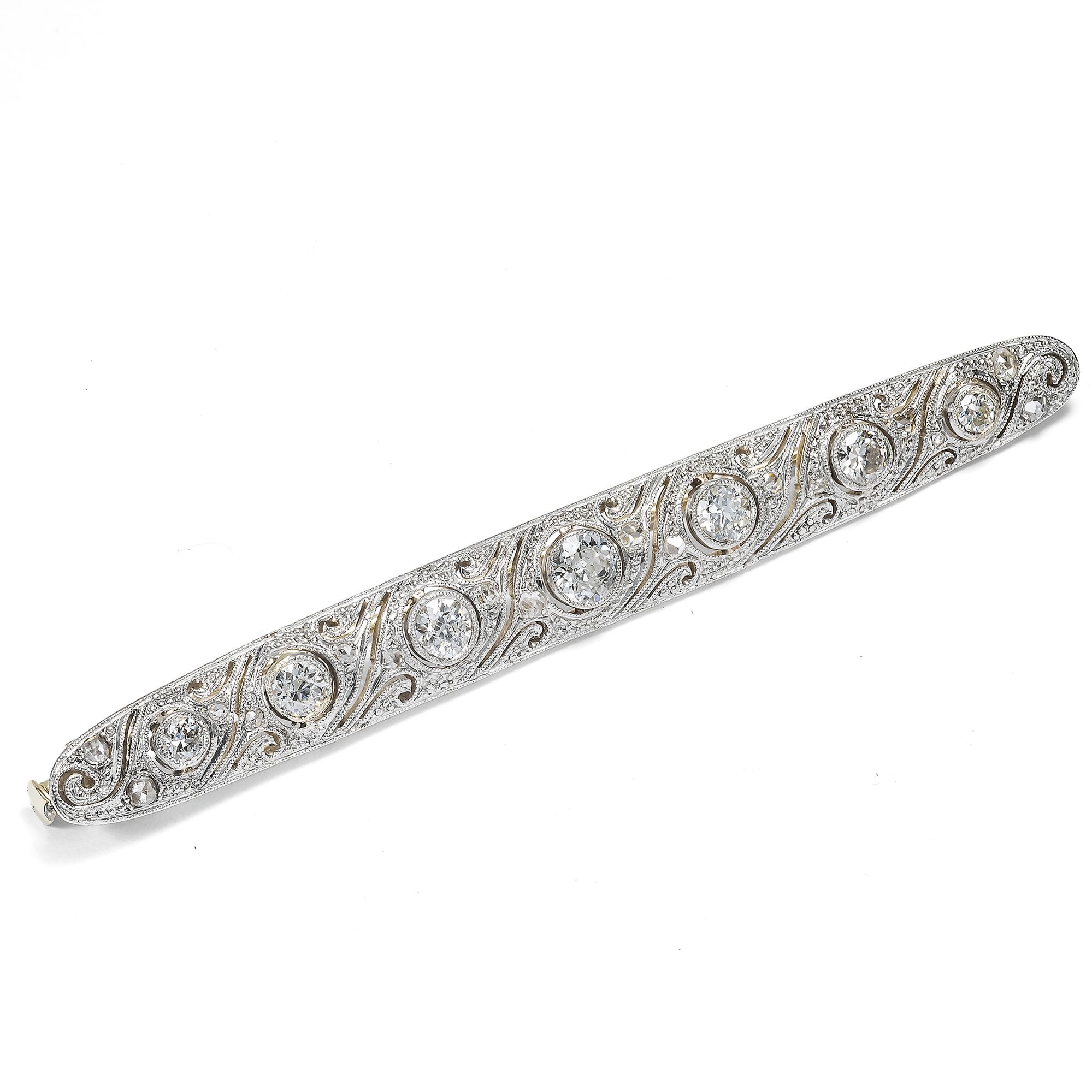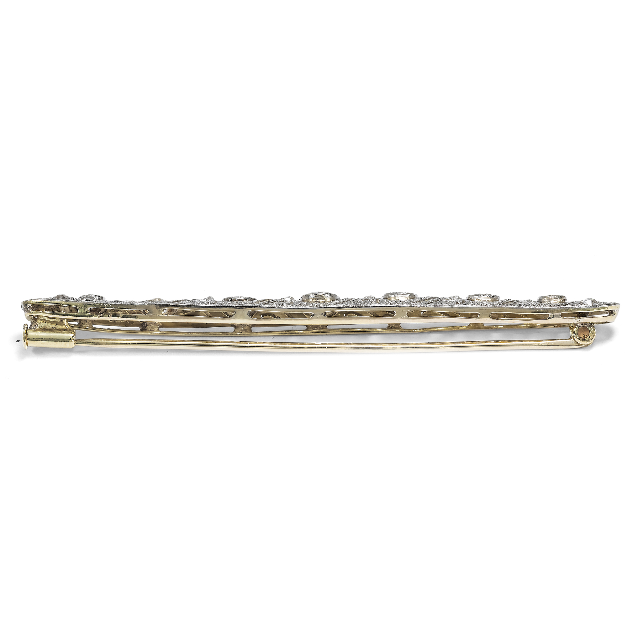In the midst of the ever faster changing world of the years after the First World War, the artists and craftsmen of Art Deco sought to find a new formal language. They rejected the forms of Art Nouveau, which they considered too sweet, too transfigured, and sought geometric rigor. This alone seemed appropriate for the age of automobiles, skyscrapers and express trains. This bar brooch is also committed to this aesthetic. The goldsmith has rhythmically structured the platinum-plated display side with C-sweeps, shadow gaps and milgrains. At the center of the design, slightly raised in their settings, are seven old-cut diamonds accompanied by 16 rose cut diamonds. Bar brooches like these were worn in many different ways: For example, in contrast to the 1910s, they were worn slightly crooked and casual instead of perfectly straight. Bar brooches were worn on the top button of elegant blouses or shirts inspired by men's fashion, or even on a tie, as a deliberate break in style and expression of emancipation - unthinkable just a few years previously. This very well-preserved brooch came to us from Hamburg. It was probably also once made in Germany.