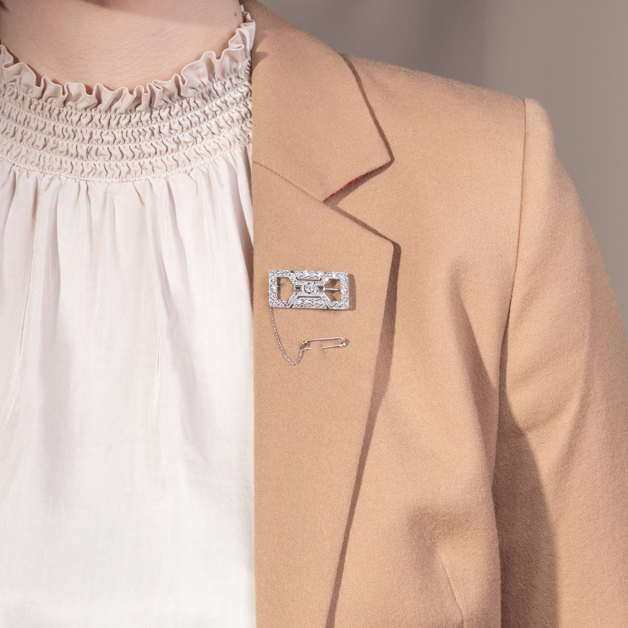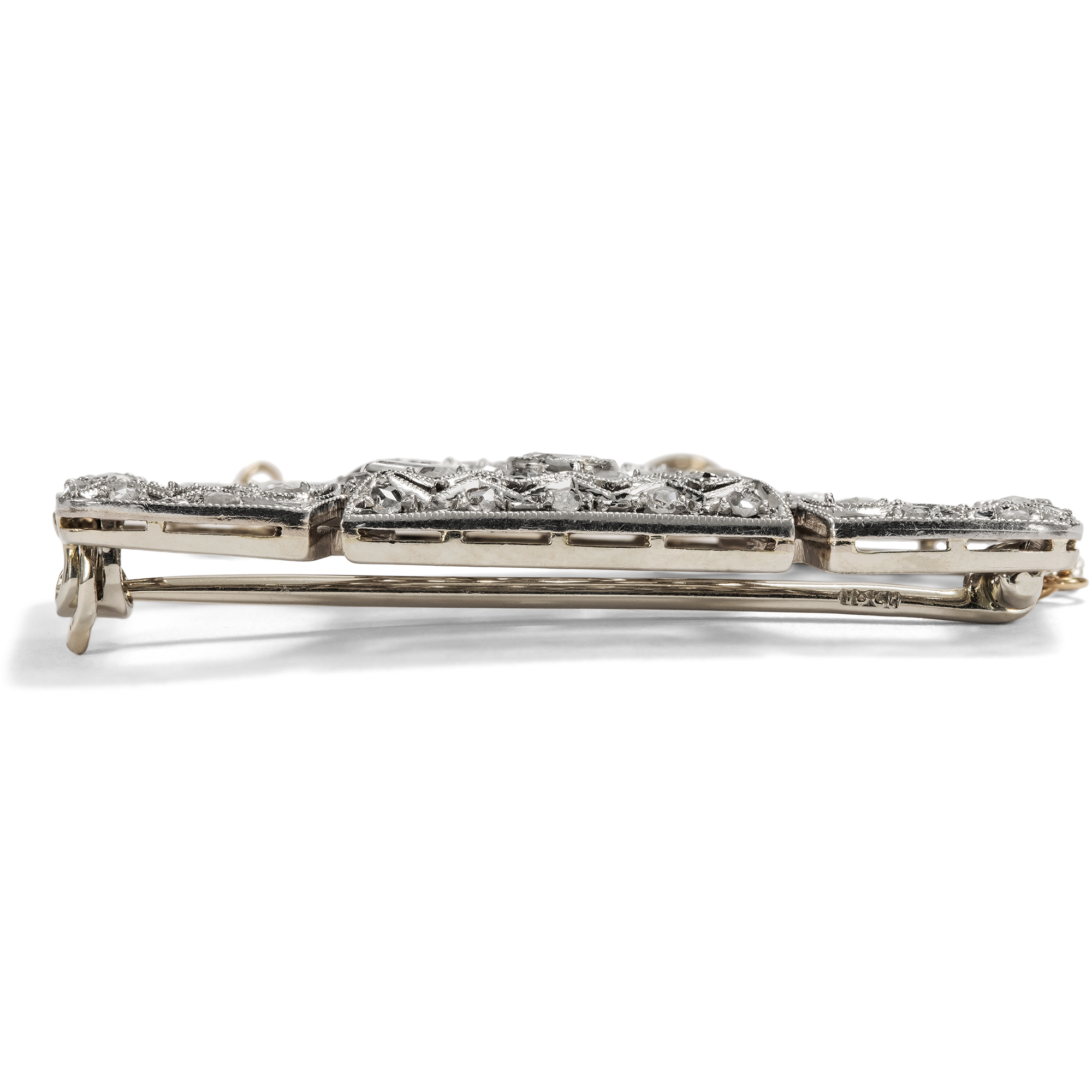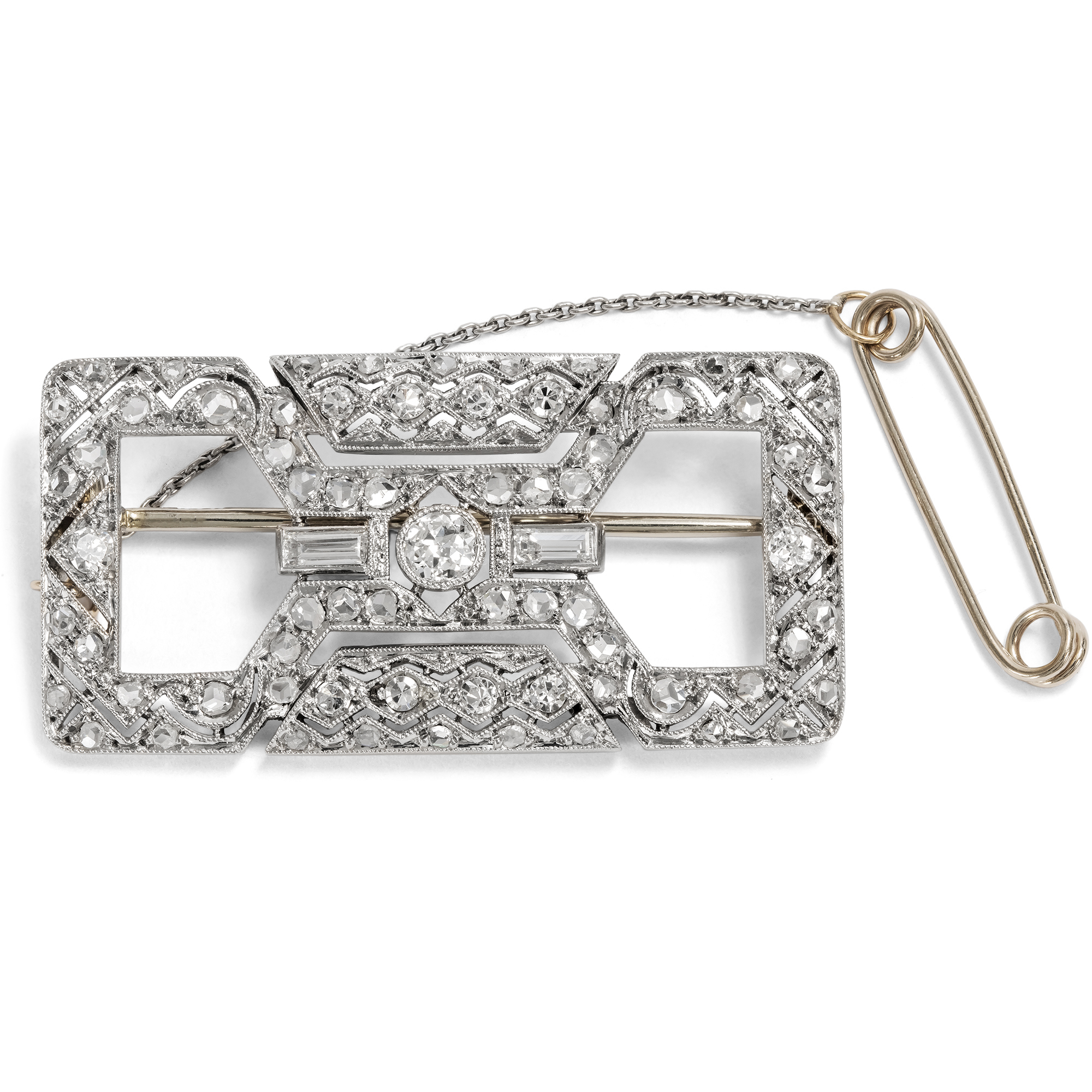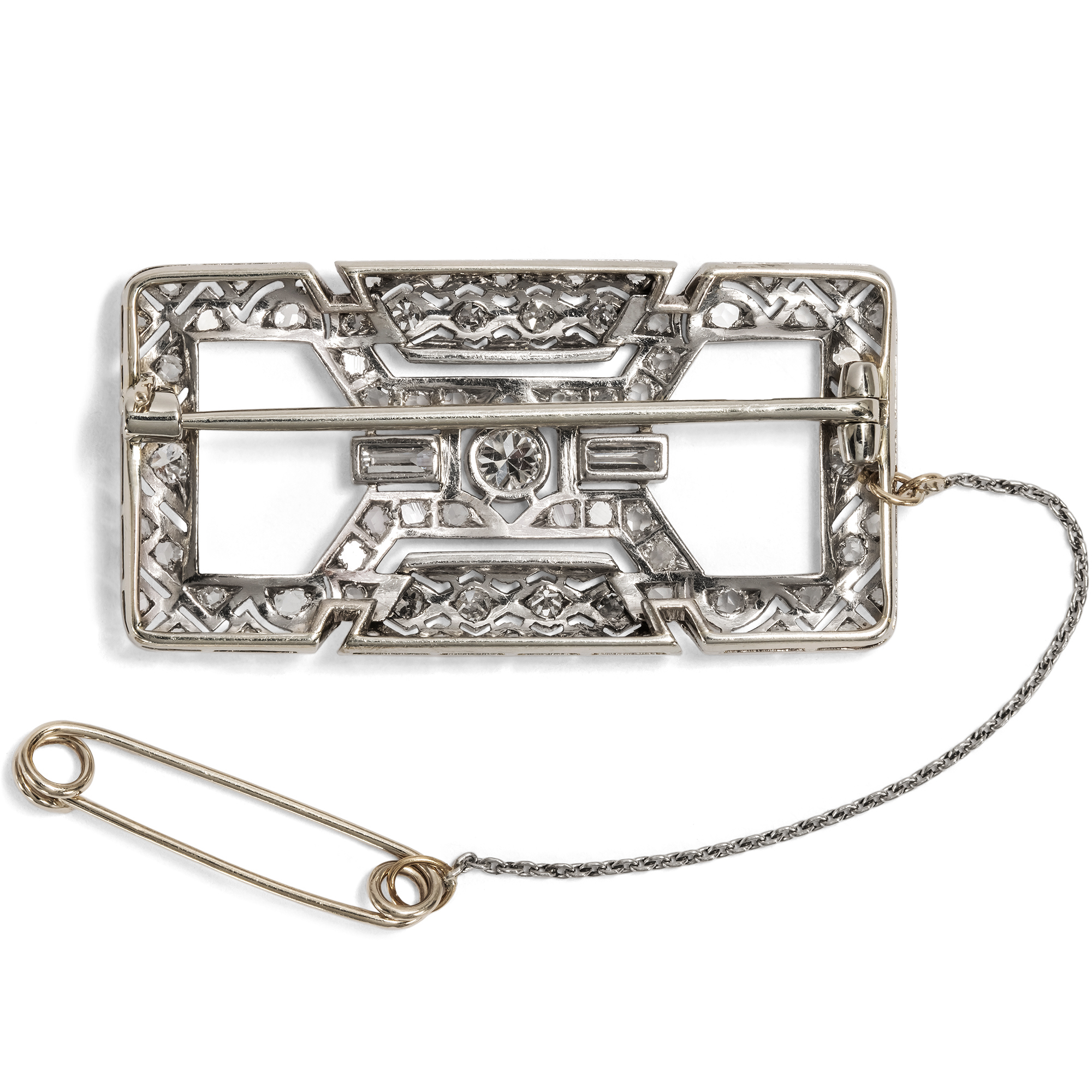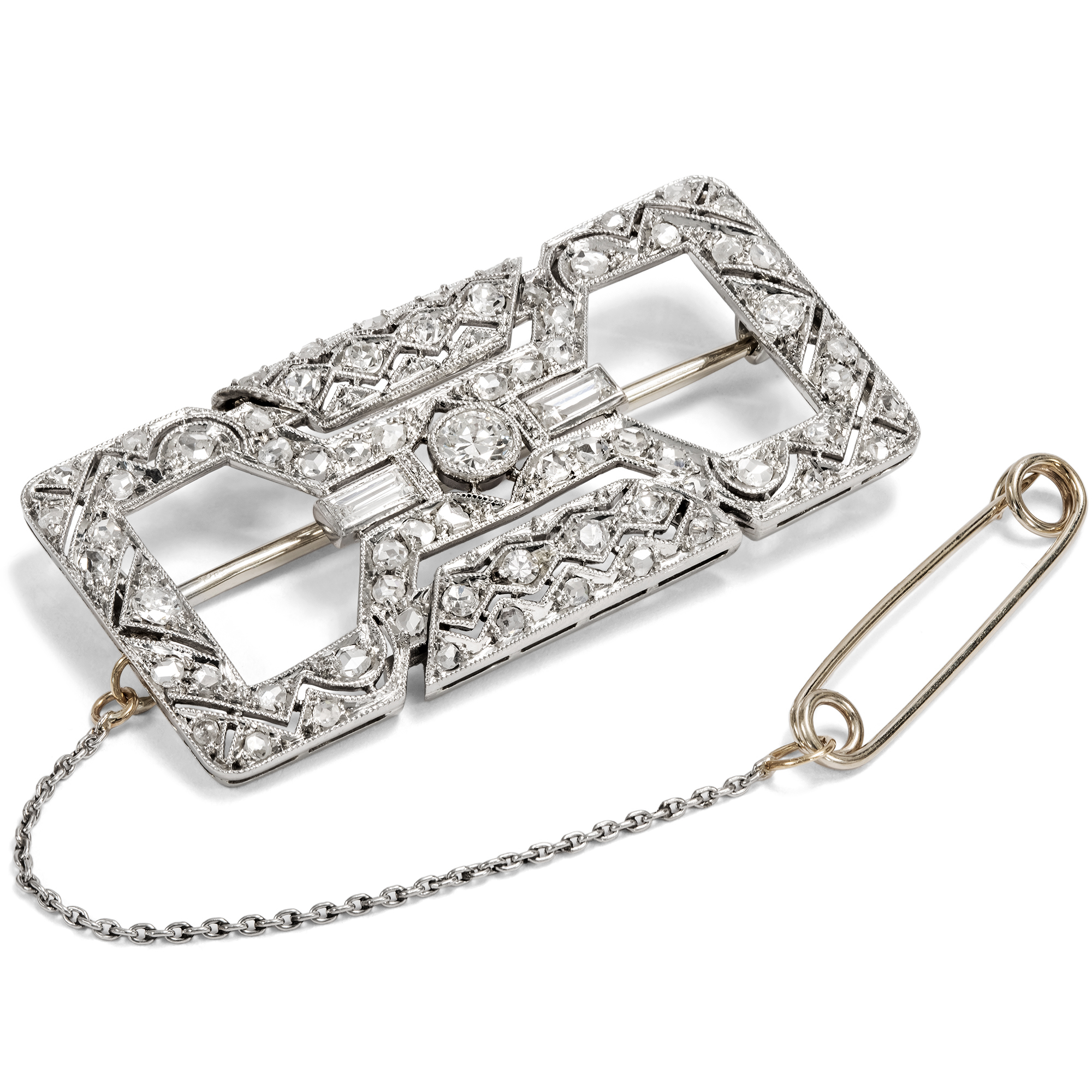 "The new woman" was the ideal of the 1920s and early 1930s. She had won the right to vote, was self-confident in matters of work and love, and was part of the nightlife - things that still seemed unimaginable at the beginning of the century. Articles in influential German fashion journals such as Die Dame bear witness to the fact that a new self-image could also be translated into aesthetics, indeed, that it virtually necessitated a new aesthetic. The women portrayed there wore bobbed heads and strikingly made-up lips, loosely cut dresses - and yet the most influential among them were not simply style icons, but were active as authors and artists. It goes without saying that the floral and playful jewellery of the Belle Époque was reminiscent of the time before the war, of a different social order. The jewellery of the new woman consciously set itself apart from this: Clear-lined and geometric, it deliberately eschewed anything sweet. It was a linear, often emphatically austere elegance that characterized the most modern pieces of jewellery of the time. This brooch - or as it was called in jewelry catalogs of the time, a "broochette" - is one such modern piece of jewellery. Its design with the two large openings is based on the so-called "shoulder pins", which were particularly popular in the 1920s and were designed for a new way of wearing. They were characterized by the fact that they had a narrow round, oval or rectangular frame and offered open spaces on the inside through which the silk fabric of the dress could shimmer. Exquisitely crafted saw work and milgrains structure the platinum on white gold front, typical of the period. It is set all over with diamonds in various cuts, giving the design that inimitable white glittering elegance that makes the jewellery of the 1920s so desirable to this day.