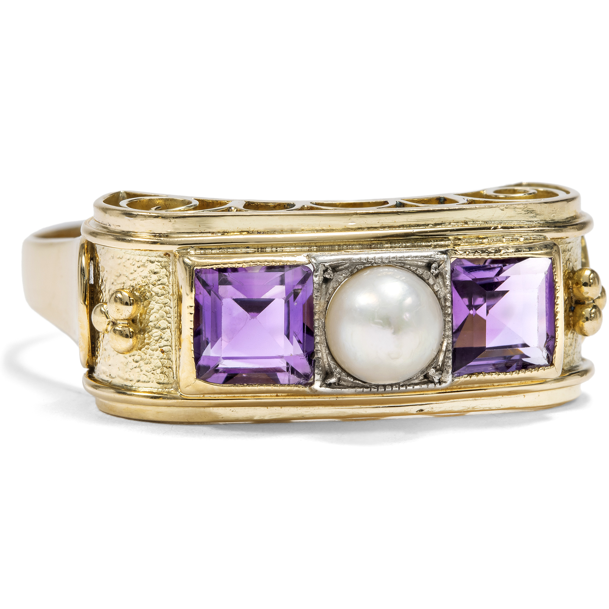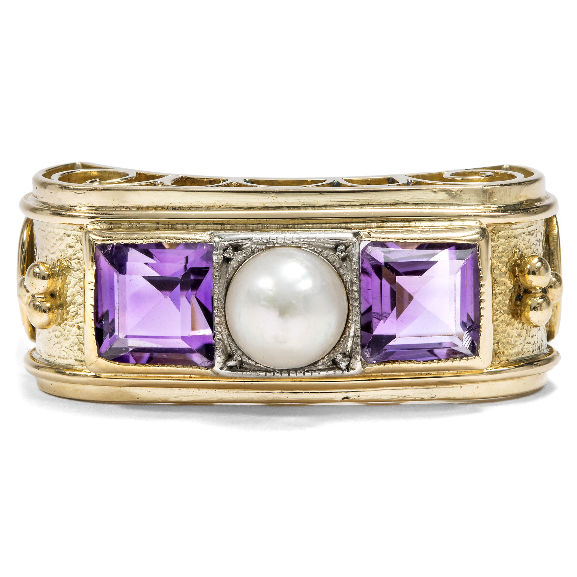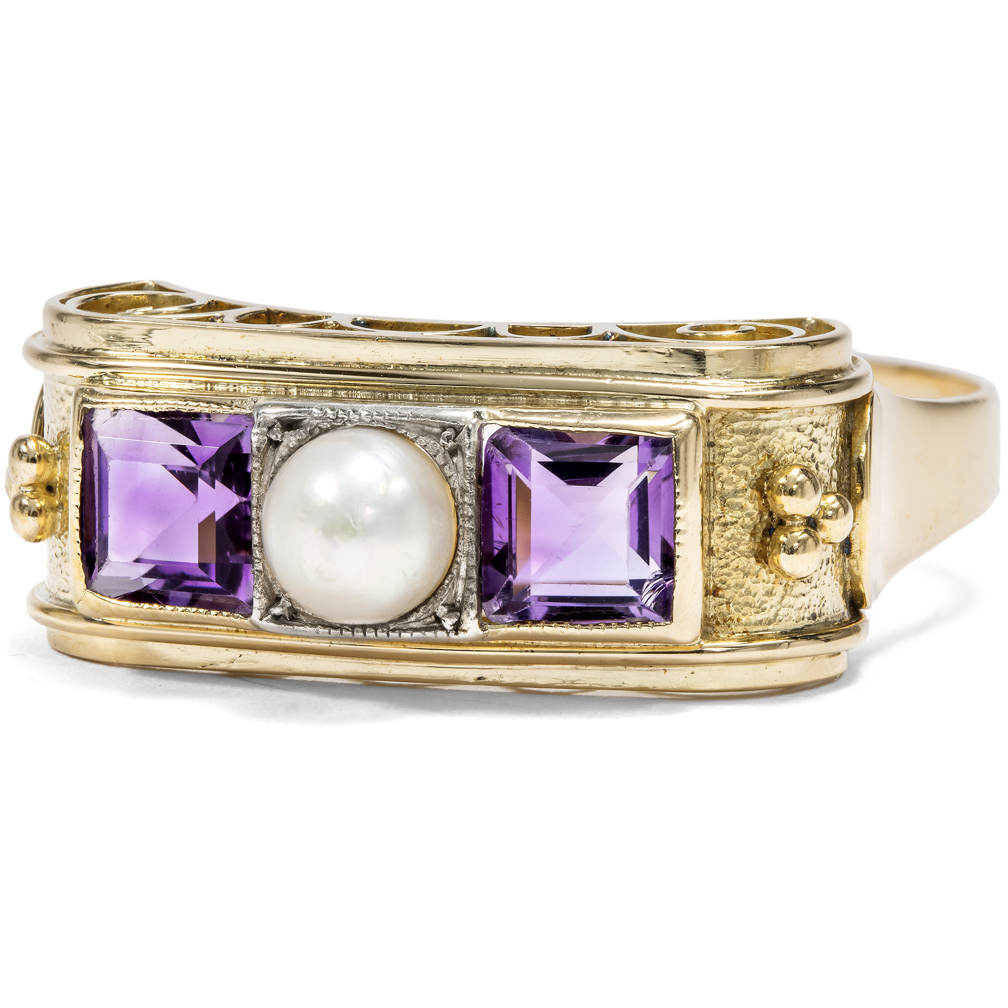 Two lavender amethysts in a square carré cut and a shimmering pearl come together in the center of this ring from the 1930s to create a fine composition of color and shine. They are set in warm, radiant yellow gold, which was forged by hand and reflects the character of late German Art Deco in its powerful, voluminous design language. After the so-called white jewels made of platinum and diamonds had dominated the scene in the 1910s and 1920s, a new interest in gold and colored gemstones emerged in the 1930s. Yellow gold and rose gold returned to jewelry design, accompanied by stones that provided freshness and vibrancy with their intense colors. Our ring, created around 1935, picks up on this style congenially and enriches it with small gold granules that enliven the surface like tiny dots of light. Its shape across the finger makes it a self-confident piece of jewellery that is both decorative and elegant. It embodies the elegance of an era that brought a new sensuality to jewellery after the clean lines of Art Deco. Beautifully preserved, it tells of style, taste and a fine sense for unusual details today as it did then. The ring came to us here in Berlin.