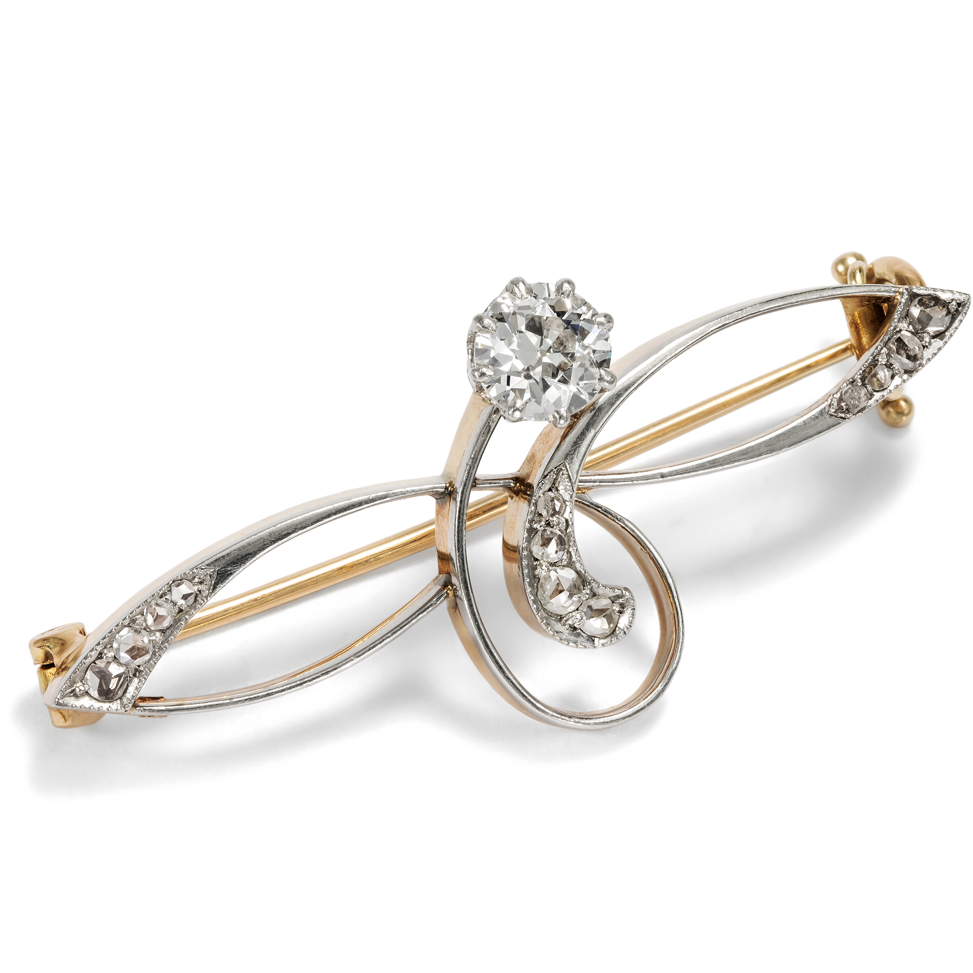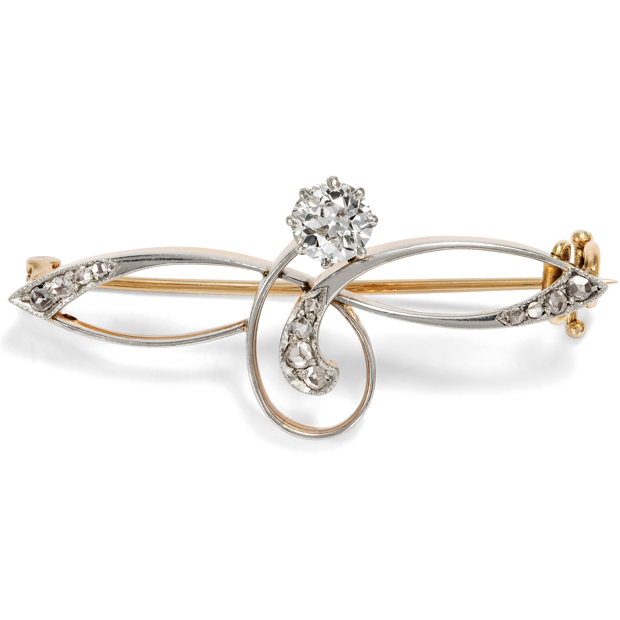 It is the sweeping lines of the Art Nouveau ornament that lend the design of this brooch its dynamism. Lines sweeping in and out are reminiscent of plant tendrils and set a wonderful old-cut diamond of more than half a carat as the highlight. Further diamonds glisten along the curves. A total of around 0.57 ct of diamonds have been set in platinum on 14-karat gold, typical of the time. Brooches were worn differently at the turn of the century than we know them today. If the dress was high-necked, they adorned where a pendant or necklace would otherwise be. In 1899, the US magazine The Jeweler's Circular wrote: "With the more distinctly feminine mode of dressing the neck in soft silk, dainty embroideries and laces, which women are now rapidly adopting, the brooch becomes more than ever necessary." (My Lady's Jewel Box, in: The Jeweler's Circular, Feb. 1, 1899, p. 12.) This brooch, which was most probably made in Germany, proves that this fashion was also followed in Europe. It is beautifully preserved and came to us from Saxony.