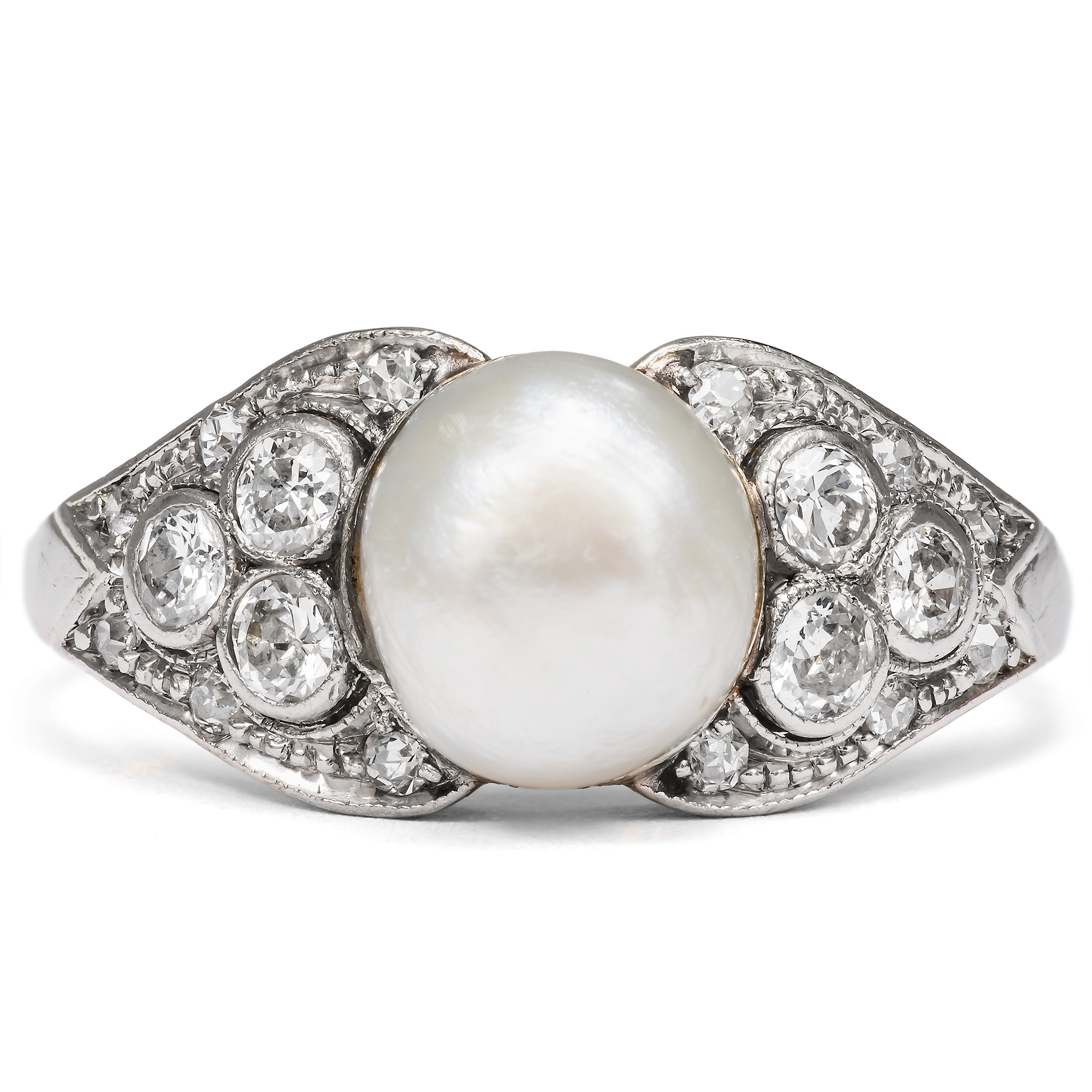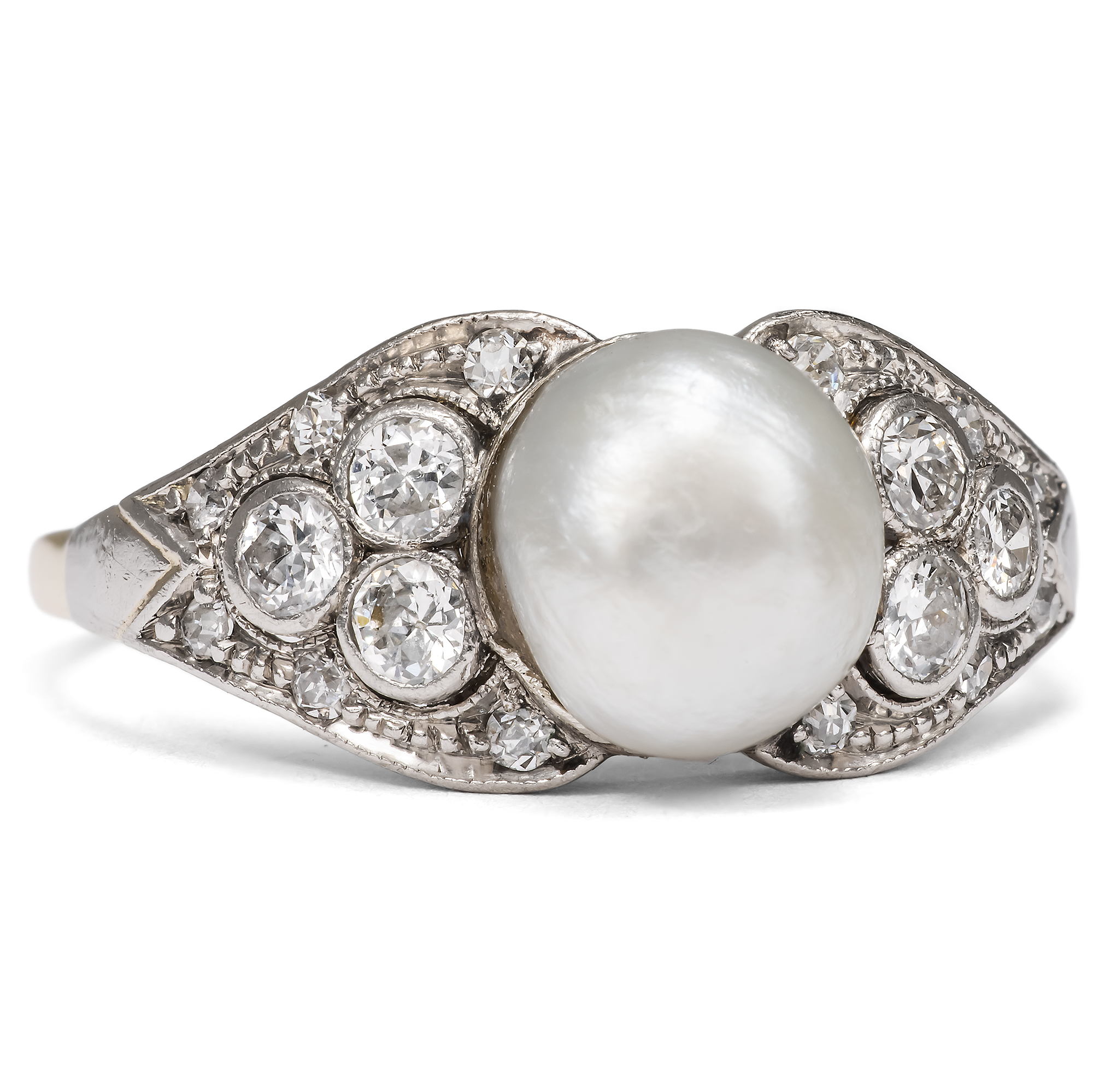 "It is well worth the beauty of pearls that thousands of bold divers, coastal inhabitants of the Persian Gulf, that the daring pearl fishermen of Ceylon and Japan do not fear the horrors and dangers of the deep, do not shy away from encounters with sharks and sawfish, do not fear the deadly embrace of polyps, in order to bring the pearl shell lying on the dark sea bottom to the bright light of the sun!" With this short article, the Berlin magazine Der Bazar described the hardships of pearl fishing in 1888. At that time, the cultured pearls that are common today were still out of the question, as it would be half a lifetime before the Japanese entrepreneur Mikimoto succeeded in growing cultured pearls on a large scale in shells over mother-of-pearl cores. This early 20th century ring presents such a treasure of the sea, which only came to us in the world above the water due to the carelessness of a sawfish or a deadly polyp. The softly shimmering, creamy white pearl is slightly depressed and slightly baroque in shape and has a very good lustre. It is held by the design of the ring between two platinum wings set with diamonds, which taper downwards and merge into the ring band under the finger. In addition to the very beautiful, individual pearl, we also like the workmanship and quality of the ring's goldsmithing. The larger diamonds are set in the finest frames, which no goldsmith today can produce with such finesse and yet stability. The side view of the ring is also impressive, with fine details on the undercut, the part where the platinum display side merges into the yellow gold substructure. Based on the workmanship, the cut of the diamonds and the design language of the ring, we think it was created in the years c. 1910.