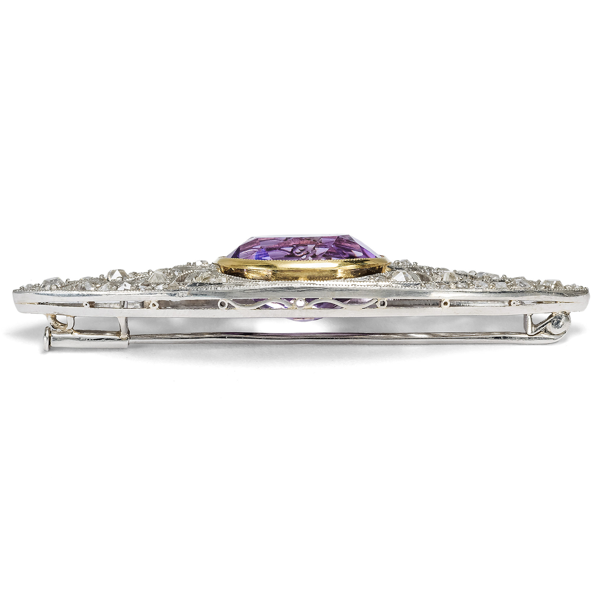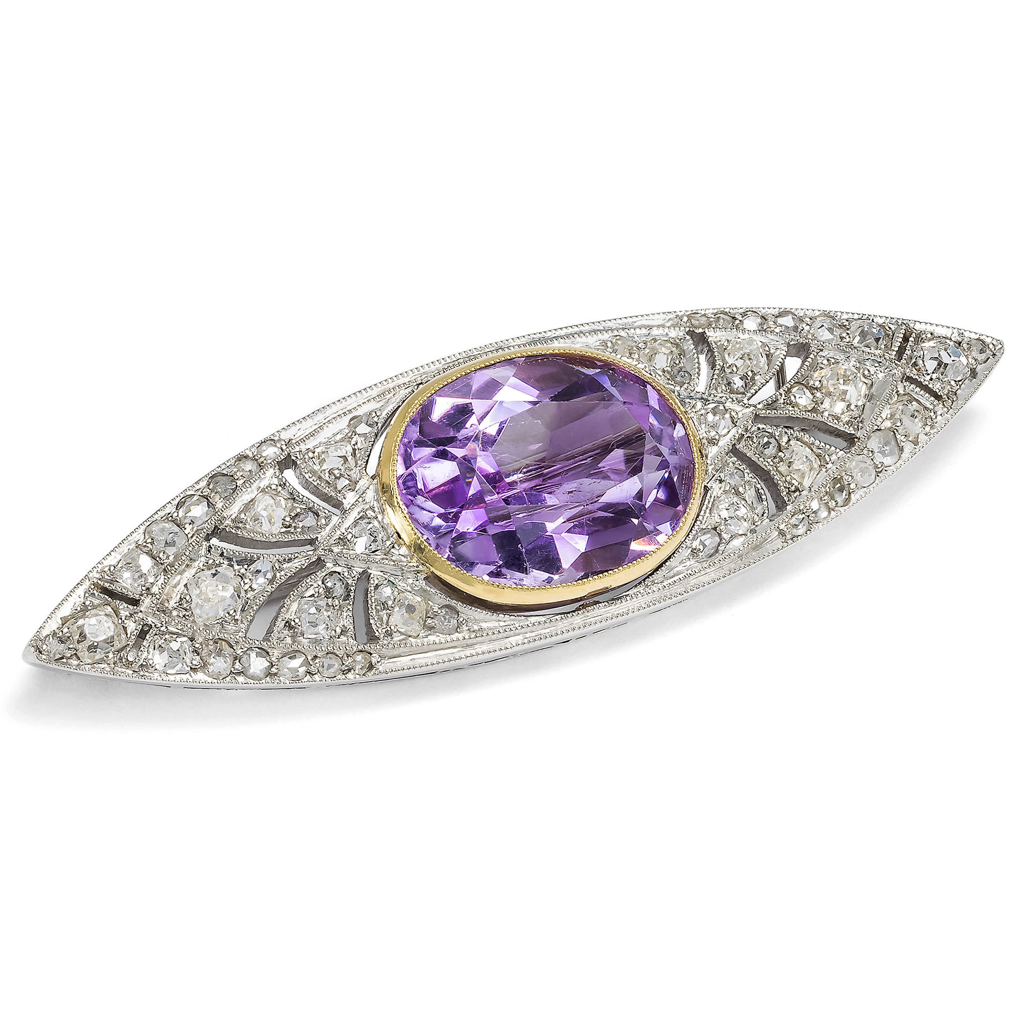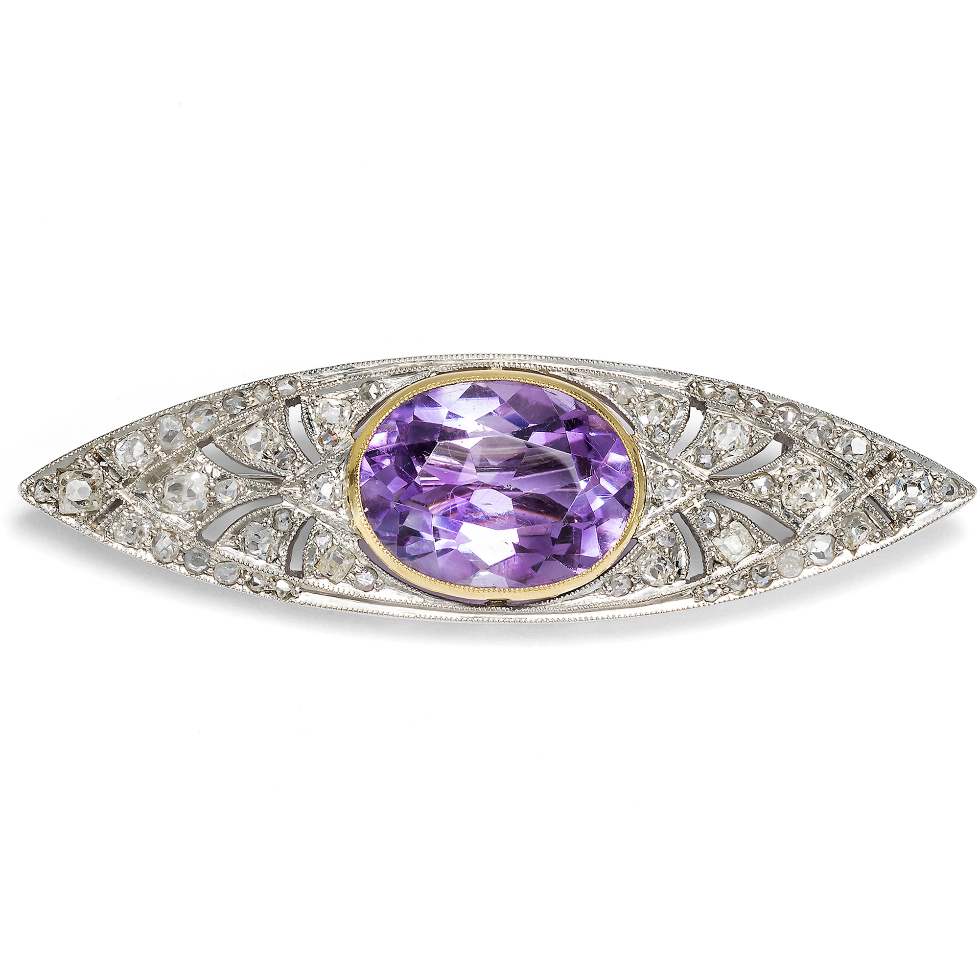This elegant, precious brooch presents an amethyst in the colour of the scented violet. The natural gemstone is shaped in an oval facet cut, which elicits effective light reflections. The amethyst is held in place by a delicate gold frame, while the rest of the brooch is made of platinum. A total of 54 diamonds weighing around 1.70 ct set the sparkling surface of the brooch. The quality craftsmanship by hand and the details of the design with milgrains and geometric rigor are in keeping with the Art Deco jewellery of the 1920s and 1930s. The cuts of the diamonds, on the other hand, are significantly older; some of them were cut in the early 19th or even 18th century. The hallmarks on the brooch, on the other hand, date from 1958! How does this fit together? The brooch actually bears hallmarks from Moscow, which refer to the year 1958. We initially thought that an older piece of jewellery had probably been hallmarked here, which happens again and again. After all, the workmanship and design suggest that this is a brooch from the early 20th century. But then we discovered that the setting of the amethyst is also hallmarked, which can only have happened during the manufacturing process, but not after the stone had already been set. Therefore, it must be different and the brooch was made in the taste of the early 20th century in the late 1950s. Until the 1950s, the taste in jewellery in the Soviet Union was very conservative and influenced by the classicism of the 1930s. It was only after Stalin's death that the forms slowly changed. The brooch is in very good condition. We discovered it in Vienna.
