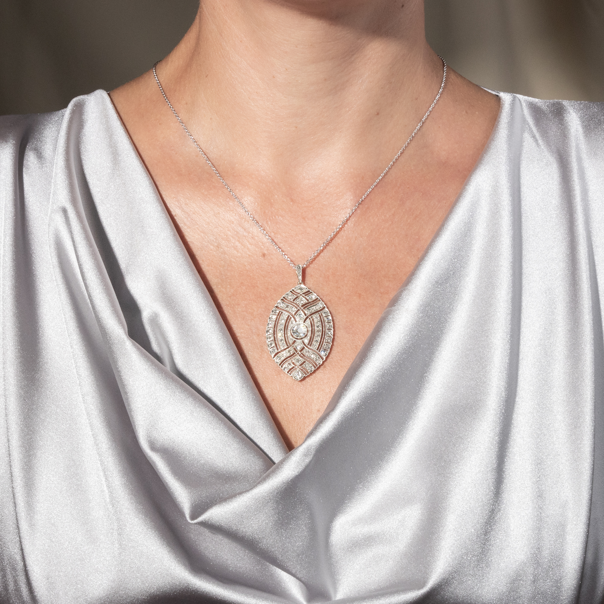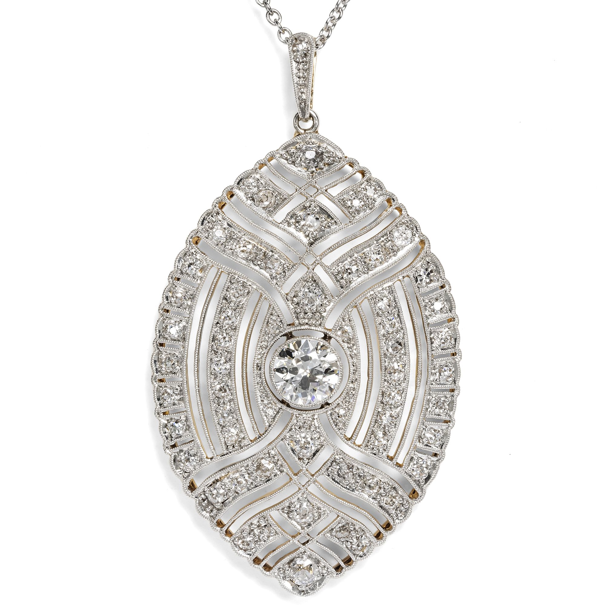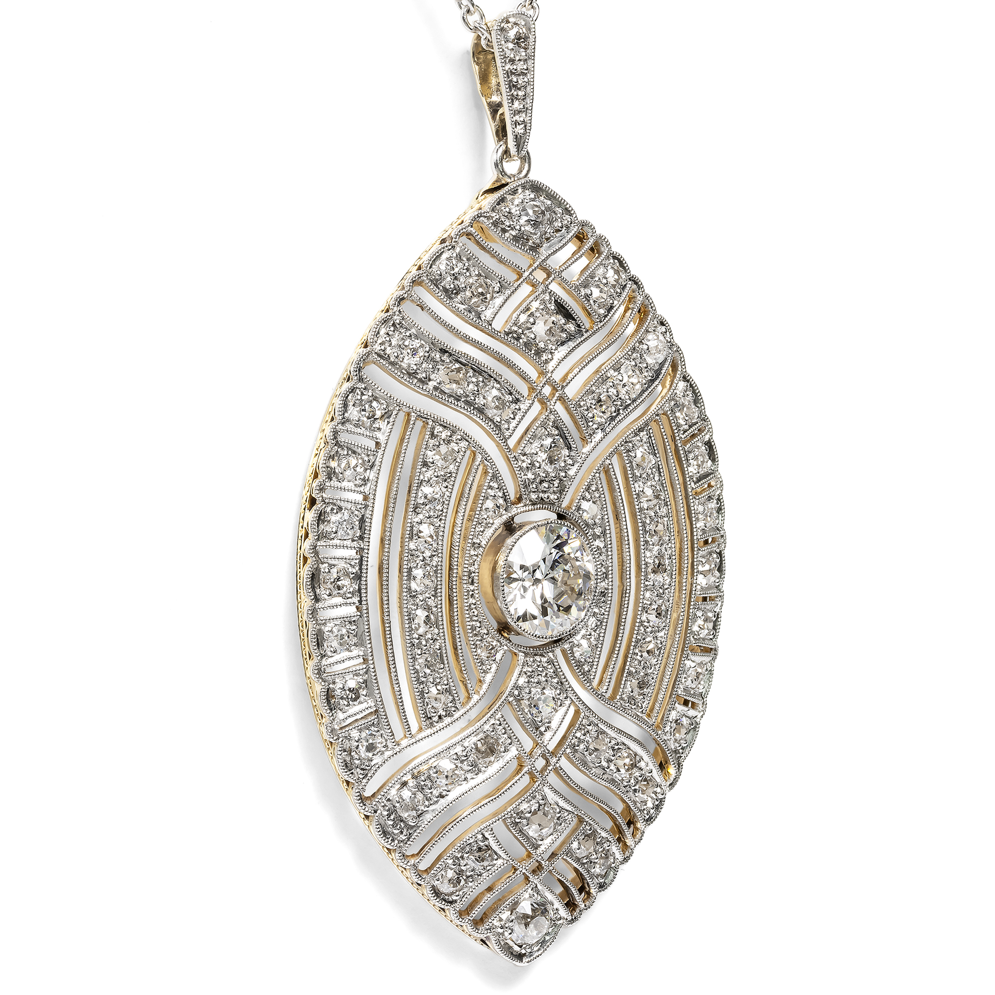 This precious pendant is a poem: a poem in praise of the beauty of geometry. Interwoven strips of diamonds in platinum are set in a pointed oval. The result is as fine as lace, with shadow gaps and milgrains structuring the surface. The fine curve of the surface is as soft as fabric, the work curves from the edge first to the front, then to the back, and finally a precious, large old European cut diamond sparkles and shines in the center of the design. The absence of any historical ornamentation demonstrates the modernity of the design. Instead of repeatedly drawing on the shapes of the past, the designers of the 1920s were looking for new forms. Geometric, clear lines, light colours, preferably white: the jewellery of this time of new beginnings after the upheavals of the First World War was to glow in the night like the new electricity that was being introduced everywhere. It should be luxurious, like a life just freed from the hardships of the crisis. And simple, without worries. This piece of jewellery speaks exactly this language. It appears simple and clear, yet is luxurious and well thought out and designed down to the last detail. In addition to the preciousness of the setting - the central diamond of around 1.10 ct shines white, without tinting, and is very pure (vsi) - we were particularly impressed by the perfect workmanship of the piece. The pendant is a one-of-a-kind piece, made entirely by hand and yet so perfectly executed that it is as if the most modern technical processes had already been used. We discovered the piece of jewellery in Düsseldorf. It was most probably created in Central Europe. More recently, it was imported to the Netherlands, where it was hallmarked anew and the platinum chain was added to the pendant. An independent appraisal from Vienna accompanies the precious piece.