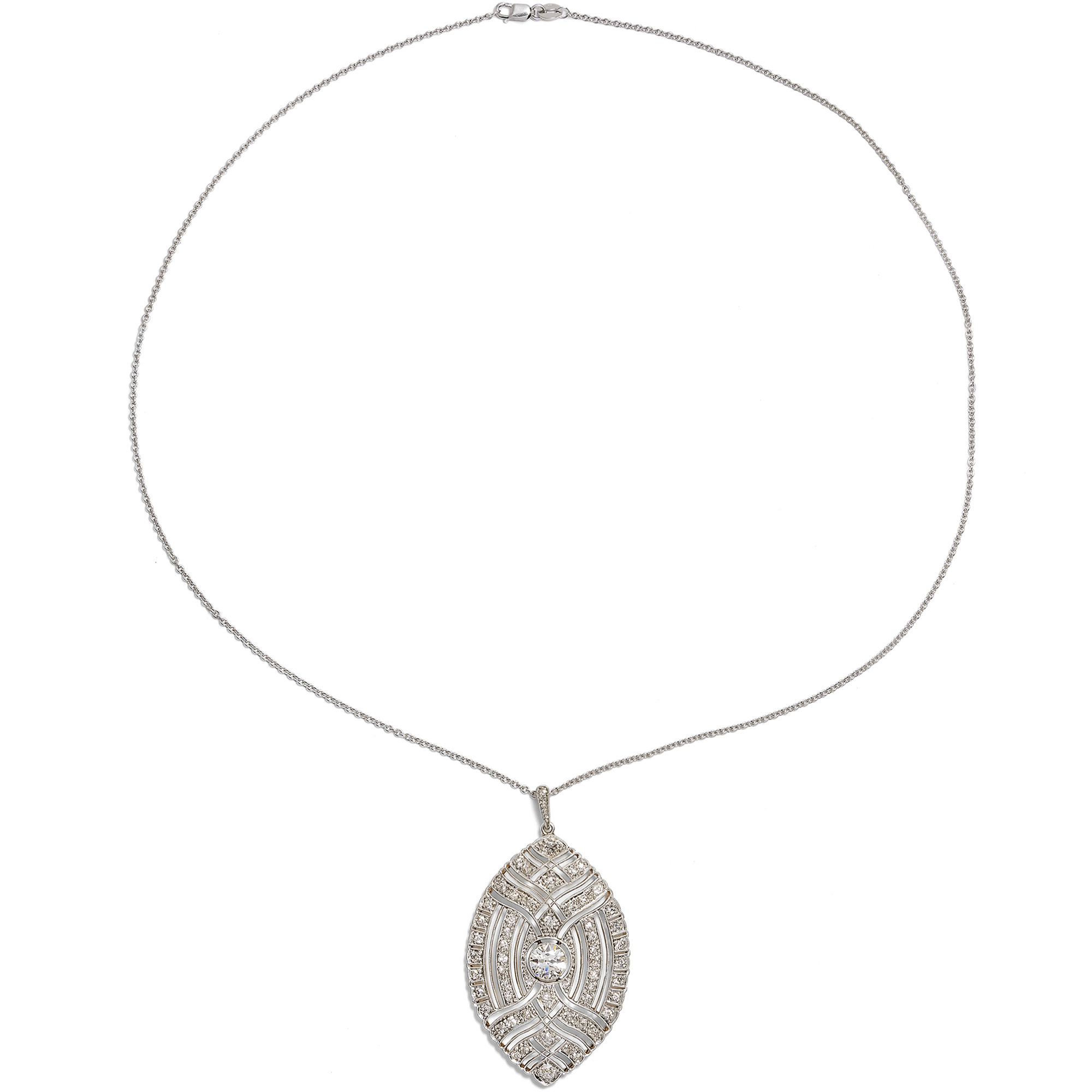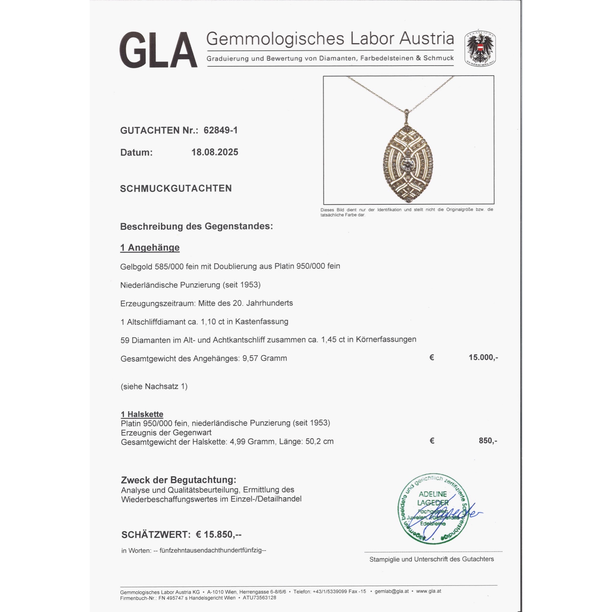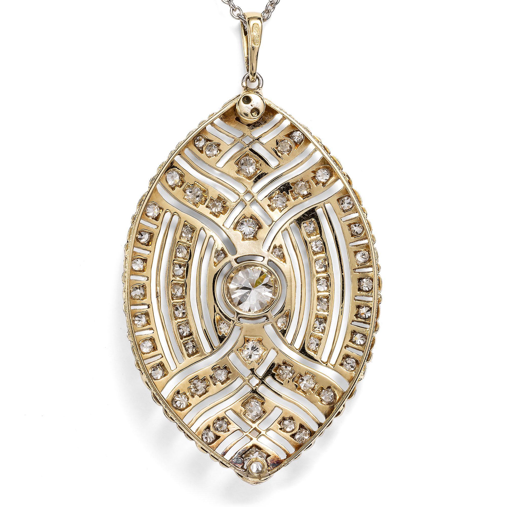 This precious pendant is a poem: a poem in praise of the beauty of geometry. Interwoven strips of diamonds in platinum are set in a pointed oval. The result is as fine as lace, with shadow gaps and milgrains structuring the surface. The fine curve of the surface is as soft as fabric, the work curves from the edge first to the front, then to the back, and finally a precious, large old European cut diamond sparkles and shines in the center of the design. The absence of any historical ornamentation demonstrates the modernity of the design. Instead of repeatedly drawing on the shapes of the past, the designers of the 1920s were looking for new forms. Geometric, clear lines, light colours, preferably white: the jewellery of this time of new beginnings after the upheavals of the First World War was to glow in the night like the new electricity that was being introduced everywhere. It should be luxurious, like a life just freed from the hardships of the crisis. And simple, without worries. This piece of jewellery speaks exactly this language. It appears simple and clear, yet is luxurious and well thought out and designed down to the last detail. In addition to the preciousness of the setting - the central diamond of around 1.10 ct shines white, without tinting, and is very pure (vsi) - we were particularly impressed by the perfect workmanship of the piece. The pendant is a one-of-a-kind piece, made entirely by hand and yet so perfectly executed that it is as if the most modern technical processes had already been used. We discovered the piece of jewellery in Düsseldorf. It was most probably created in Central Europe. More recently, it was imported to the Netherlands, where it was hallmarked anew and the platinum chain was added to the pendant. An independent appraisal from Vienna accompanies the precious piece.