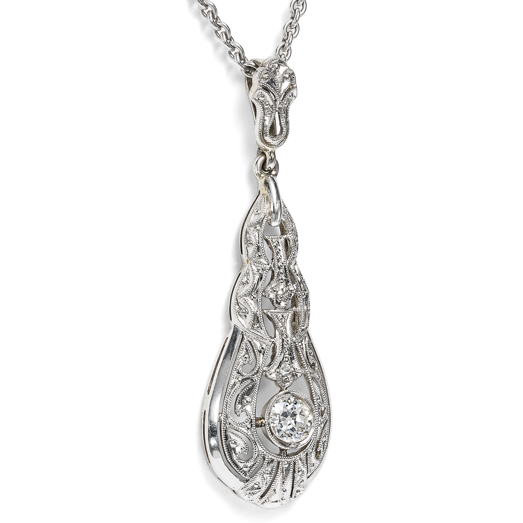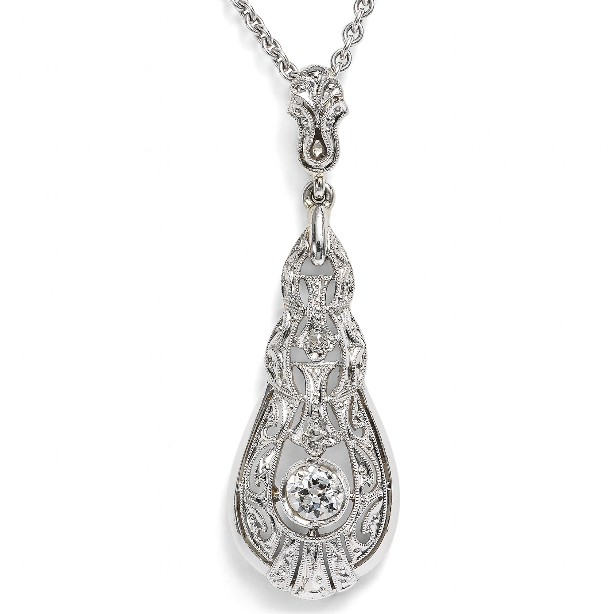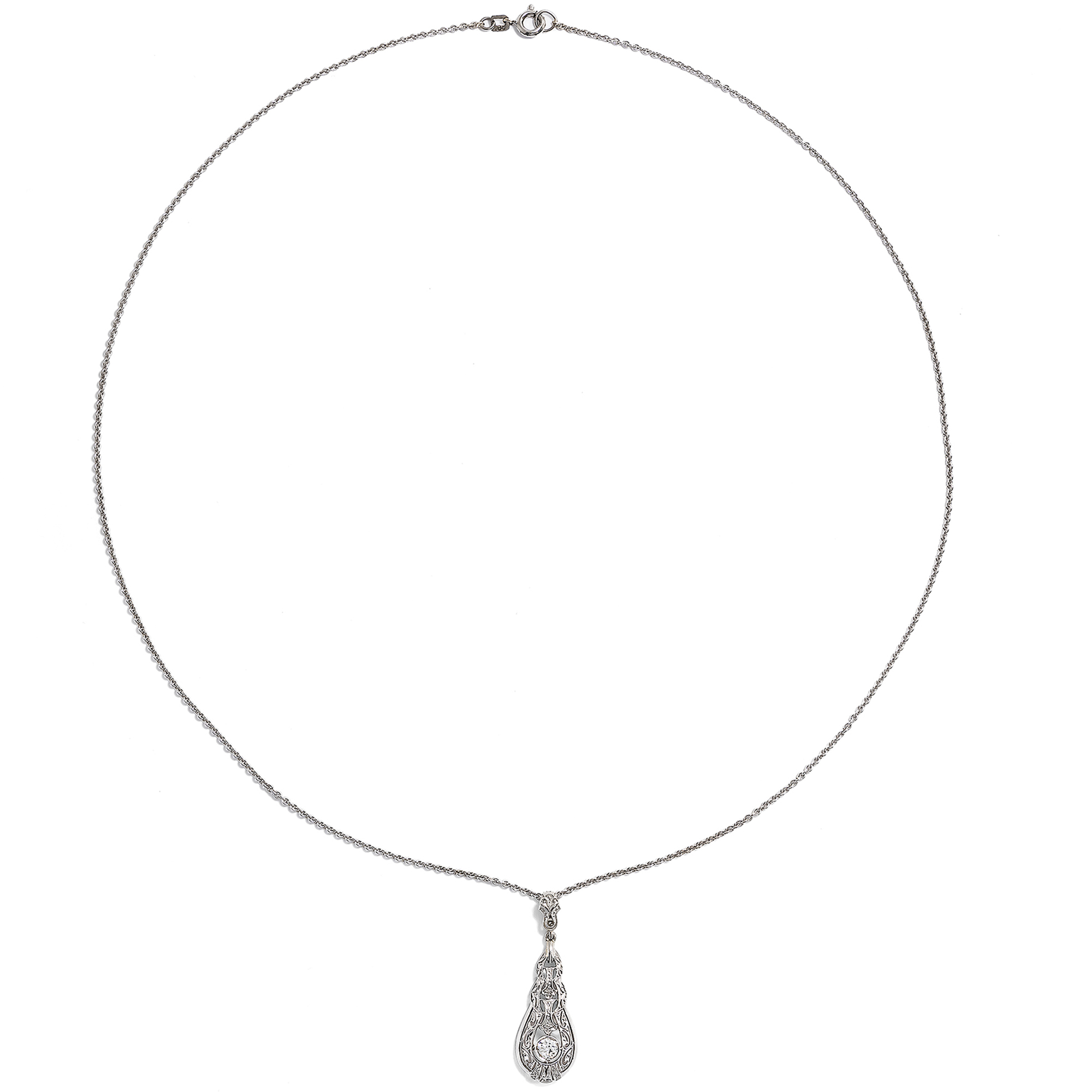 Cool elegance – this seems to have been the motto of Art Déco jewellery designers if one takes a look at the catalogues and fashion magazines of the time. Cool and crystalline, in the white light of platinum and diamonds, often in geometrically elongated shapes reminiscent of icicles: this is how we know the pendants, brooches and earrings of the era. This drop-shaped pendant corresponds to this ideal of undercooled, ethereal beauty. It is made in two parts. A slender pendulum is mounted beneath a finely openworked bail. Within a polished frame, it displays the finest milgrains and ornamental saw work. At the center of the design shines a single old European cut diamond of approximately 0.28 ct. Typical of the time, the pendant is crafted in platinum on white gold. This technique as well as the design and cut of the diamond testify to its creation around 1930. A matching white gold chain completes the necklace.
