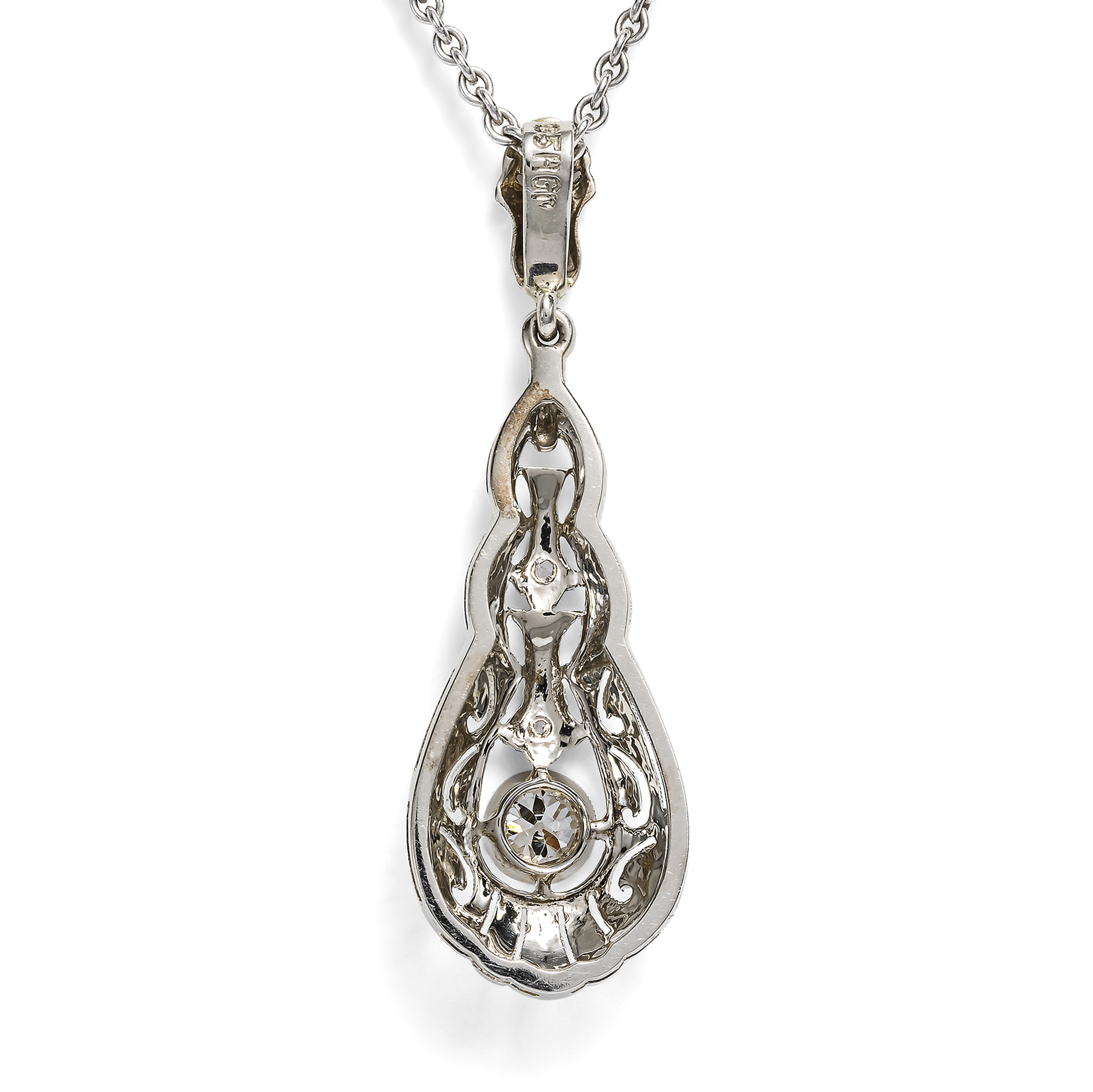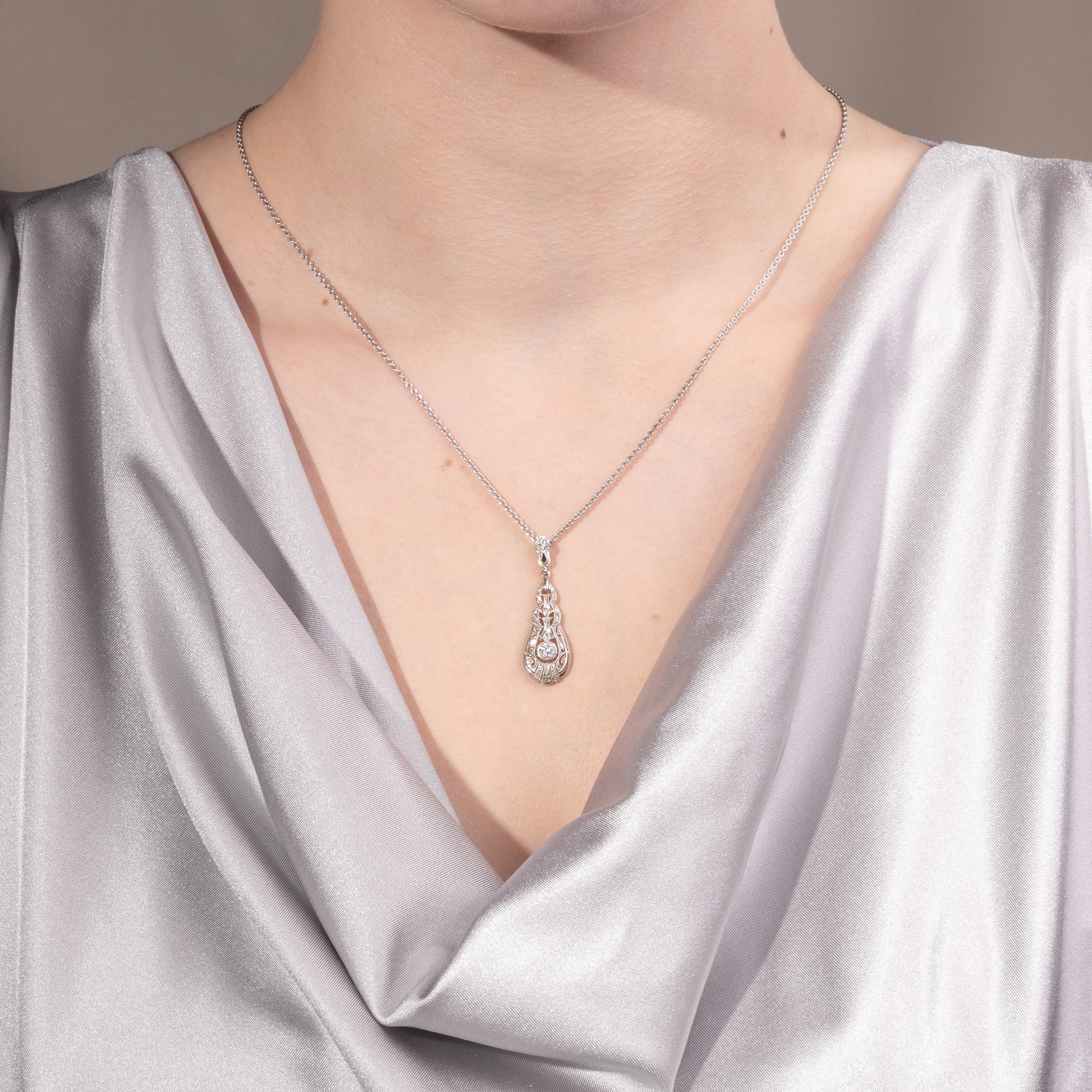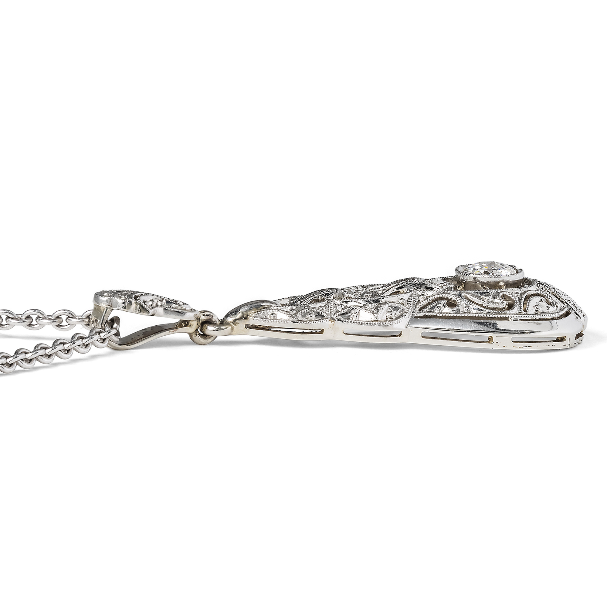 Cool elegance – this seems to have been the motto of Art Déco jewellery designers if one takes a look at the catalogues and fashion magazines of the time. Cool and crystalline, in the white light of platinum and diamonds, often in geometrically elongated shapes reminiscent of icicles: this is how we know the pendants, brooches and earrings of the era. This drop-shaped pendant corresponds to this ideal of undercooled, ethereal beauty. It is made in two parts. A slender pendulum is mounted beneath a finely openworked bail. Within a polished frame, it displays the finest milgrains and ornamental saw work. At the center of the design shines a single old European cut diamond of approximately 0.28 ct. Typical of the time, the pendant is crafted in platinum on white gold. This technique as well as the design and cut of the diamond testify to its creation around 1930. A matching white gold chain completes the necklace.