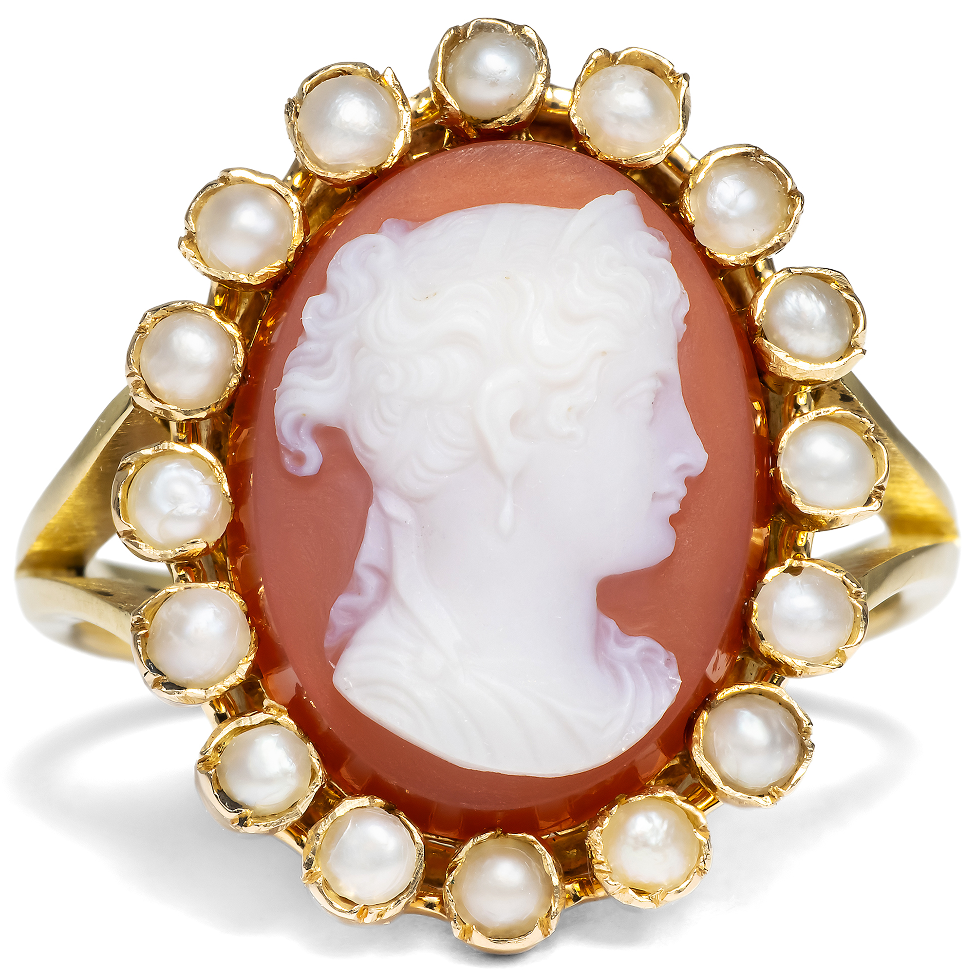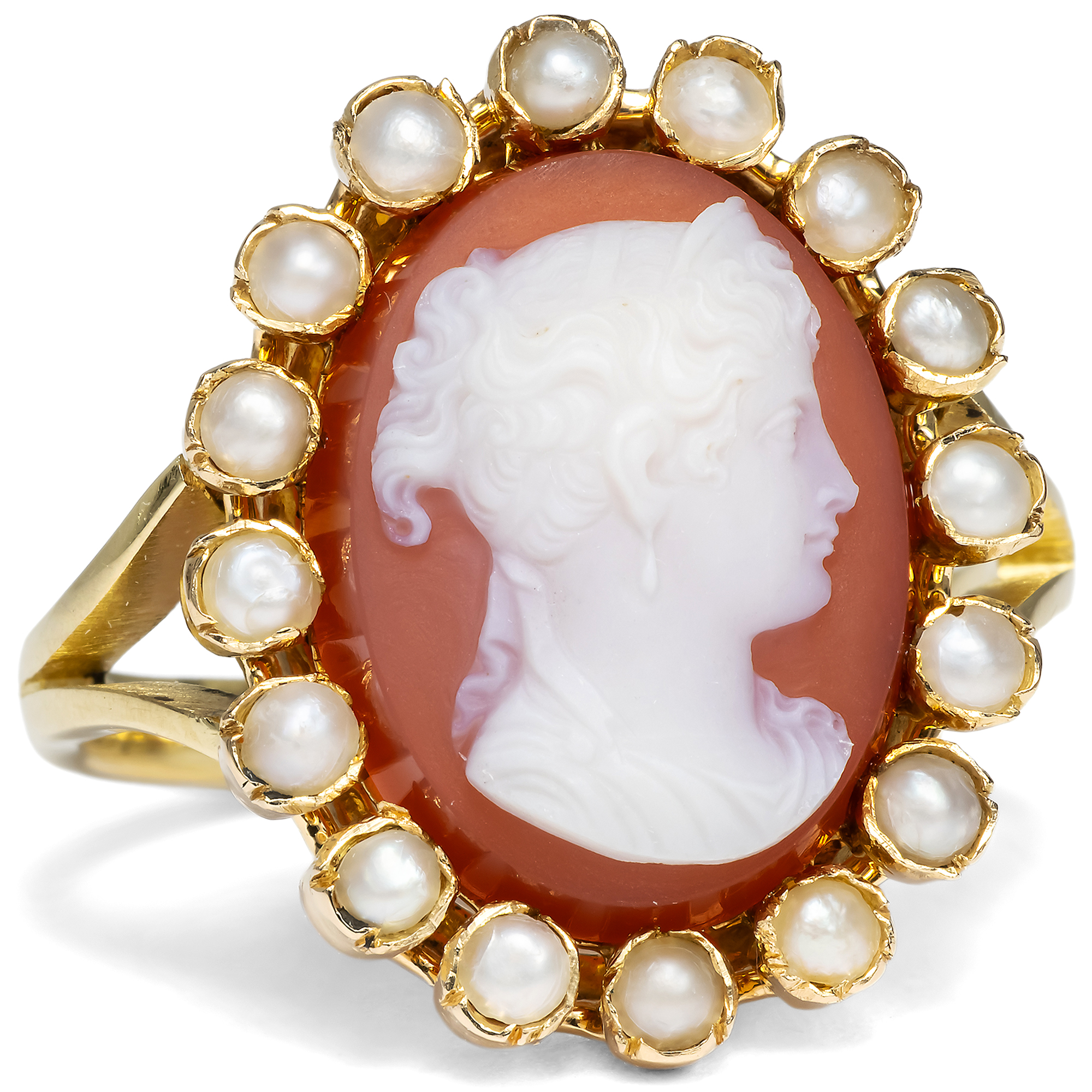 Ideals of beauty change over time. What was still desirable a few centuries ago sometimes no longer seems relevant today. In classicism, for example, a healthy complexion was a sign of abject poverty; only a pale complexion was considered beautiful. In the Baroque period, Peter Paul Rubens set the framework for the ideal of beauty of his era with his voluptuous portraits of women, while today the Western world strives for thinness. But as ideals change, so do the compliments. Today, the term "cow" is considered unflattering for a lady. In classical antiquity, the value of the dairy animal in relation to the fairer sex was completely different. One of the epithets of Hera, one of the most important goddesses in the Olympian heaven of gods, is "βοῶπις" (boopis), "the cow-eyed one". And that was meant as a compliment, because cows sometimes have really beautiful and, above all, big eyes! This ring shows a depiction of Hera in the medium of the cameo. Hera can be recognized by her diadem, the so-called Stepháne (Greek στεφάνη), which distinguishes her as a married woman. On our cameo, we see Hera in profile to the right. She is wearing an antique garment, the peplos, which shows us the fashion of antiquity. The beautiful setting of finely crafted gold is set with shimmering pearls. It was created together with the cameo around 1870, probably as one of two earrings. The ring band was added at a later date, turning the cameo into a ring. This beautiful ring came to us from Switzerland.