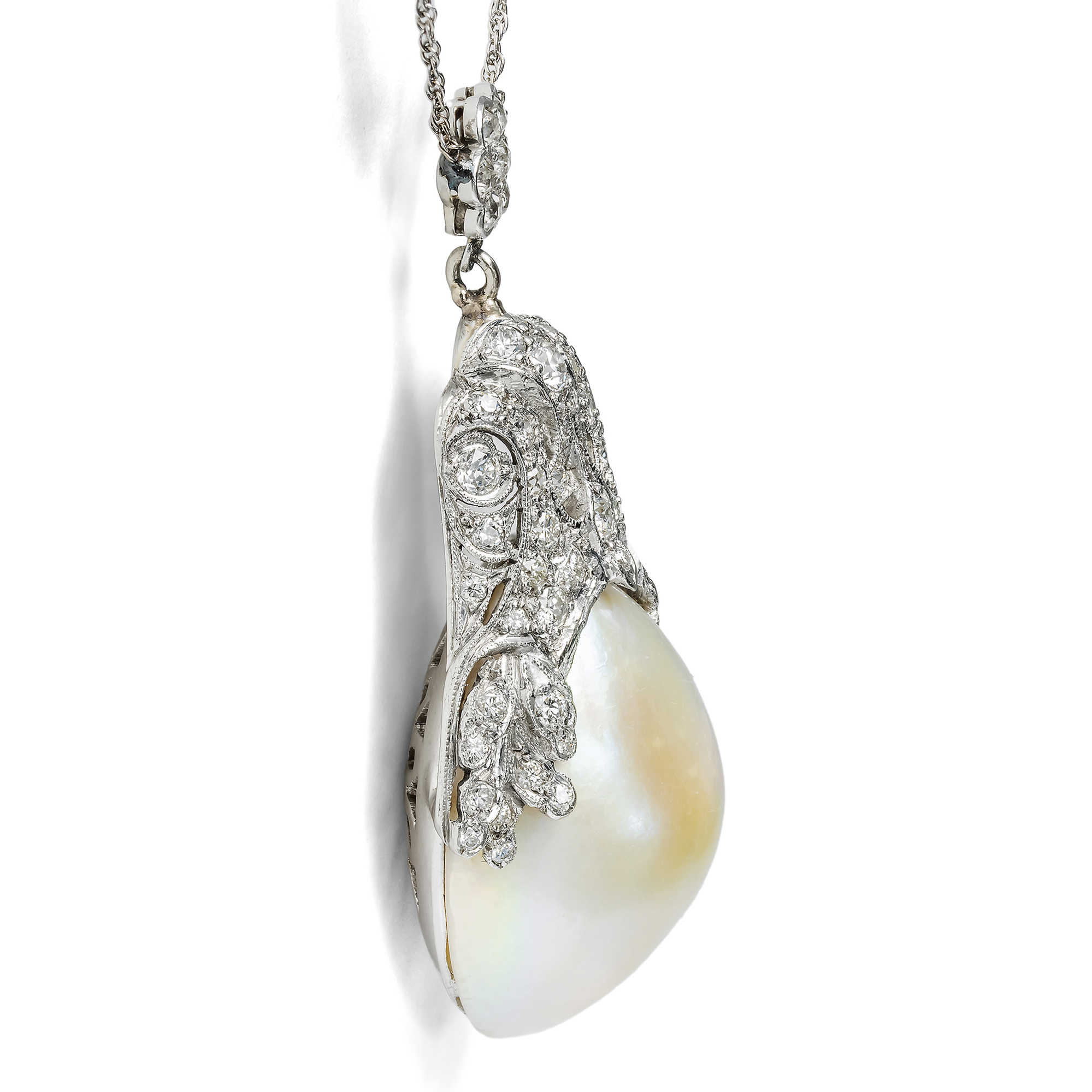 This necklace glows, shines and shimmers in endless variations on a theme: the non-color white. More than 50 sparkling diamonds set a large, sculpturally designed cartouche made of platinum. Small leaves and flowers are staggered in a symmetrical design and embrace a large, warm white shimmering mabé pearl. A fine white gold chain turns the piece into a necklace, with a small diamond-studded flower mediating between the chain and pendant. Mabé pearls are a special type of cultured pearl that have been known in East Asia since the 13th century. They are also known as cultured shell pearls or cultured blister pearls. Their name is derived from the Japanese name of the winged louse (Pteria penguin) Mabe-gai, which is good for cultivating shell pearls but not for cultivating full pearls. In contrast to round cultured pearls, which develop in the connective tissue in the middle of the mussel, small hemispheres made of glass or mother-of-pearl are inserted between the shell and the mantle to cultivate mabe pearls. After a short time, they grow firm and are coated with a shimmering layer of pearl substance. Mabé pearls were very fashionable in the 1980s, adorning large, round clip earrings. However, this mabé pearl is older. We date the pendant with its fine, hand-worked ornaments and transitional-cut diamonds to around 1930. Unlike later mabé pearls, the pearl in this pendant is not cool white, but has a fascinating creamy hue that is enlivened by a rich, iridescent overlay in purple and green. The piece was probably originally created as a typical Art Deco clip brooch. The small flower and chain were added later, turning the brooch into a pendant. We think it was a good idea, because the result is coherent and convincing. An independent expert opinion has confirmed the quality of the materials. materials. It is enclosed with the necklace.