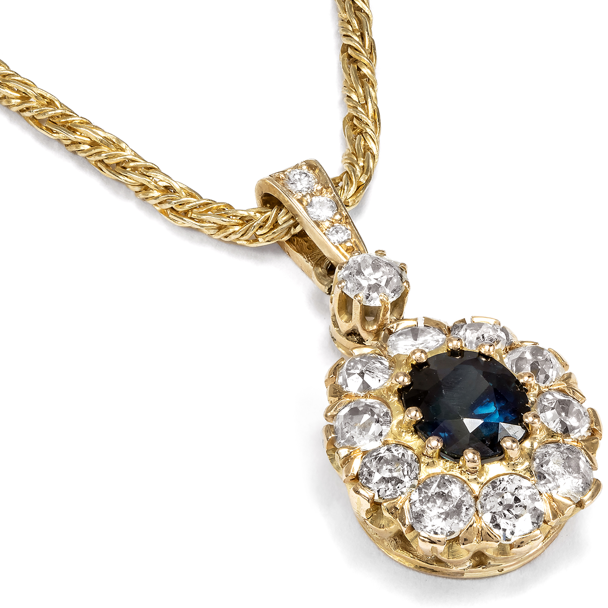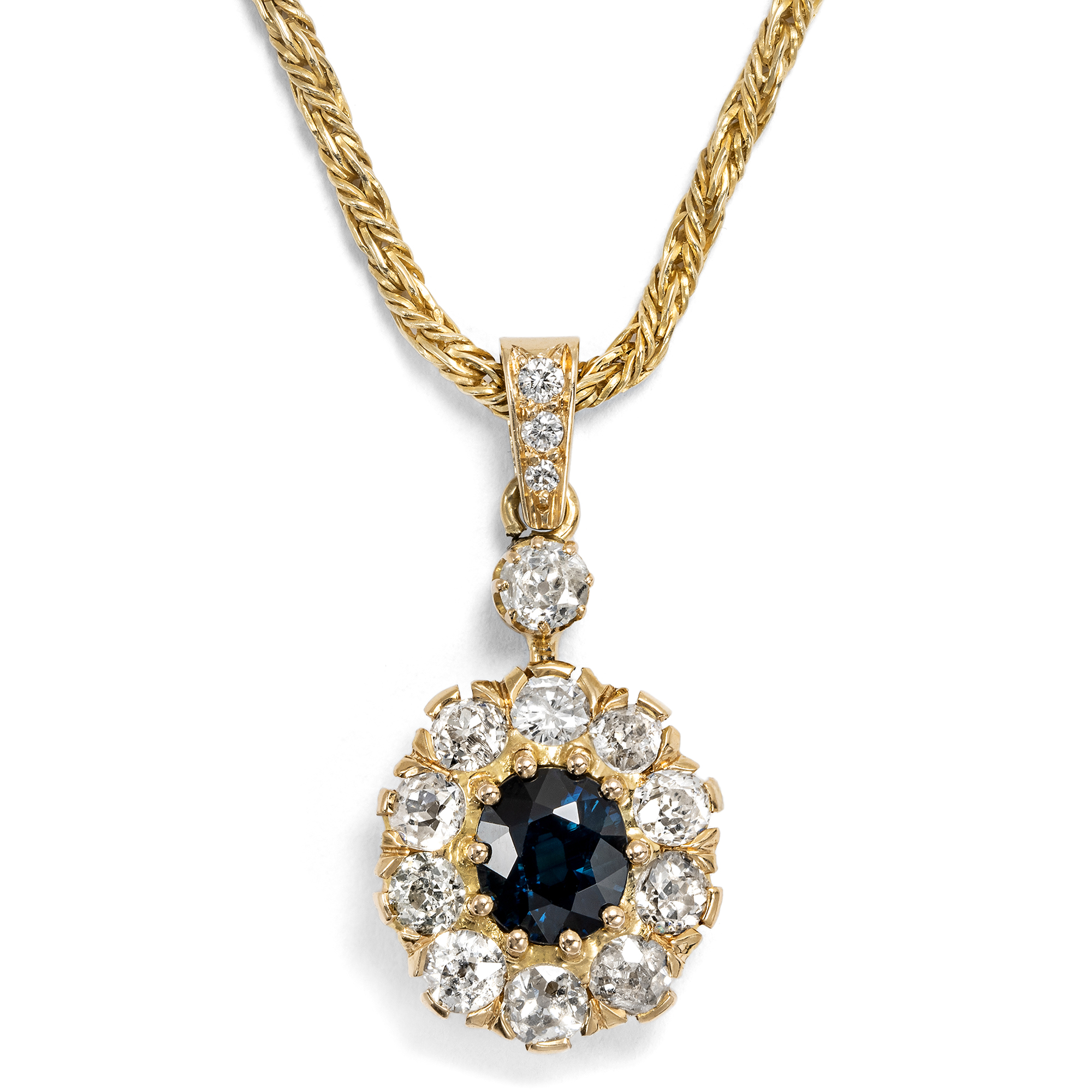 This pendant with its golden, warm light reminded us of a cozy evening in front of the fireplace - of warming embers and at the same time, outside the window, a starry, cool night. The design of the pendant is classic. It follows the so-called "entourage" type, in which a ring of diamonds surrounds a coloured gemstone. The diamonds form the "entourage", the entourage of the center stone: like so many terms from the history of jewellery, this one also comes from France. Here, softly sparkling old European cut diamonds frame a dark blue sapphire. All stones are set in gold. At the top, another diamond and a loop with brilliant-cut diamonds connect to the chain. This has an unusual, knitted pattern. As a result, it flows very softly and is very comfortable to wear. We discovered the pendant with its chain here in Berlin. The pendant was probably originally created as one of two earrings in the years shortly before 1900. More recently, the earring became the pendant when the loop with the diamonds was added at the top. An independent expert appraisal on the materials is included with the pieces of jewellery.