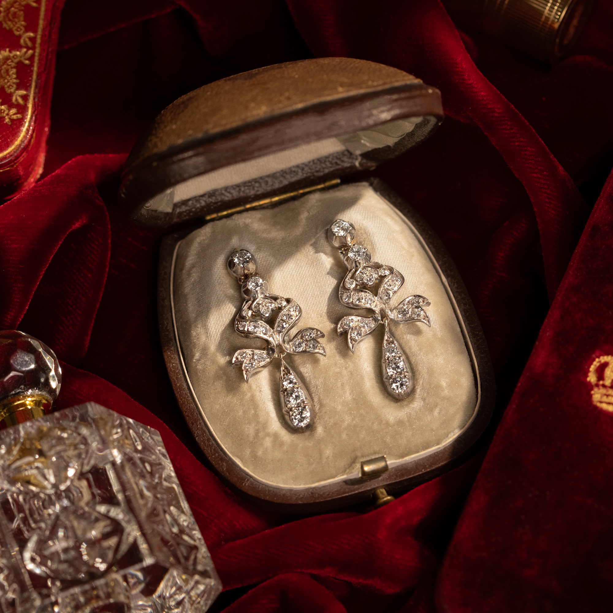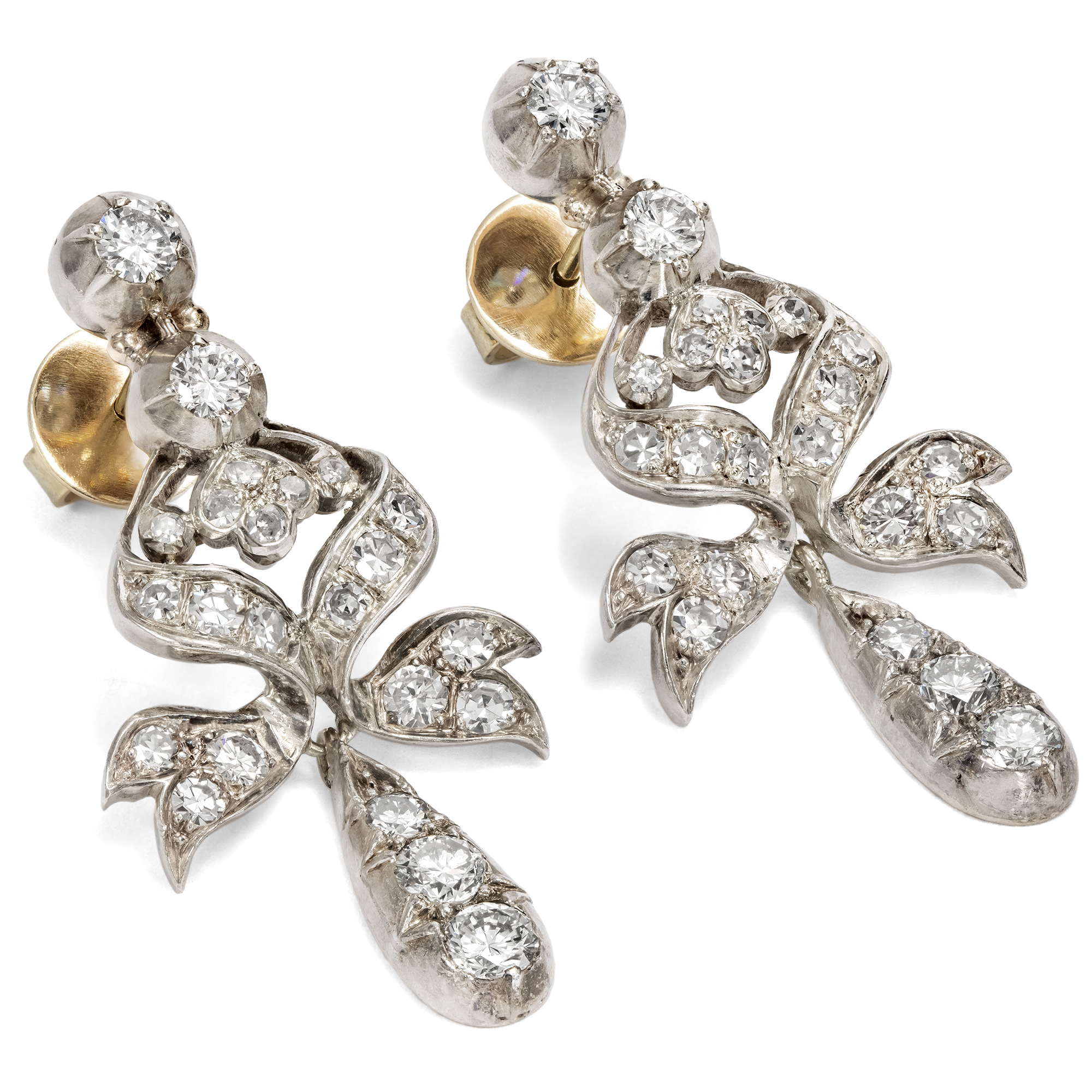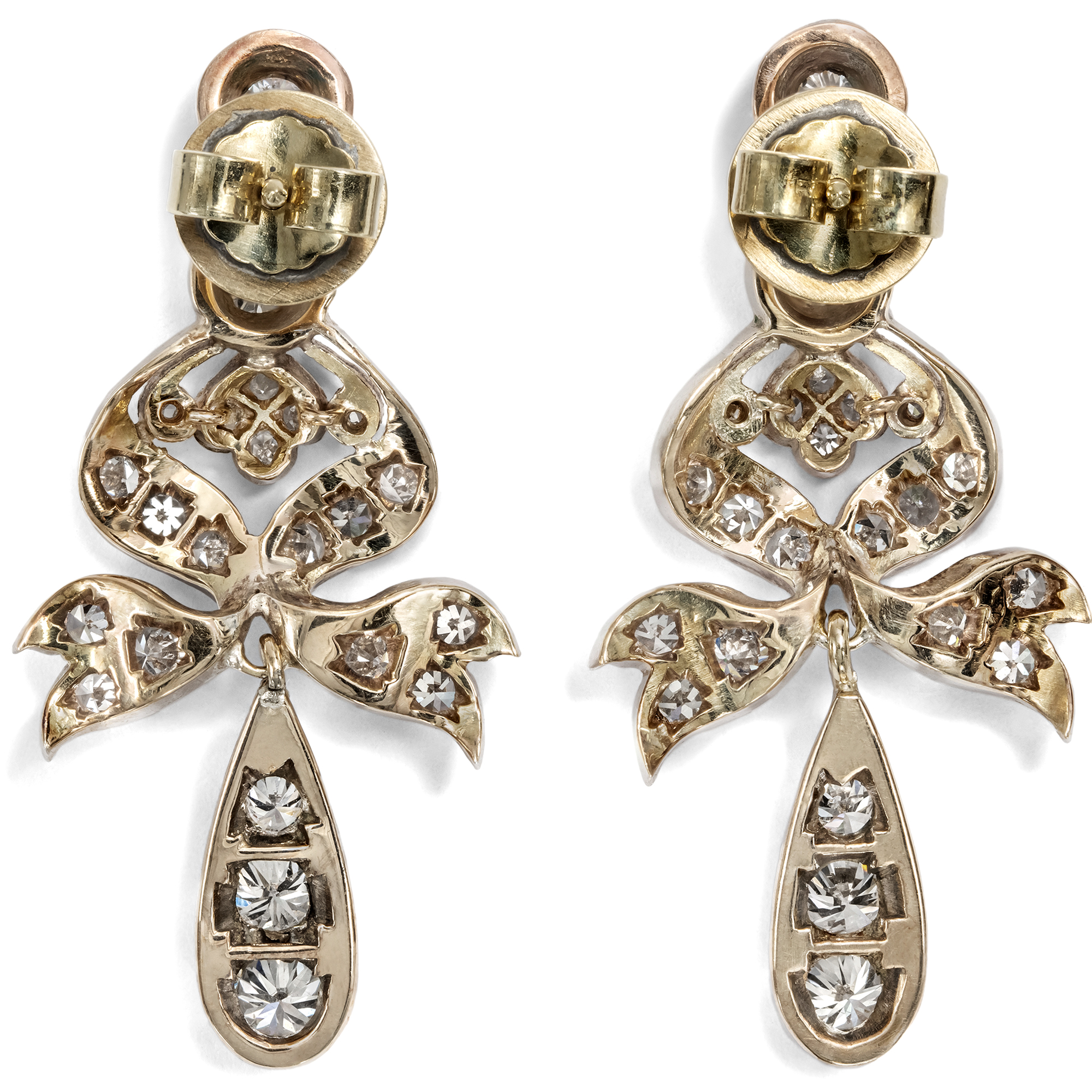 This pair of earrings corresponds to the type of pendeloque earring that first came into fashion in the 18th century. This type of earring is characterized by a stylized ribbon bow motif with a pendulum suspended below. This gallant fashion found new popularity in the c. 1900s. In the glow of electric light bulbs at the grand balls in Vienna, Paris and London, the ladies' white jewels shone brightly, their shapes often inspired by the courtly life of the previous century. These earrings are designed in this style, made of silver on a gold back. A total of around two carats of diamonds sparkle in the settings. They show modern cuts and therefore also a modern, very good brilliance. The stones are white to slightly warm-toned, which goes very well with the warm shine of the silver. The workmanship of the metals and the design language show that the earrings were created in the c. 1900s. The cuts of the diamonds, however, are cuts from the second half of the 20th century. They were therefore not set into the diamonds until later. We therefore assume that our earrings were once set with glass stones, so-called paste. The great demand for diamond jewellery and the rapidly changing fashions had made imitation diamonds such as clear paste stones socially acceptable at the turn of the century, and they were also set in silver and gold. However, glass is naturally neither as durable nor as precious as diamonds, so a previous owner probably decided to give the earrings a longer life due to their beautiful shape and design. We were able to discover the elegant pair as they are in Vienna. Even today, it tells of a legendary ball season...